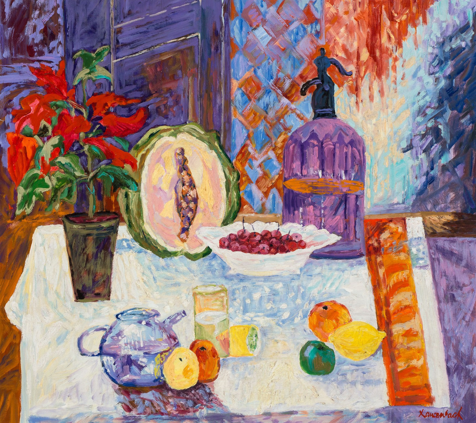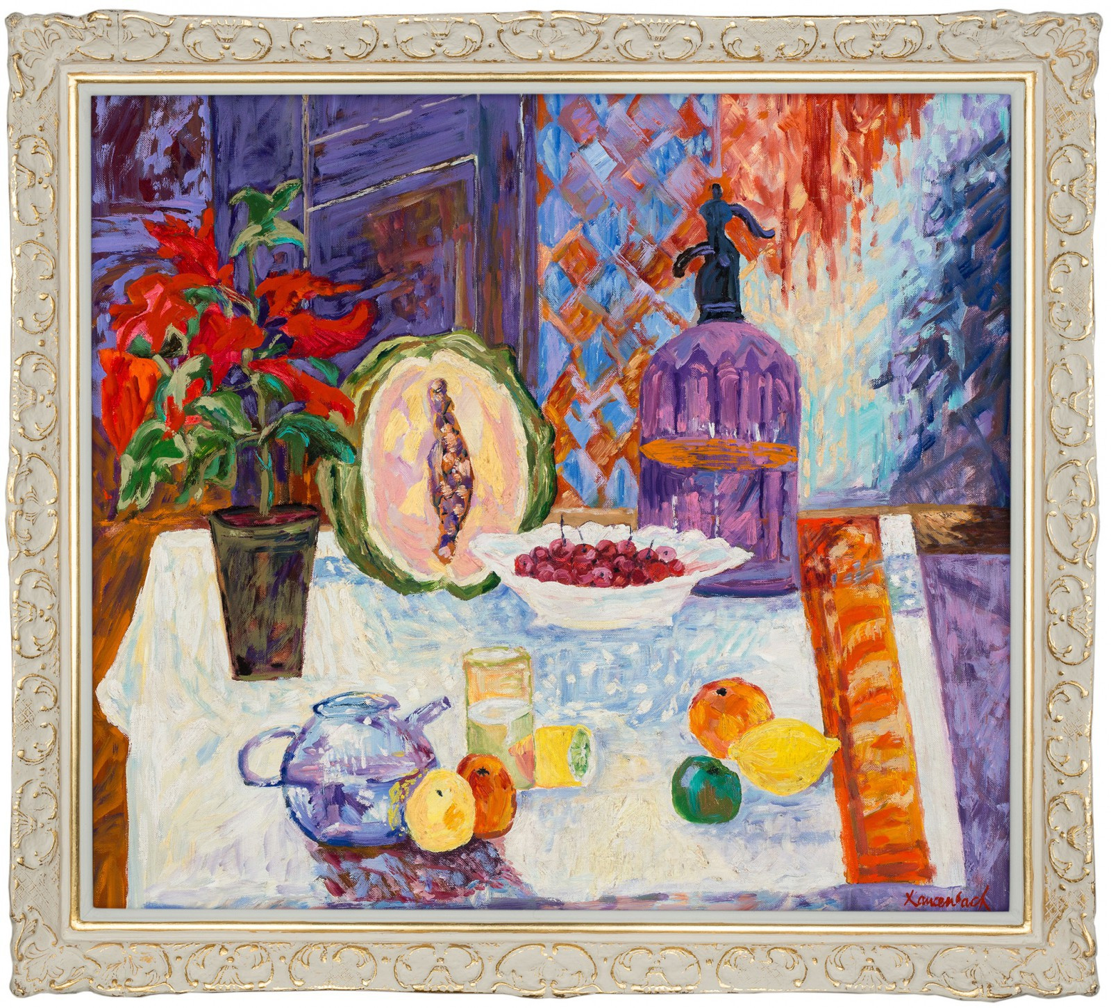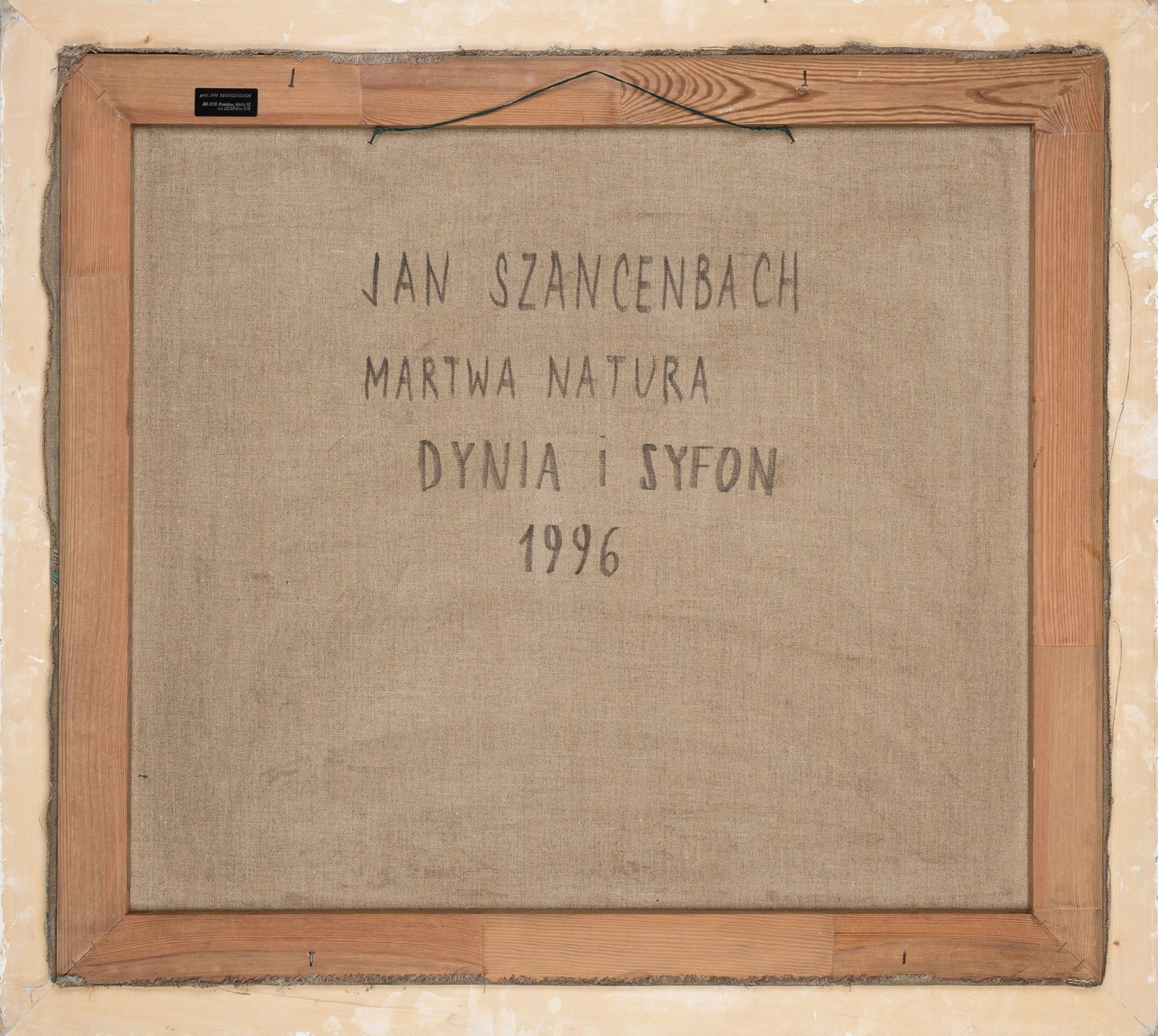 Na odwrocie autorski opis: JAN SZANCENBACH / MARTWA NATURA / DYNIA I SYFON / 1996″ oraz naklejka z pracowni artysty na krośnie.