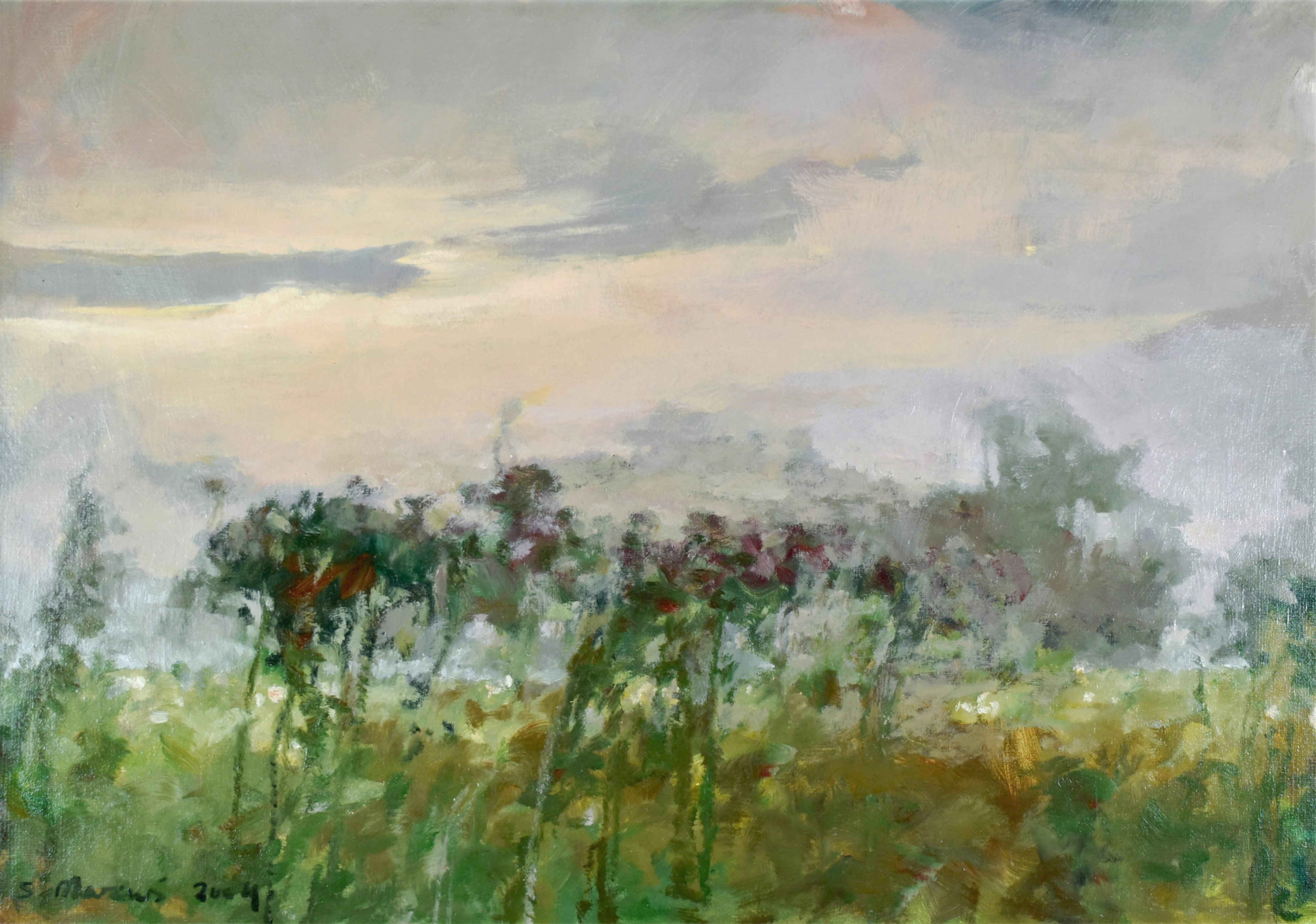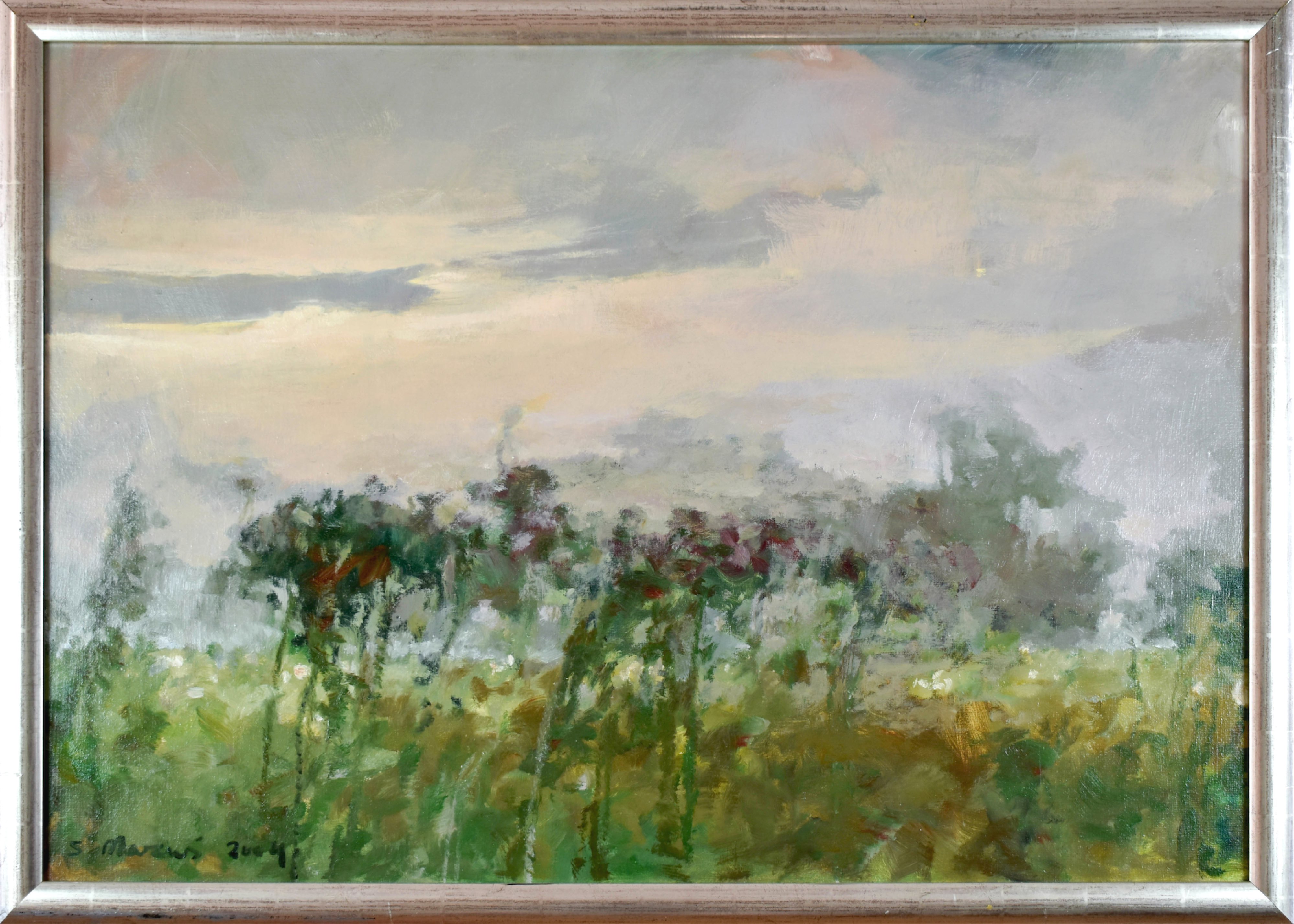 Na odwrocie na płótnie opis autorski: Stanisław MAZUŚ / „MGLISTY PORANEK” 2004 r. / 70 x 100 cm , olej, płótno / obraz 5041 oraz na krośnie naklejka autorska...