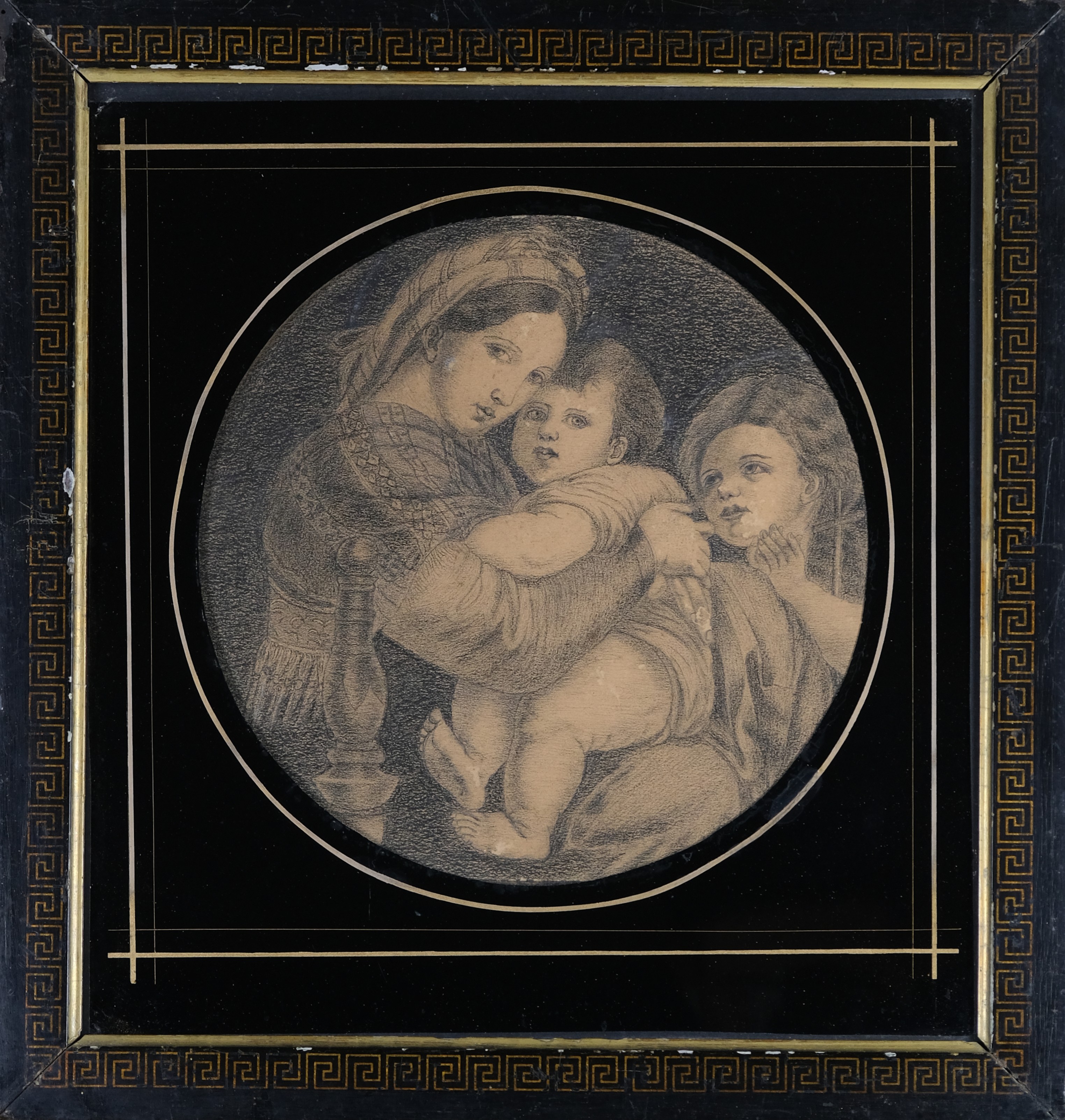 technika mieszana (kredka, pastel), papier, średnica: 22 cm, w oprawie: 37,5 x 36 cm,