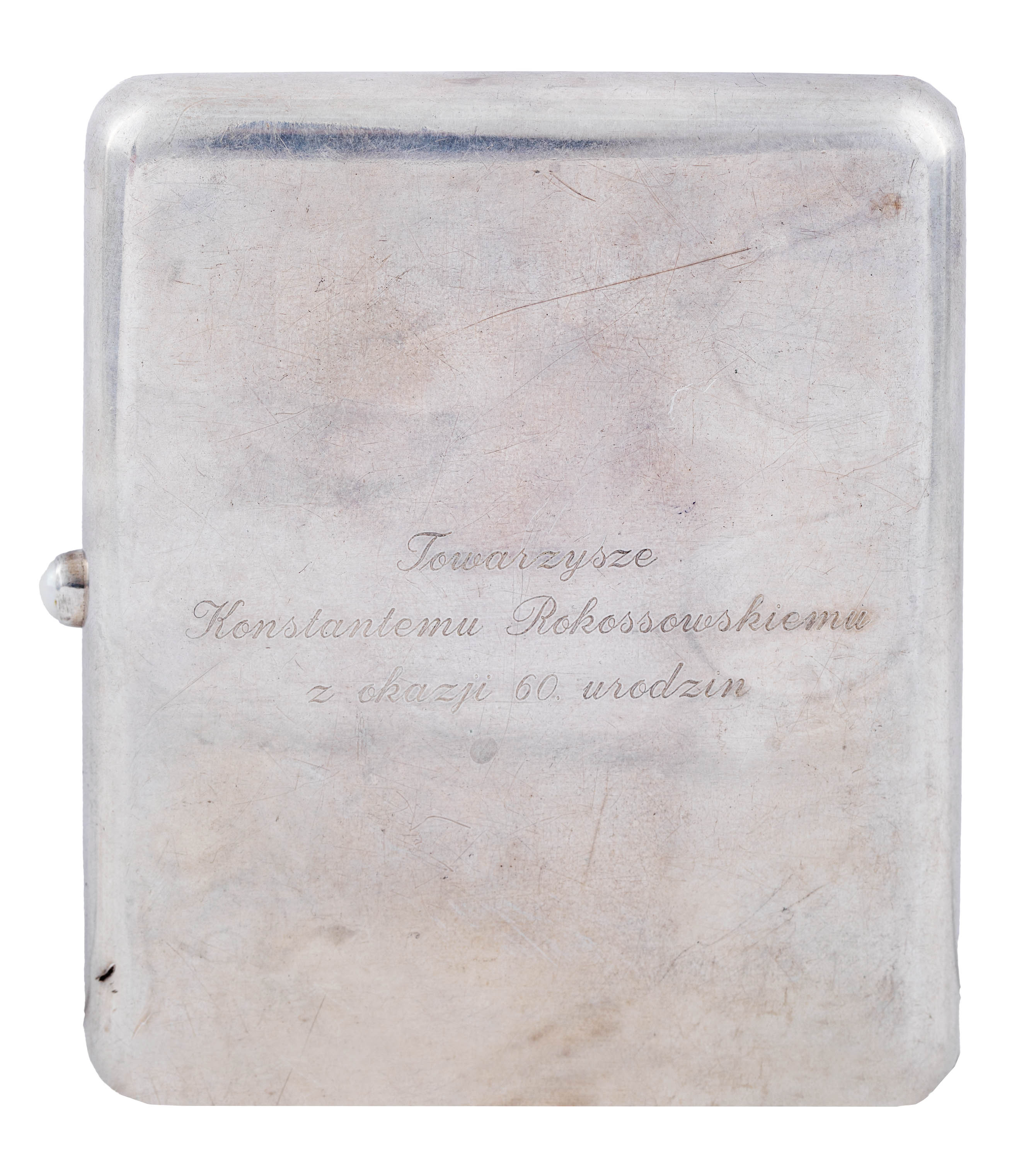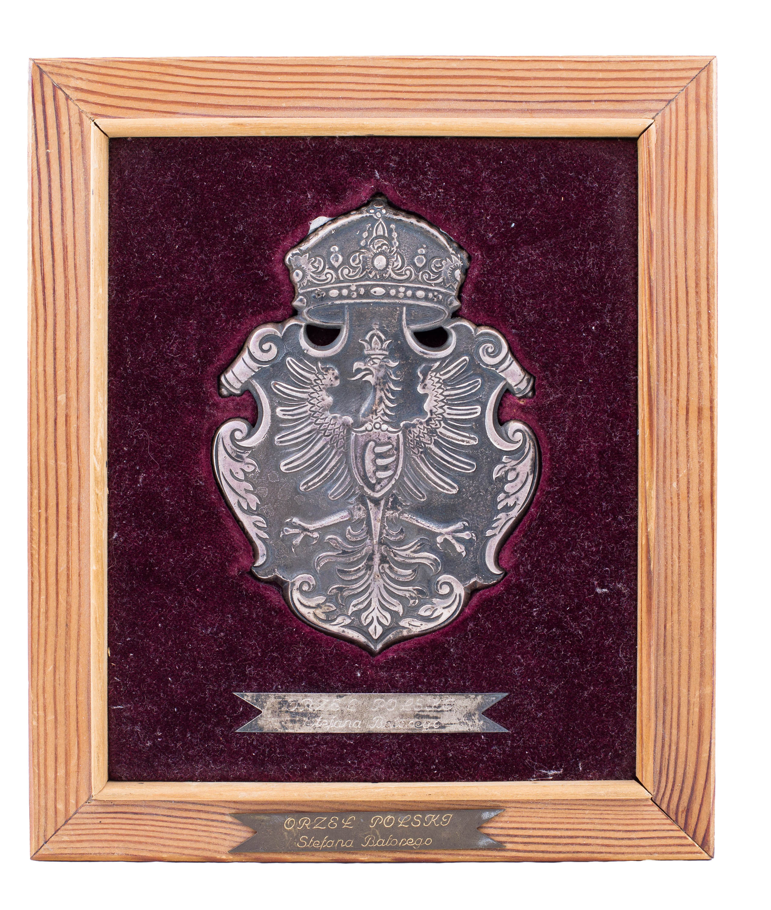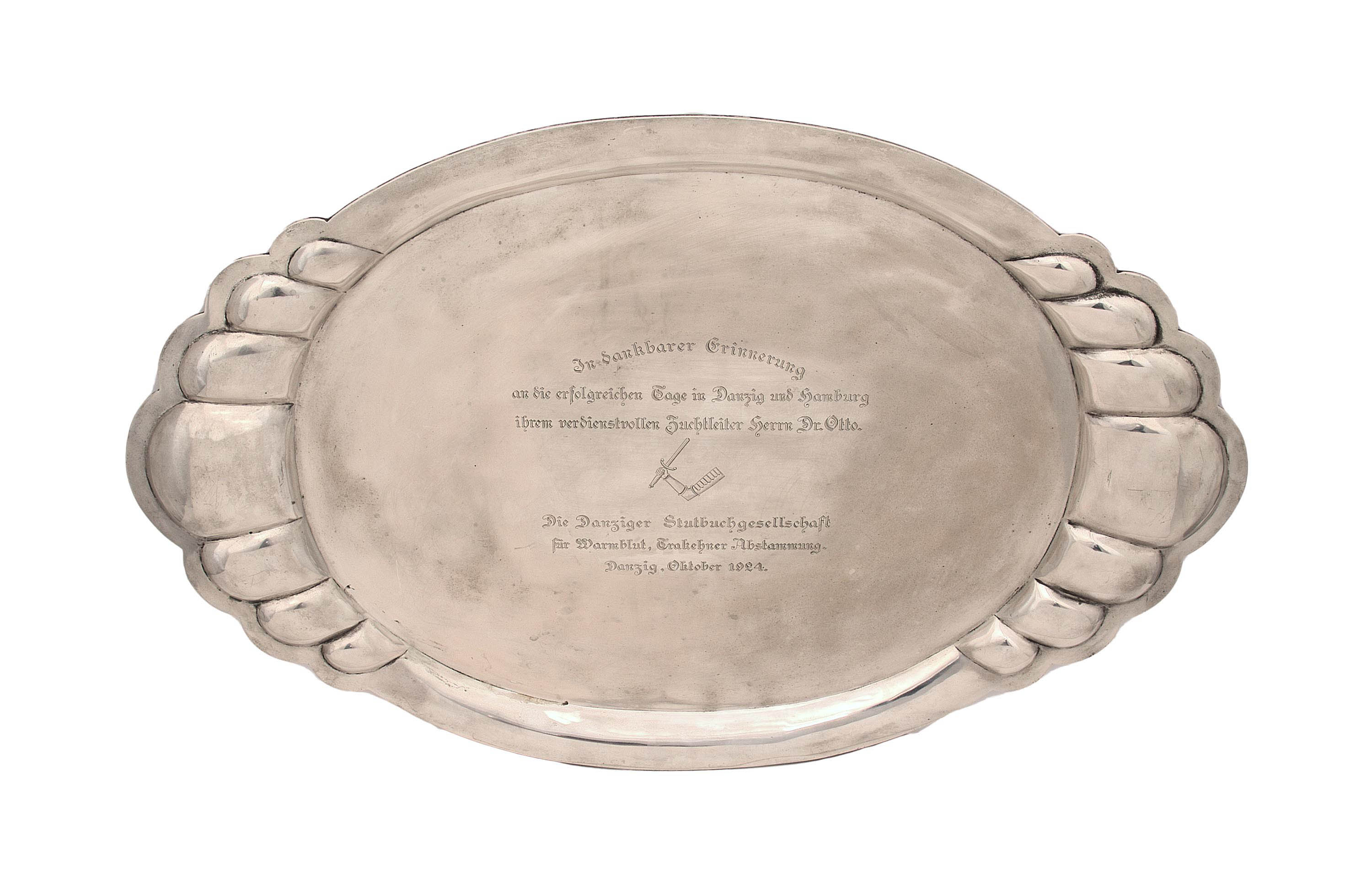 srebro pr. 800, m. 3000 g, na spodzie znak wytwórni: M. MORITZ & SOHN/DANZIG; w lustrze dedykacja w języku niemieckim z datą „Danzig Oktober 1924”; wym. 75 × 46,5 cm