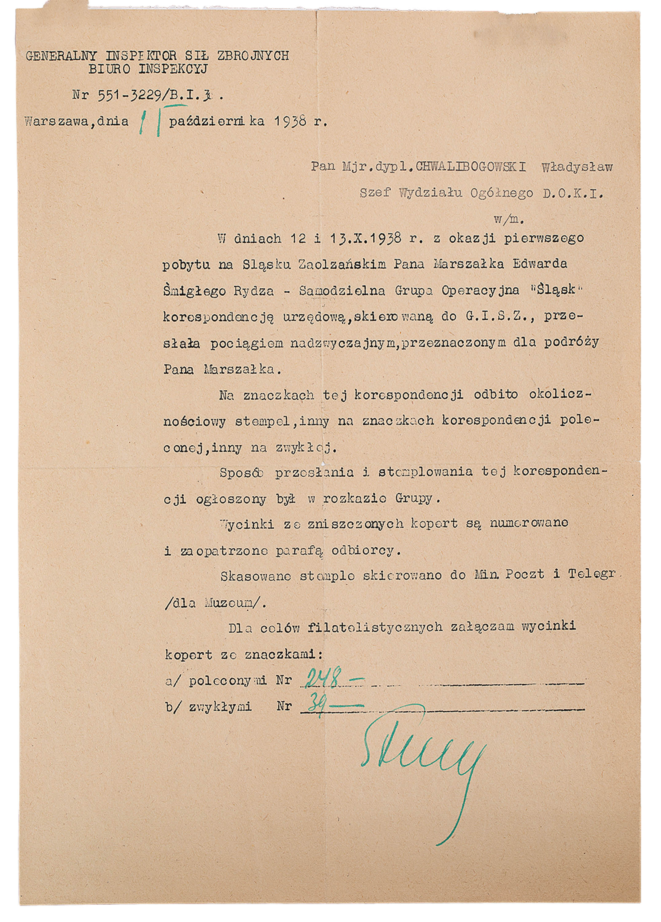 Oryginalny dokument Generalnego Inspektora Sił Zbrojnych z dn. 11.10.1938.