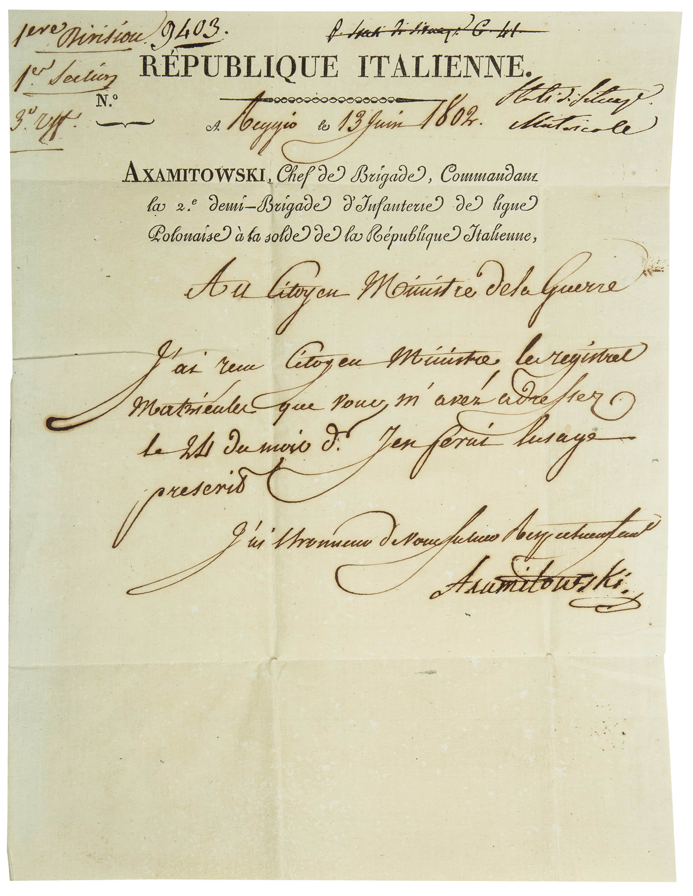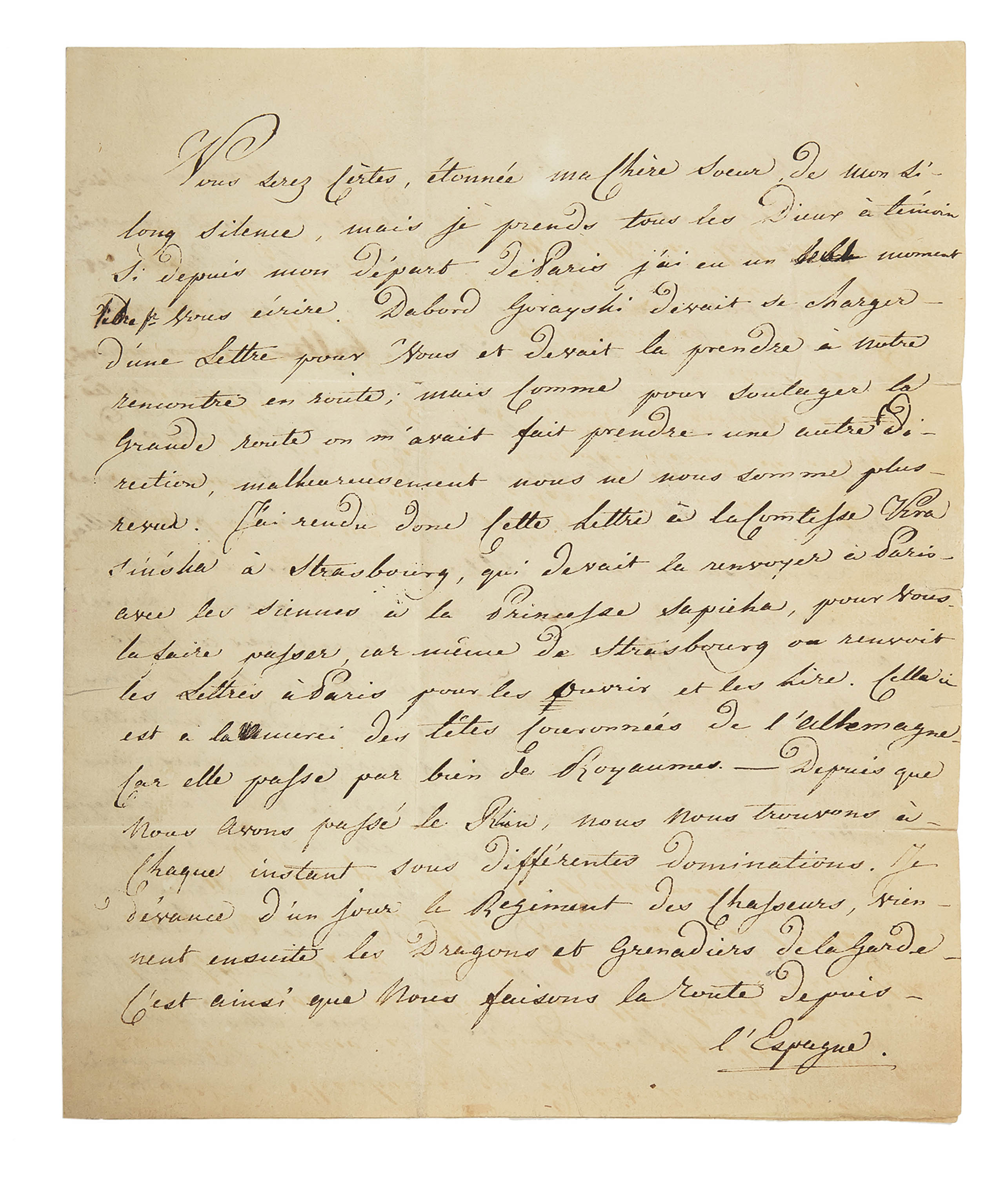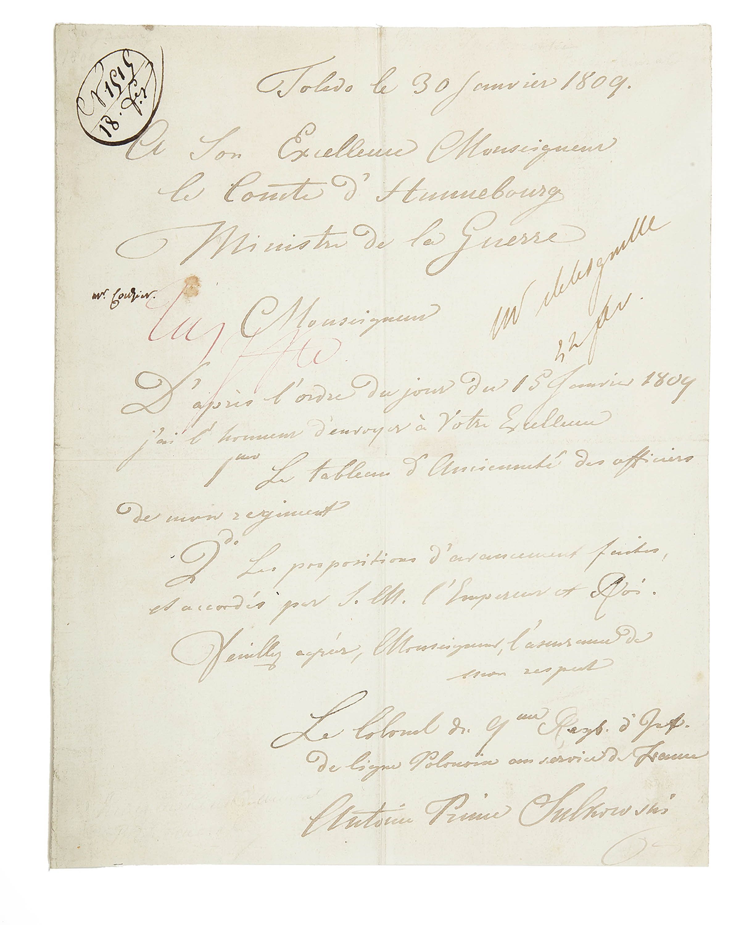 Zbiór 25 dokumentów z lat 1808–1812, z czasu działań Grande Armée w Hiszpanii, w kampanii pruskiej i polskiej, wojnie z Austrią oraz kampanii rosyjskiej. W korespondencji m.in. list księcia Antoniego Sułkowskiego do Ministra...