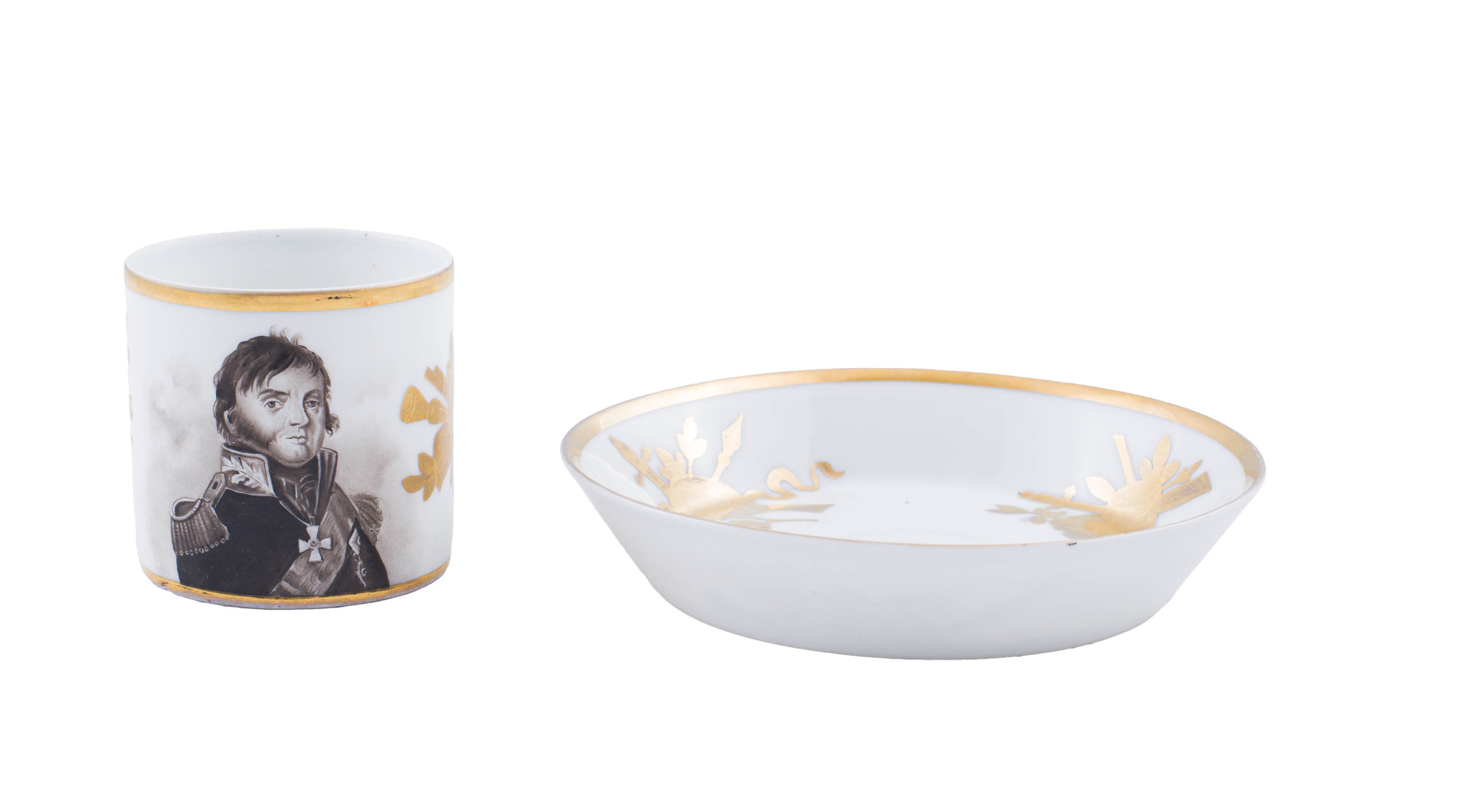 porcelana szkliwiona, malatura, złocenia, wys. filiżanki 6 cm, śred. spodka 13,2 cm