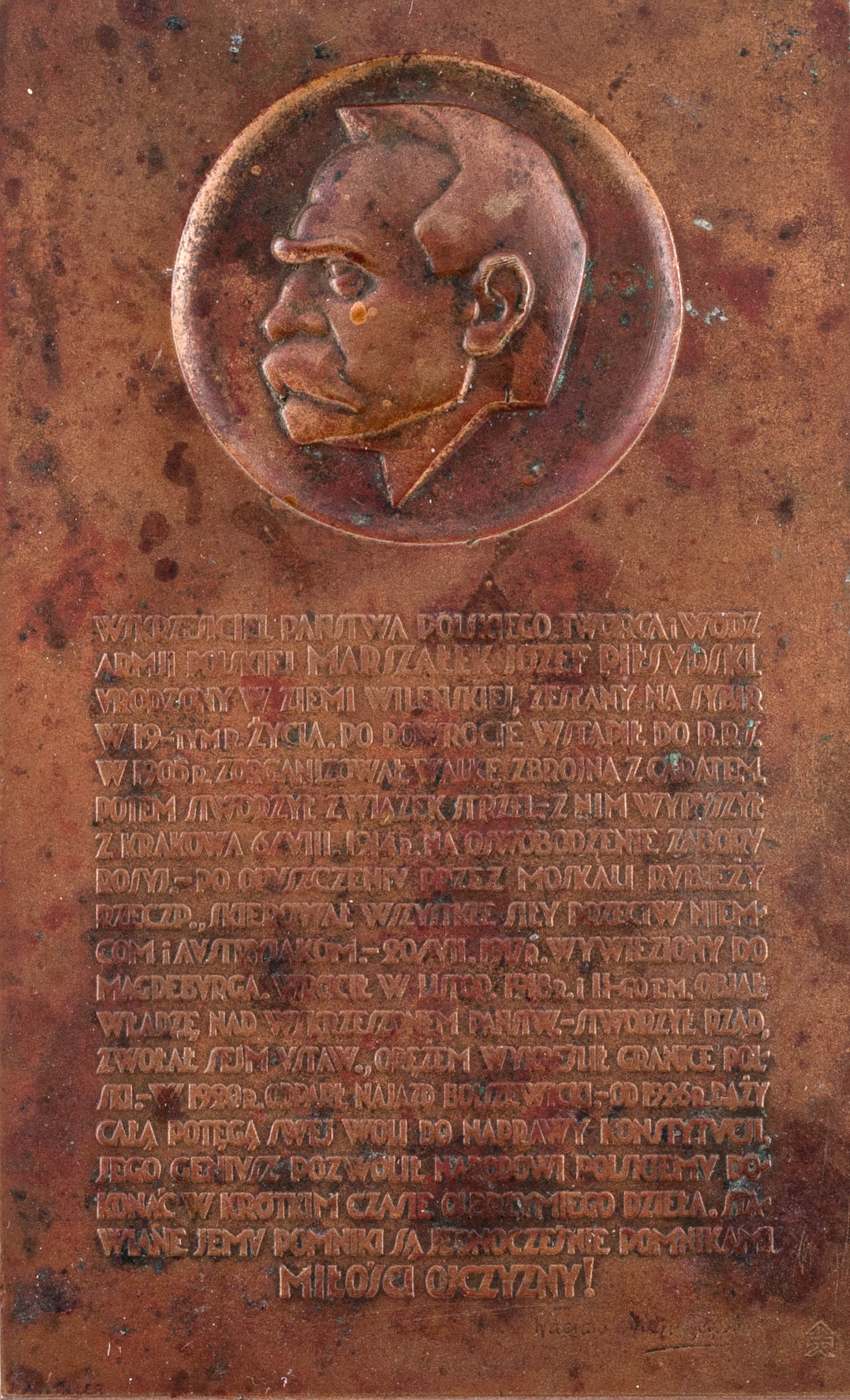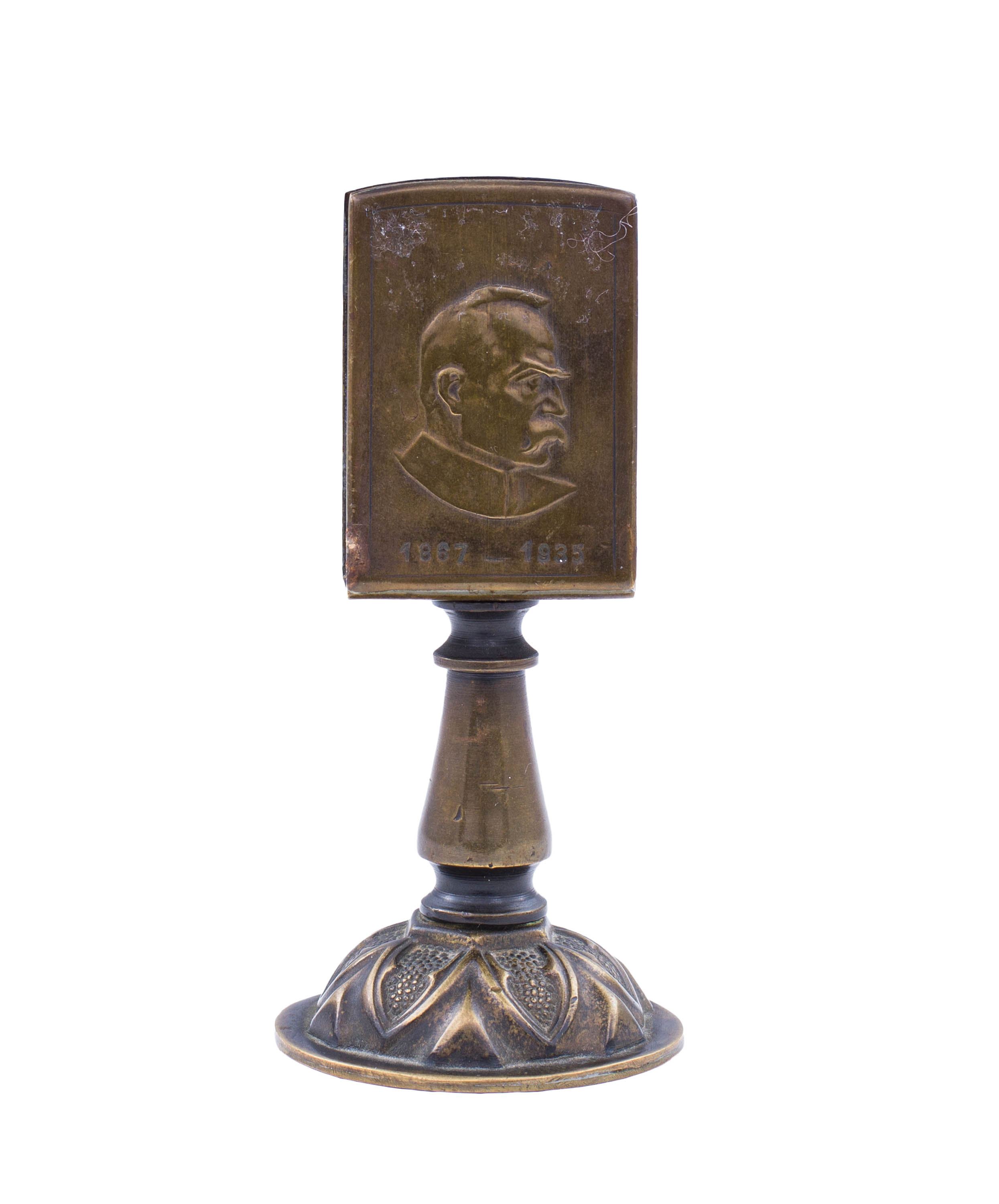 mosiądz patynowany, dekoracja w postaci wizerunku marszałka Piłsudskiego; wys. 11,5 cm