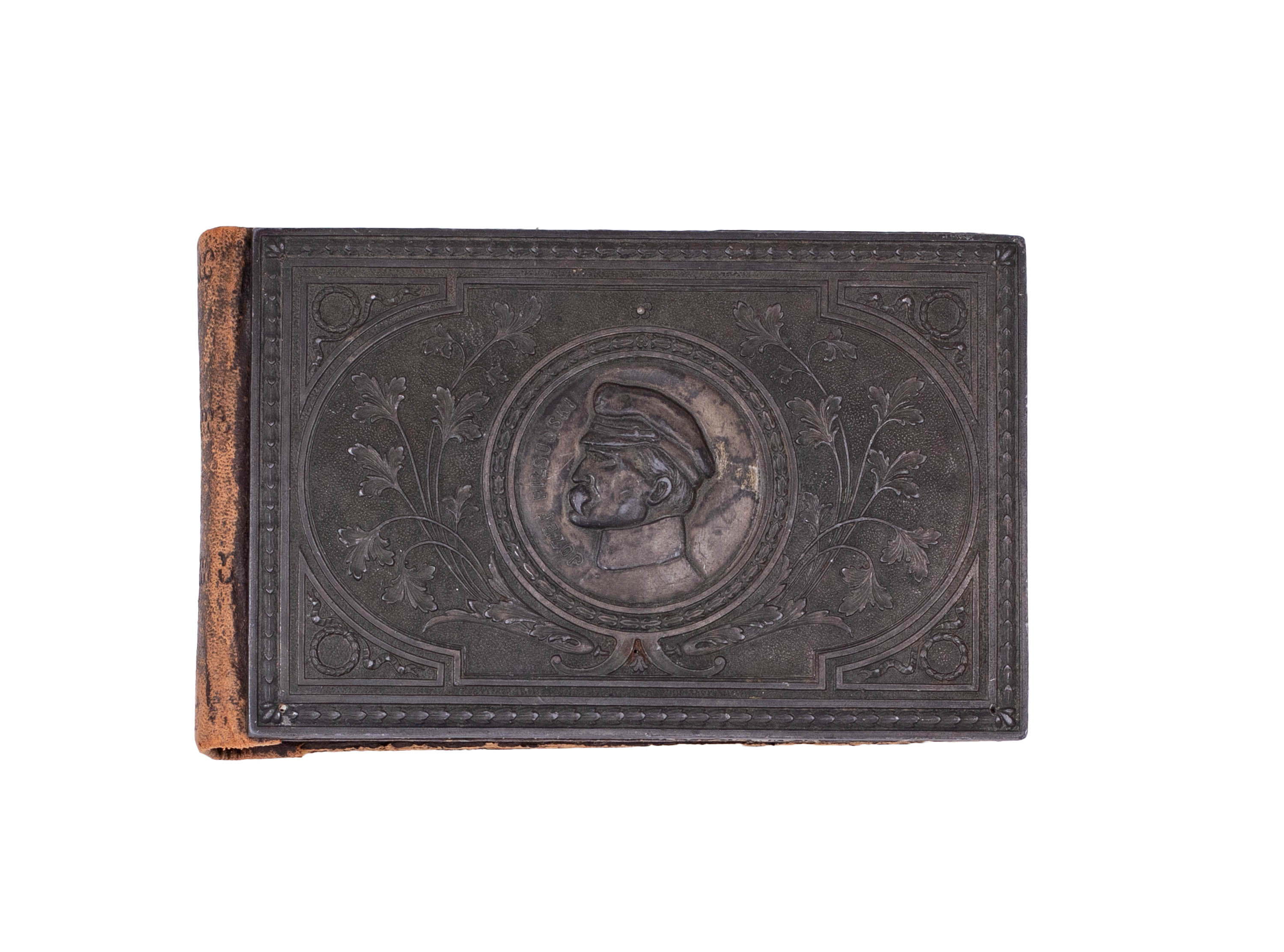 Na okładce mosiężna plakietka z wizerunkiem Józefa Piłsudskiego.