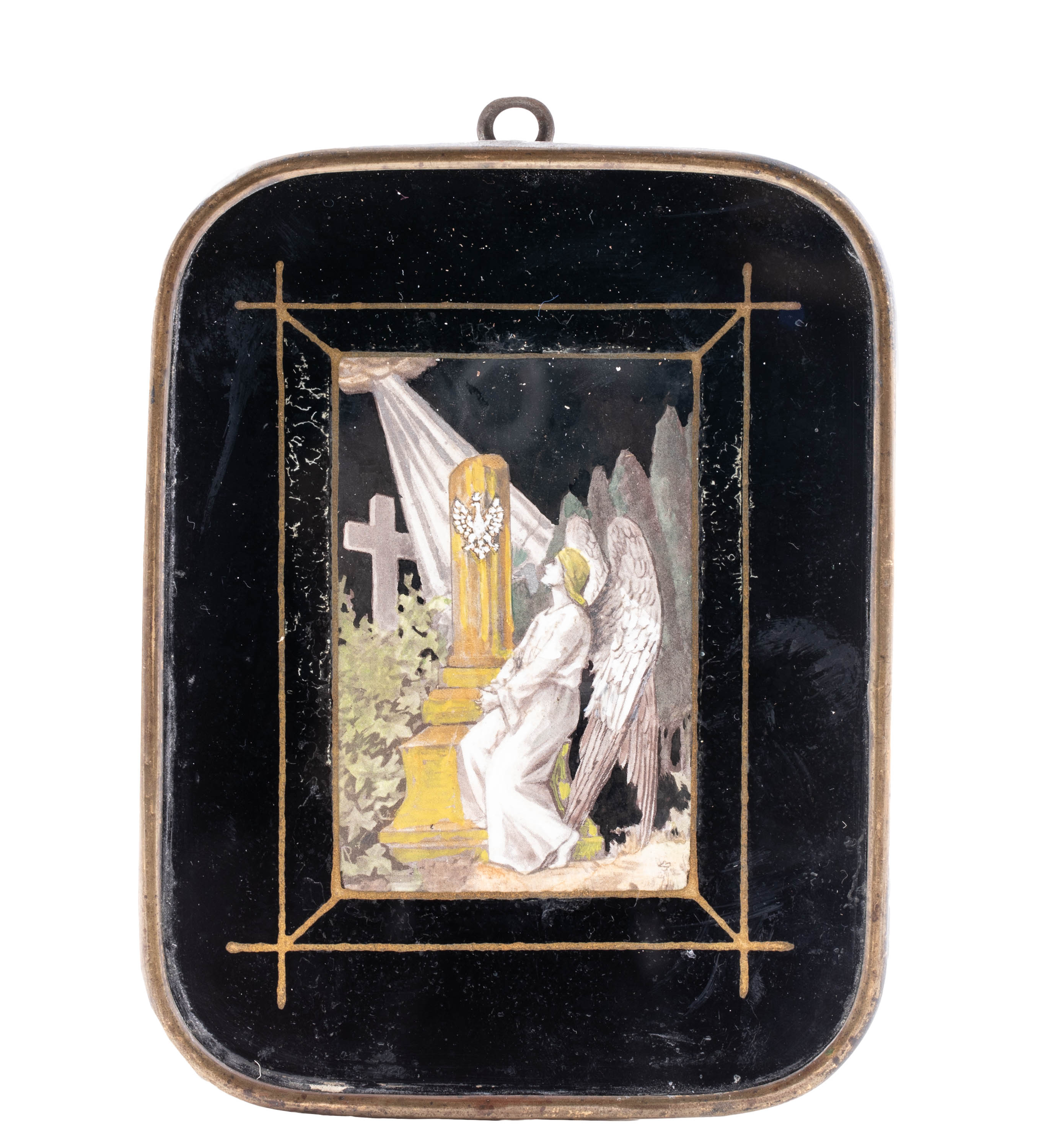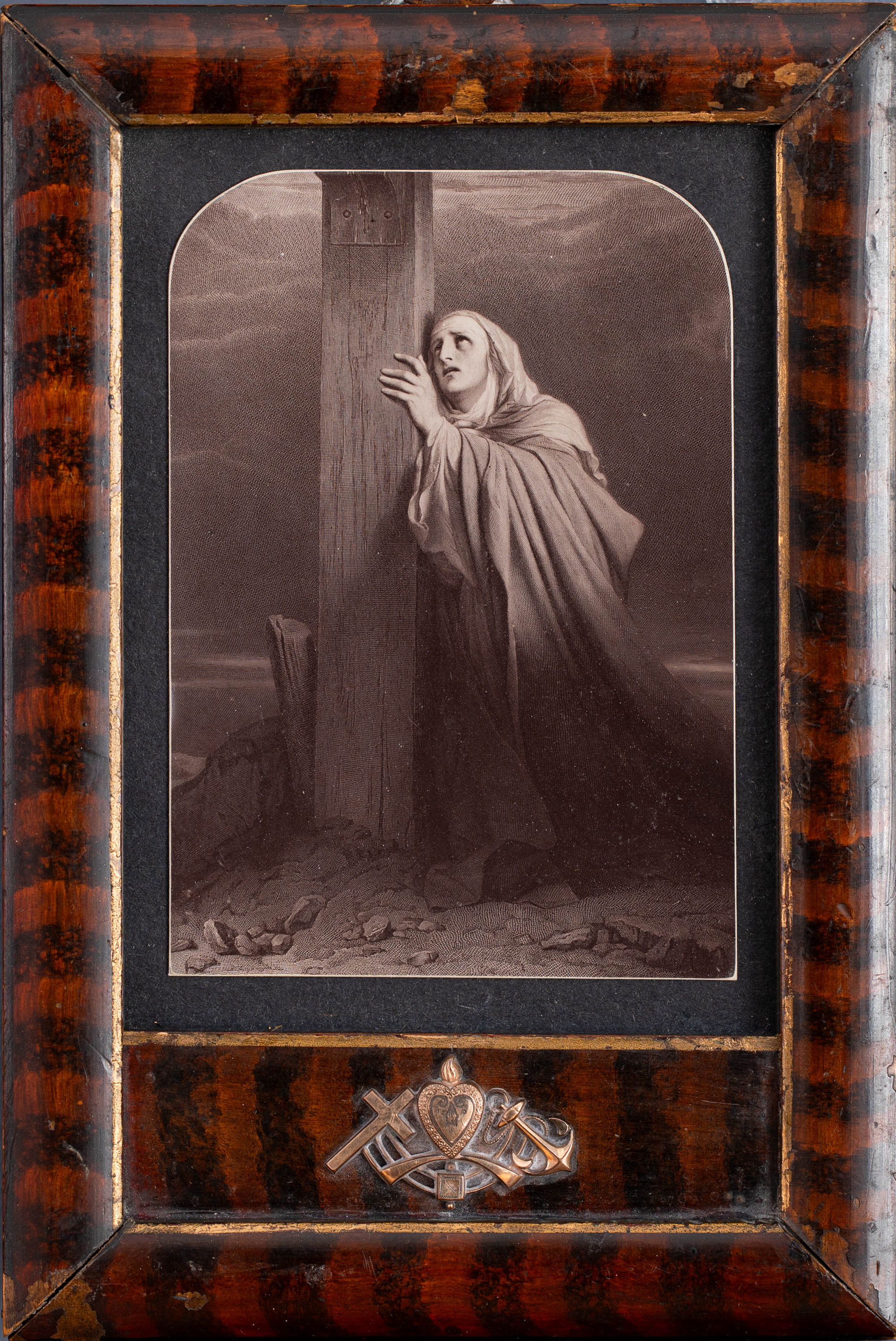 Ramka z mosiężną aplikacją przedstawiającą symbol trzech cnót – wiary, nadziei i miłości.
