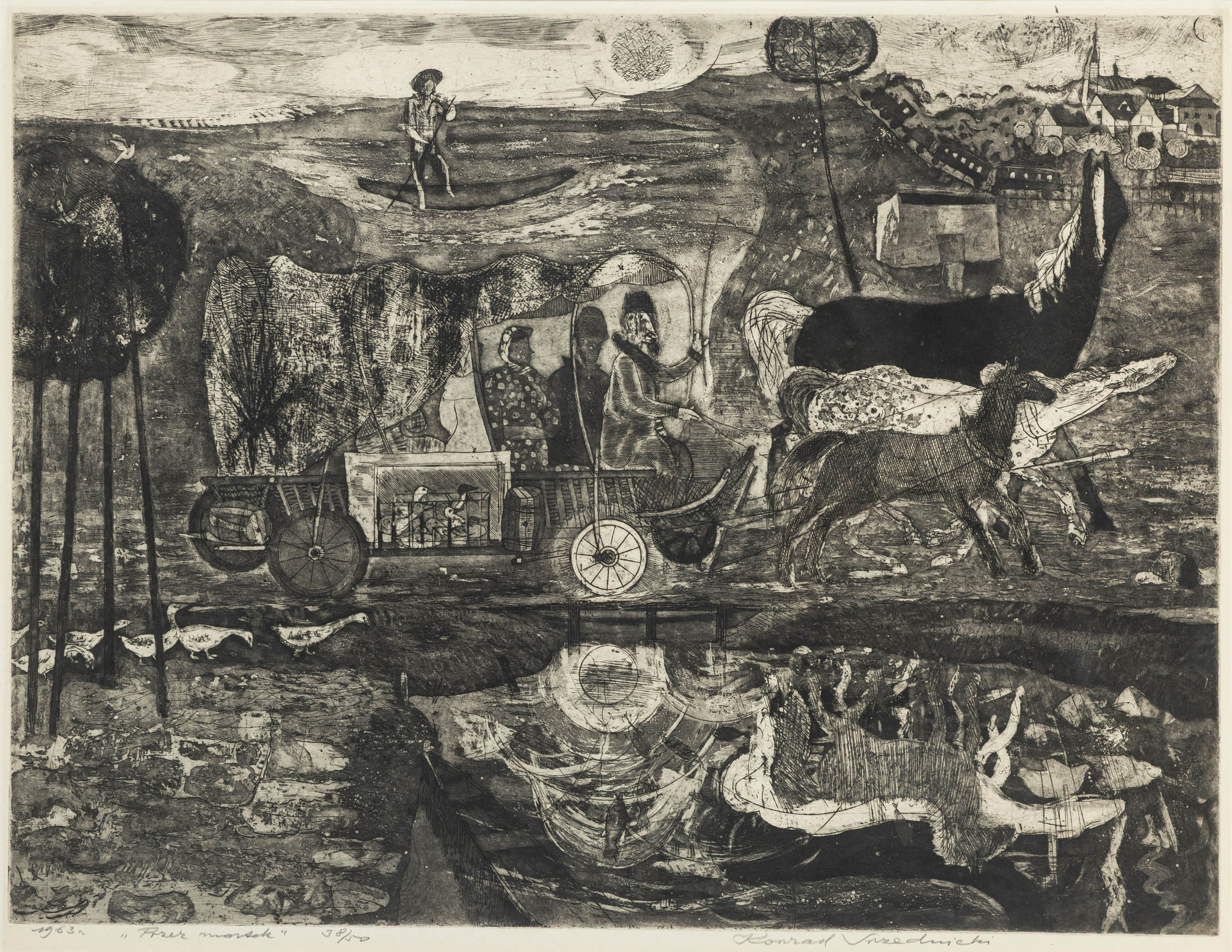 sygn. p.d.: Konrad Srzednicki, dat. l.d.: 1963, opisana u dołu: Przez mostek 38/50