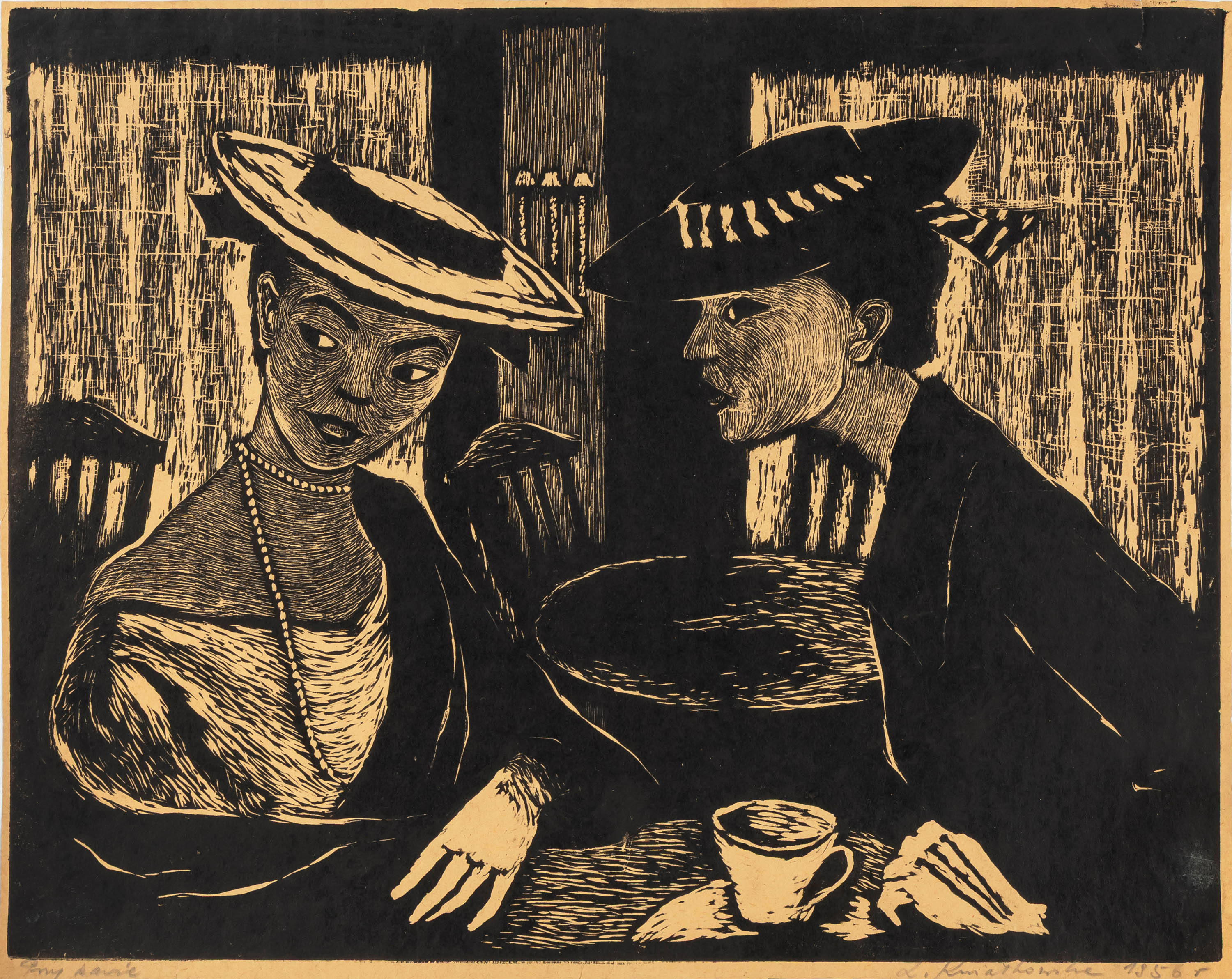 sygn. i dat. ołówkiem p.d.: Kwiatkowska Lidia 1956 r., opisany ołówkiem l.d.: Przy kawie