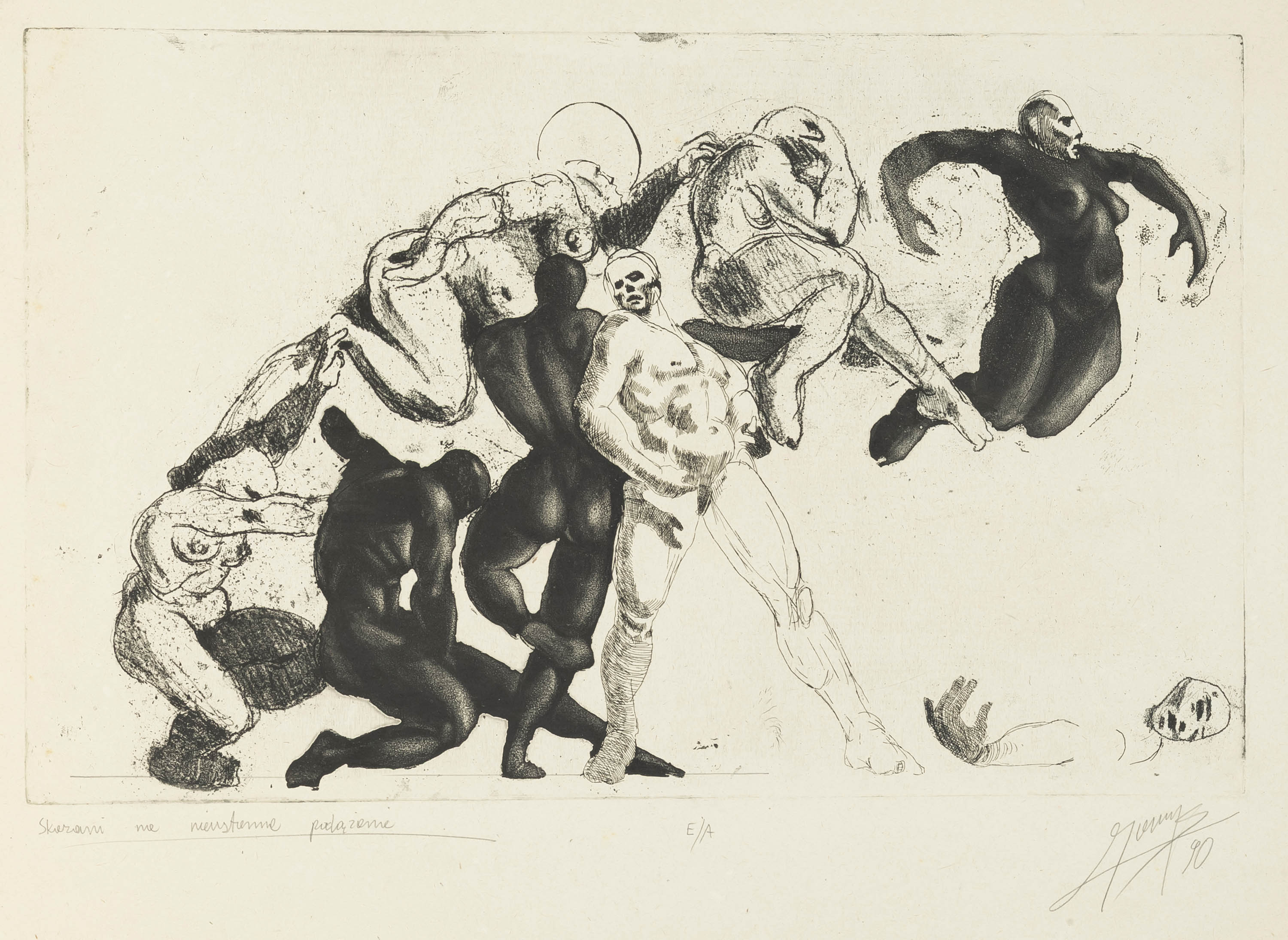 sygn. i dat. ołówkiem p.d.: Gorczyca / 90, opisana ołówkiem l.d.: Skazani na nieustanne pożądanie