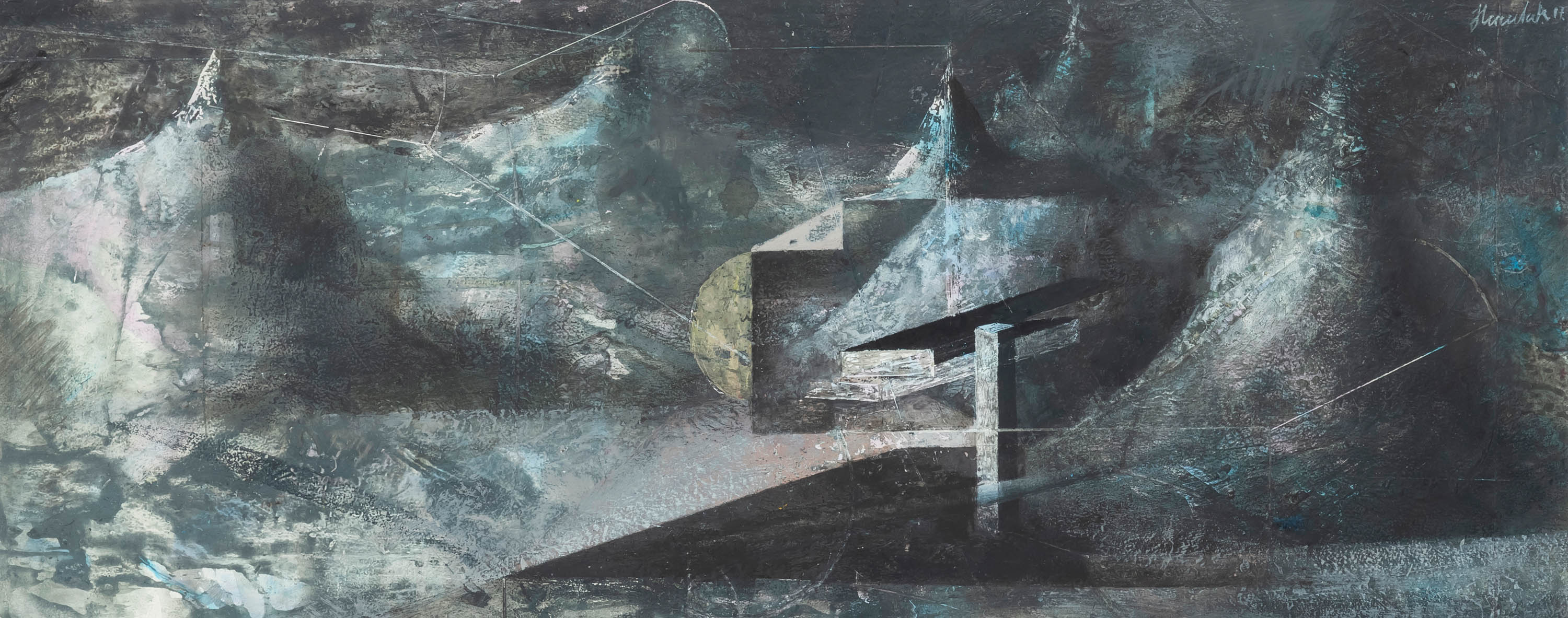 sygn. i dat. ołówkiem p.d.: Gorczyca / 90, opisana ołówkiem l.d.: Próba przezwyciężenia tego co nieuniknione / E/A