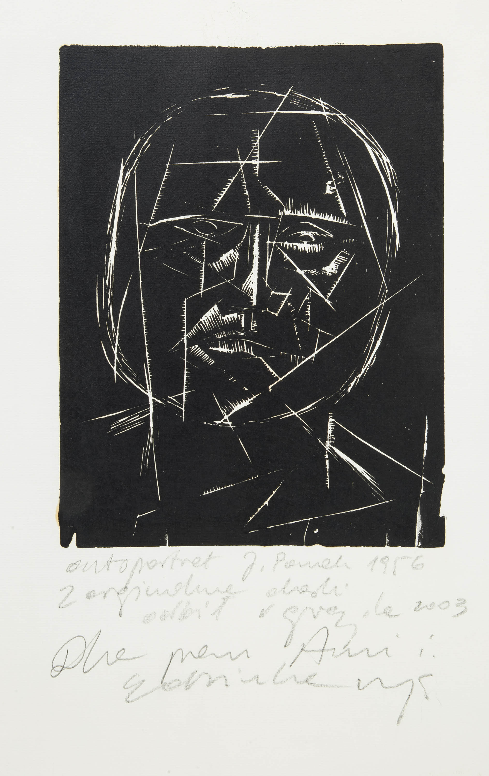 opisany u dołu: autoportret J. Panek 1956 / Z oryginalnej deski / odbił Ryszard Grazda 2023 / Dla pani Ani i …..