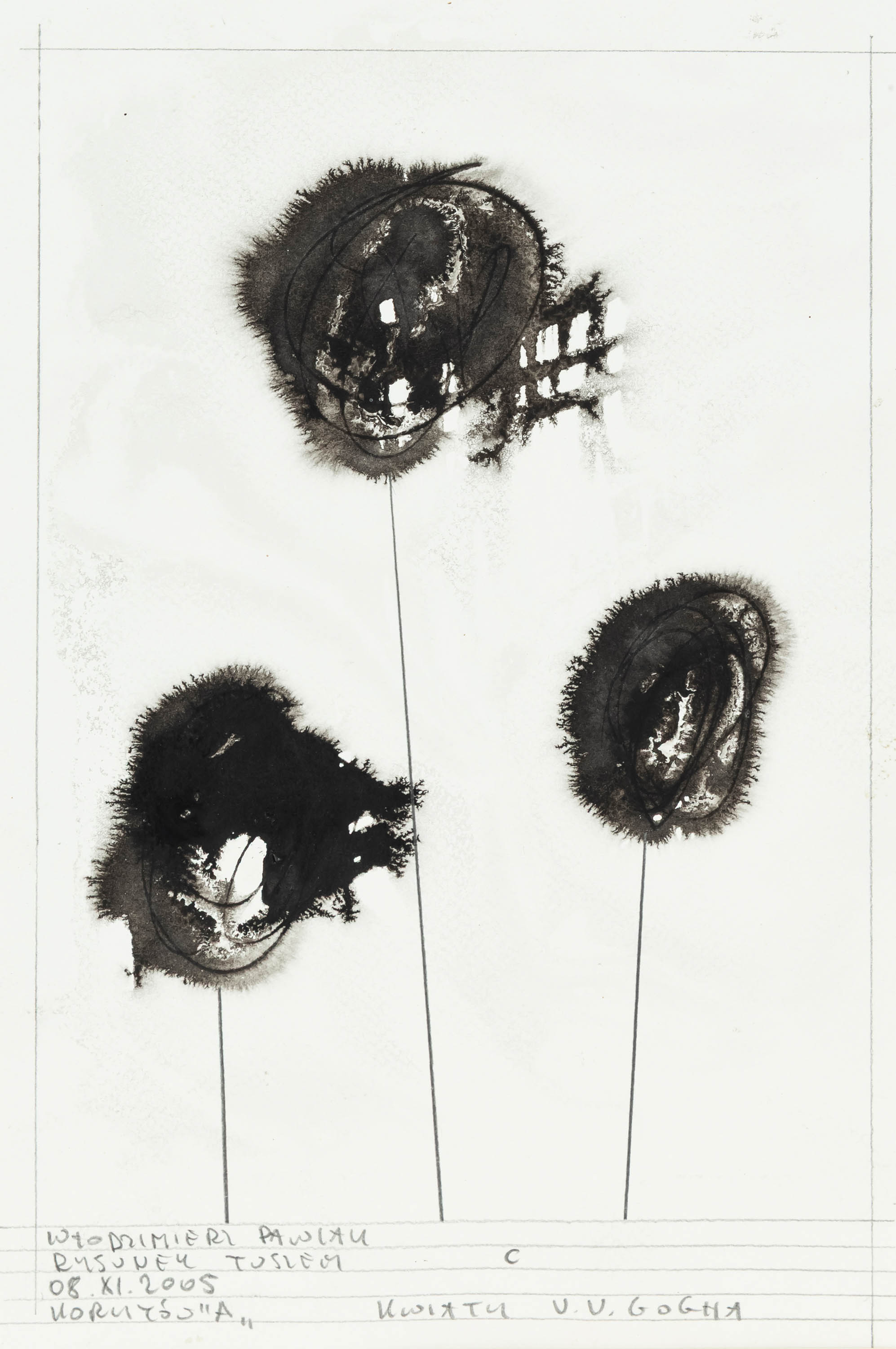 sygn., opisany i dat. l.d.: WŁODZIMIERZ PAWLAK / RYSUNEK TUSZEM / 08.XI.2005 / KORYTÓW A / KWIATY V.V. GOGHA