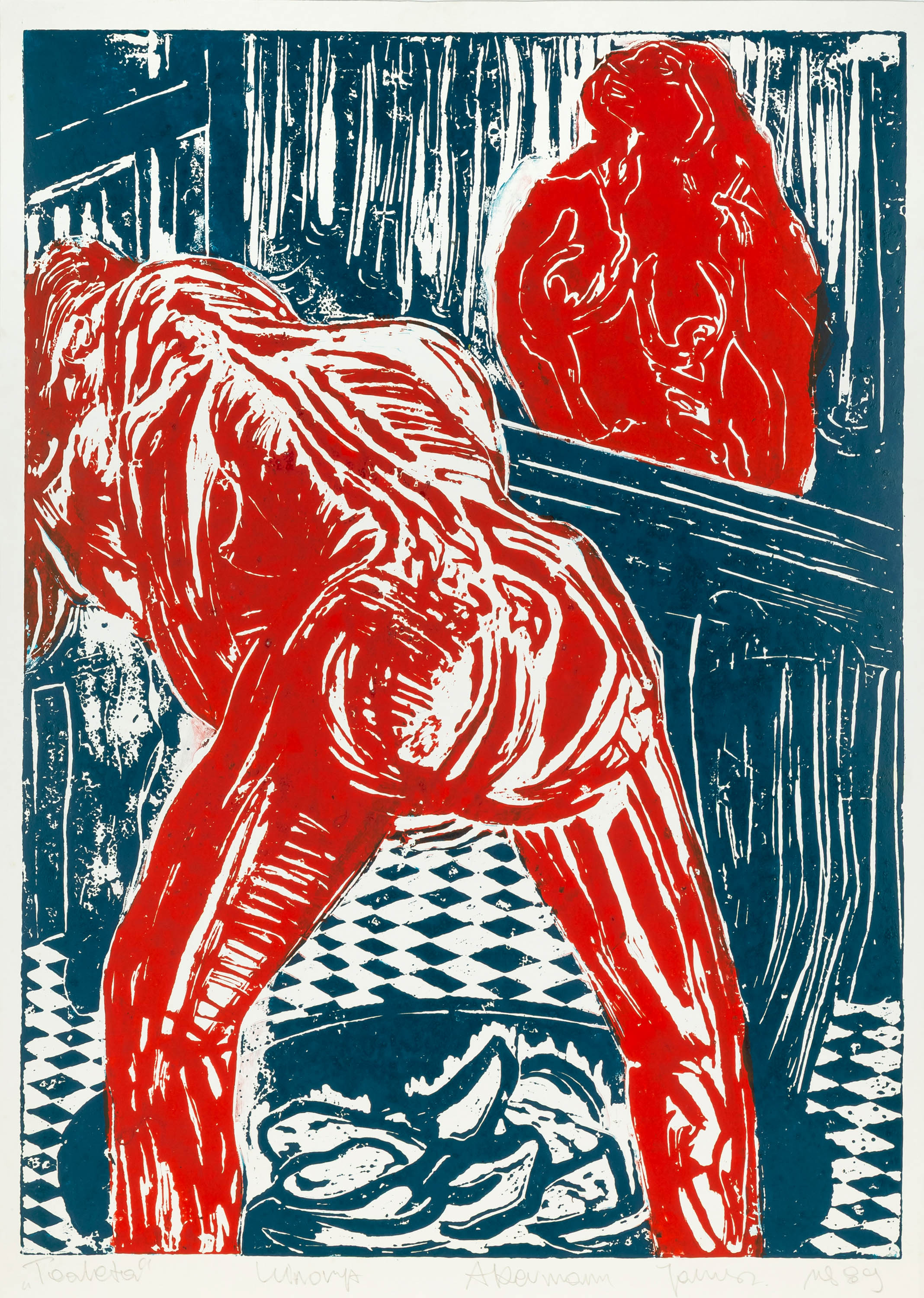 sygn. i dat. ołówkiem u dołu: "Toaleta" linoryt Akermann Janusz 1989