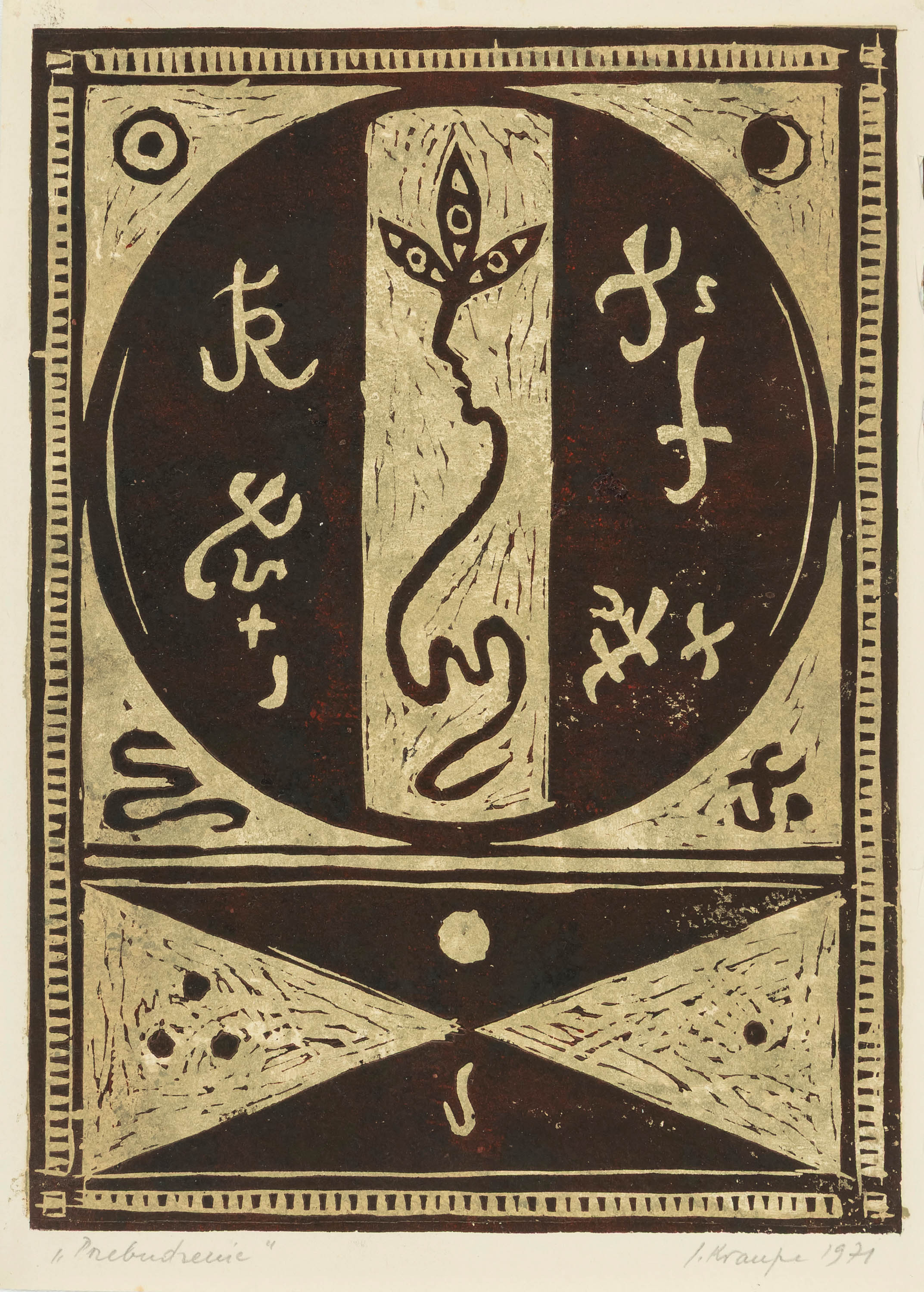 sygn. i dat. ołówkiem p.d.: J. Kraupe 1971, opisany ołówkiem l.d.: "Przebudzenie"