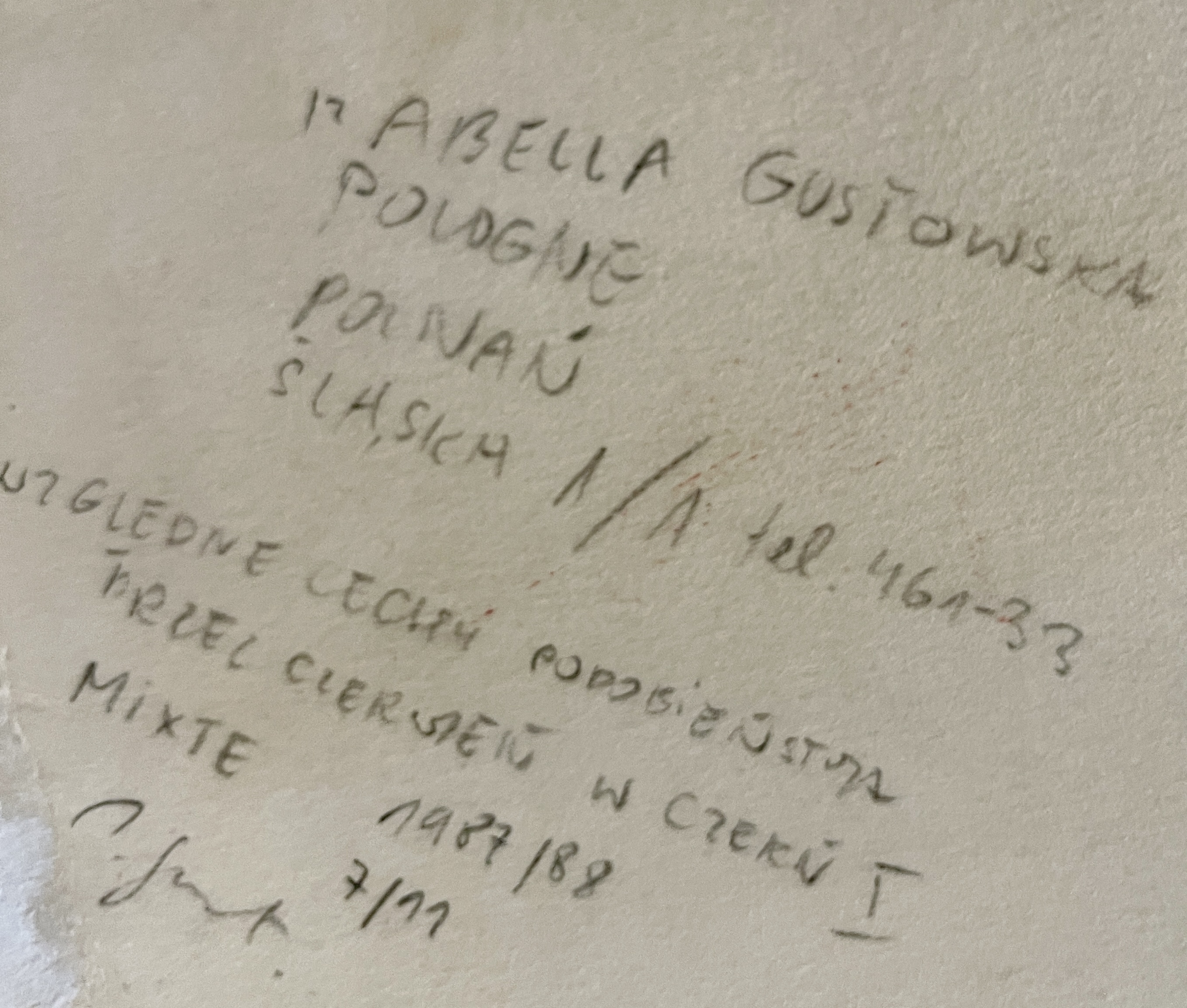 sygn. na odwrociu: IZABELLA GUSTOWSKA | POLOGNE | POZNAŃ | ŚLĄSKA1/1 tel.461-33 | WZGLĘDNE CECHY PODOBIEŃSTWA | PRZEZ CZERWIEŃ W CZERŃ 1 | MIXTE...