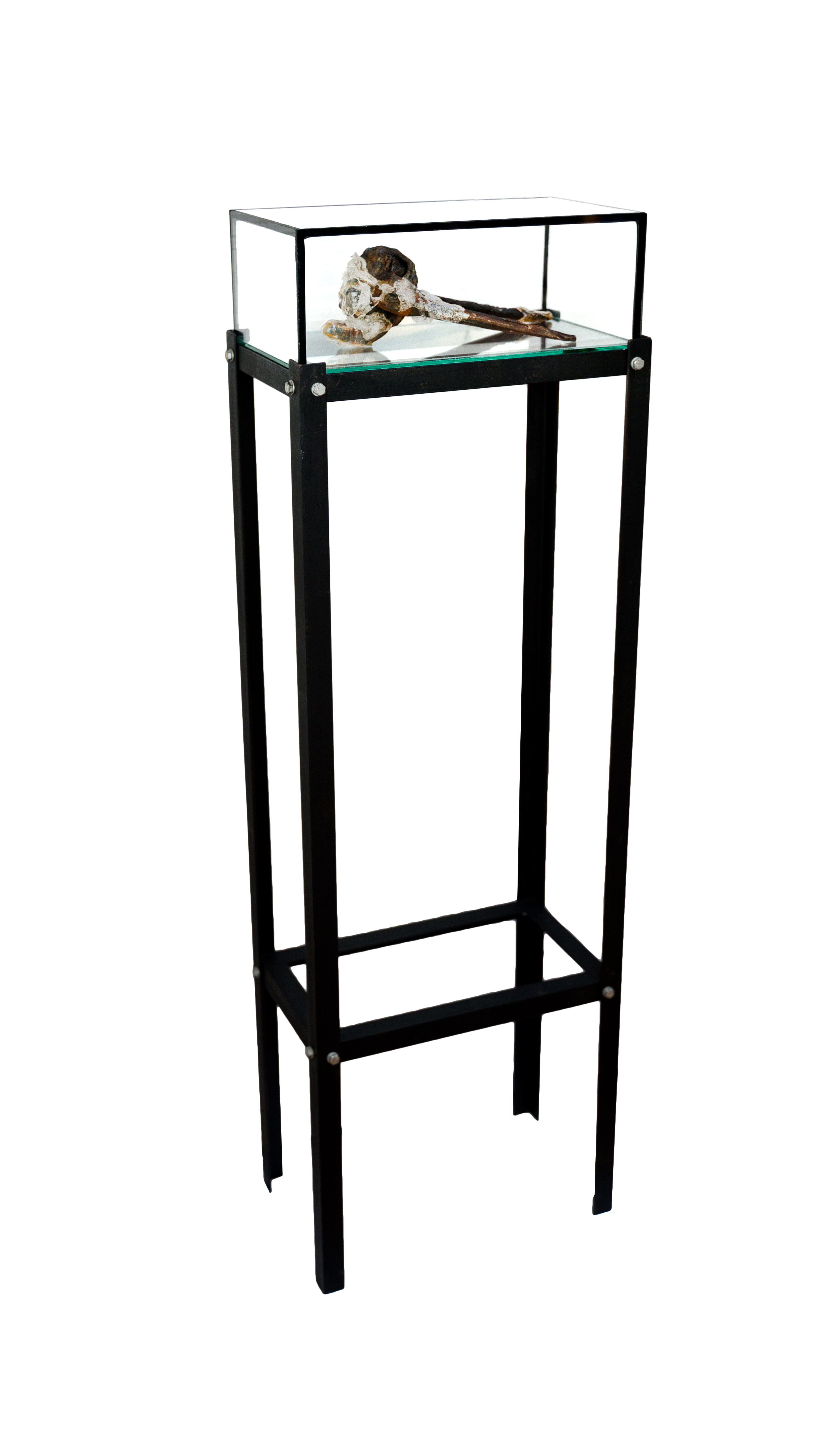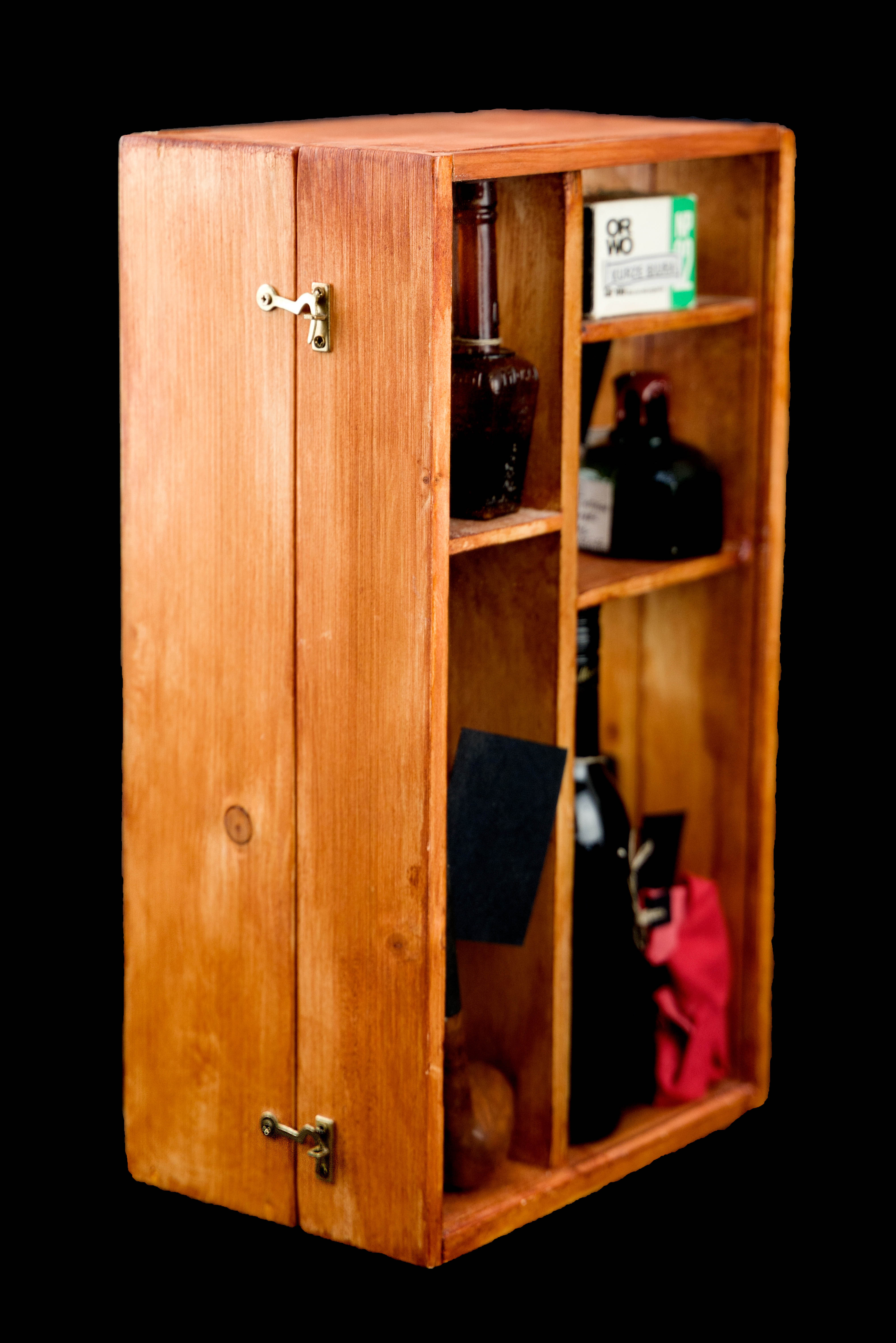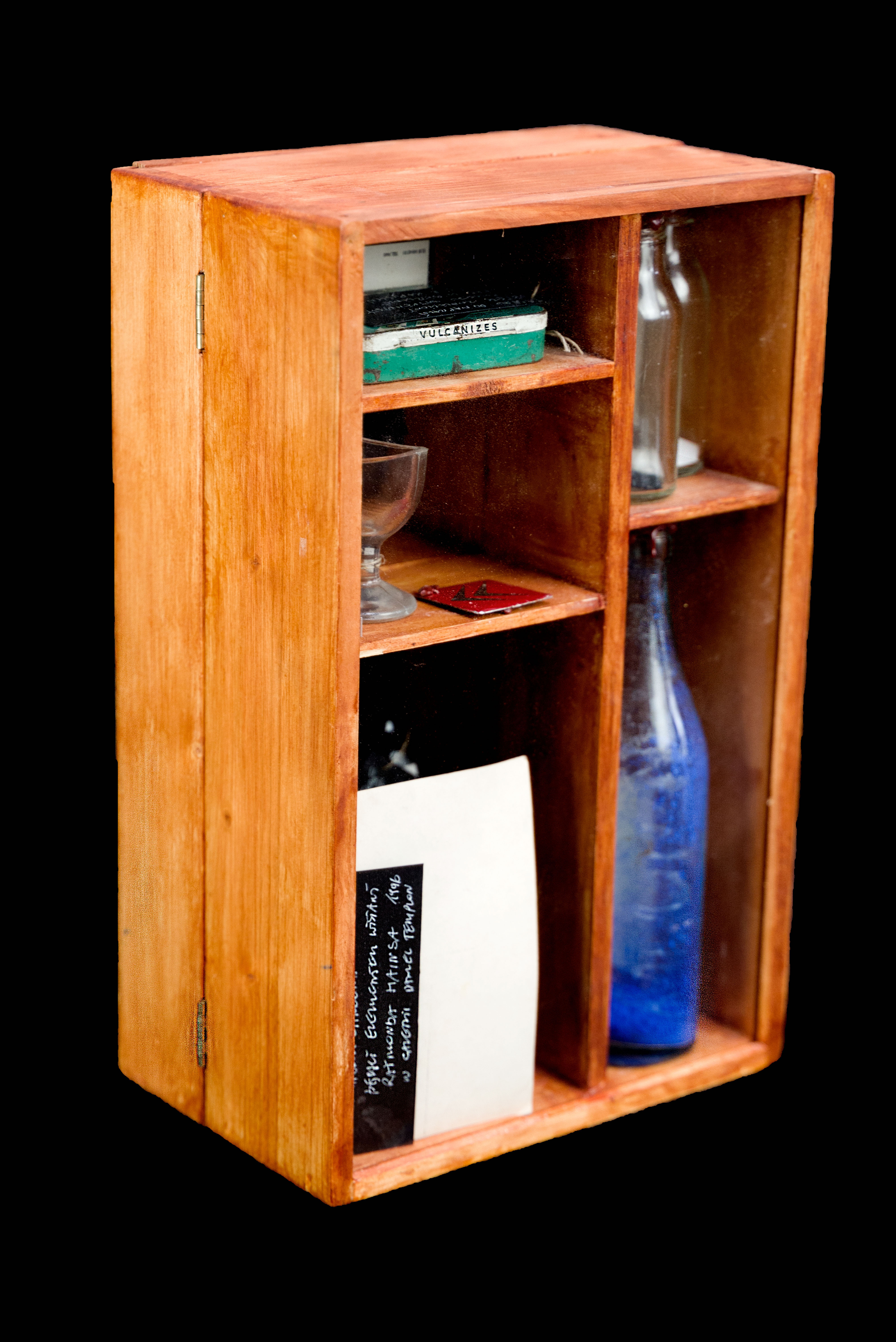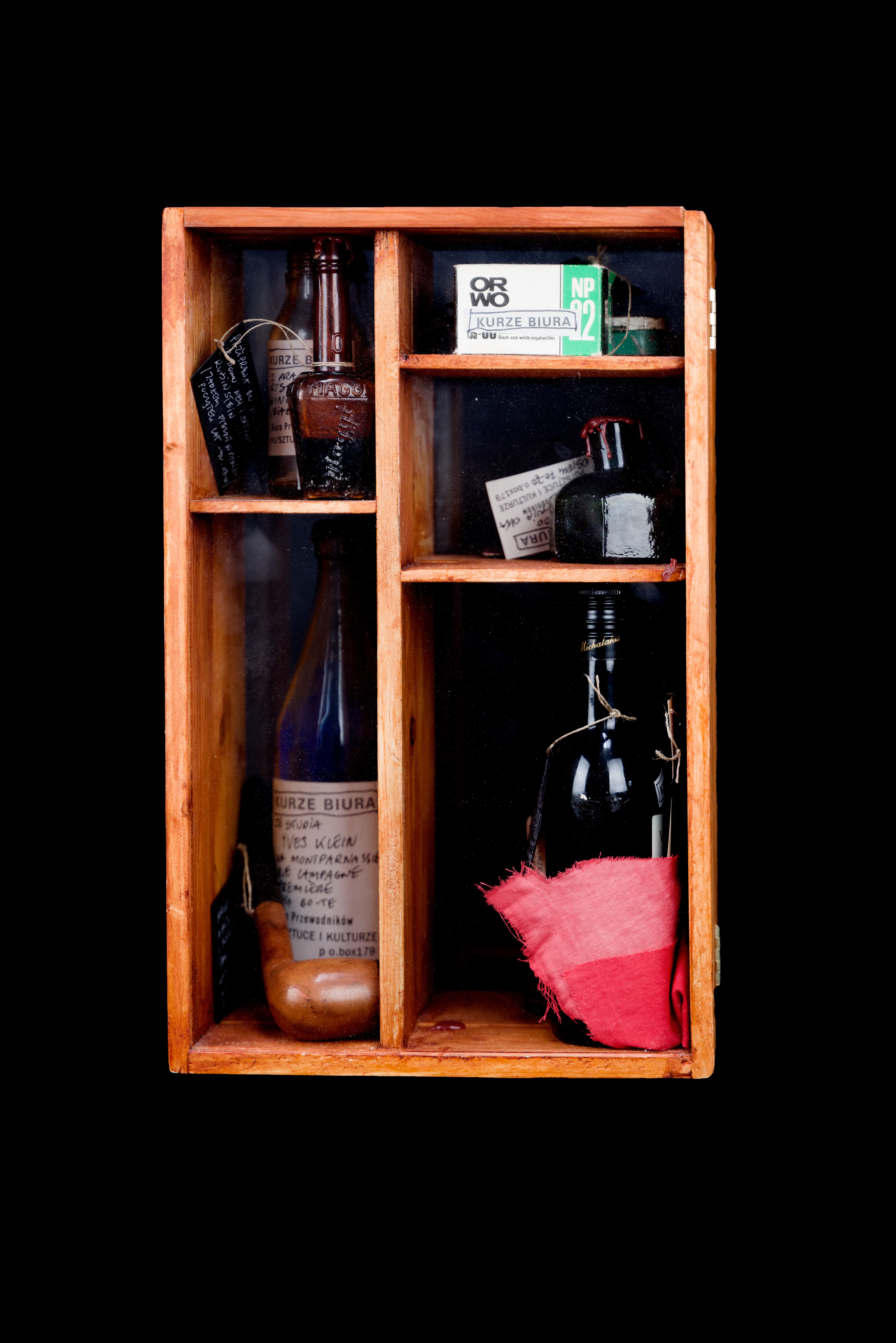 gablota (drewno, szkło) 35 x 44 x 14 cm, w środku 14 elementów, opatrzony numerem i opisem