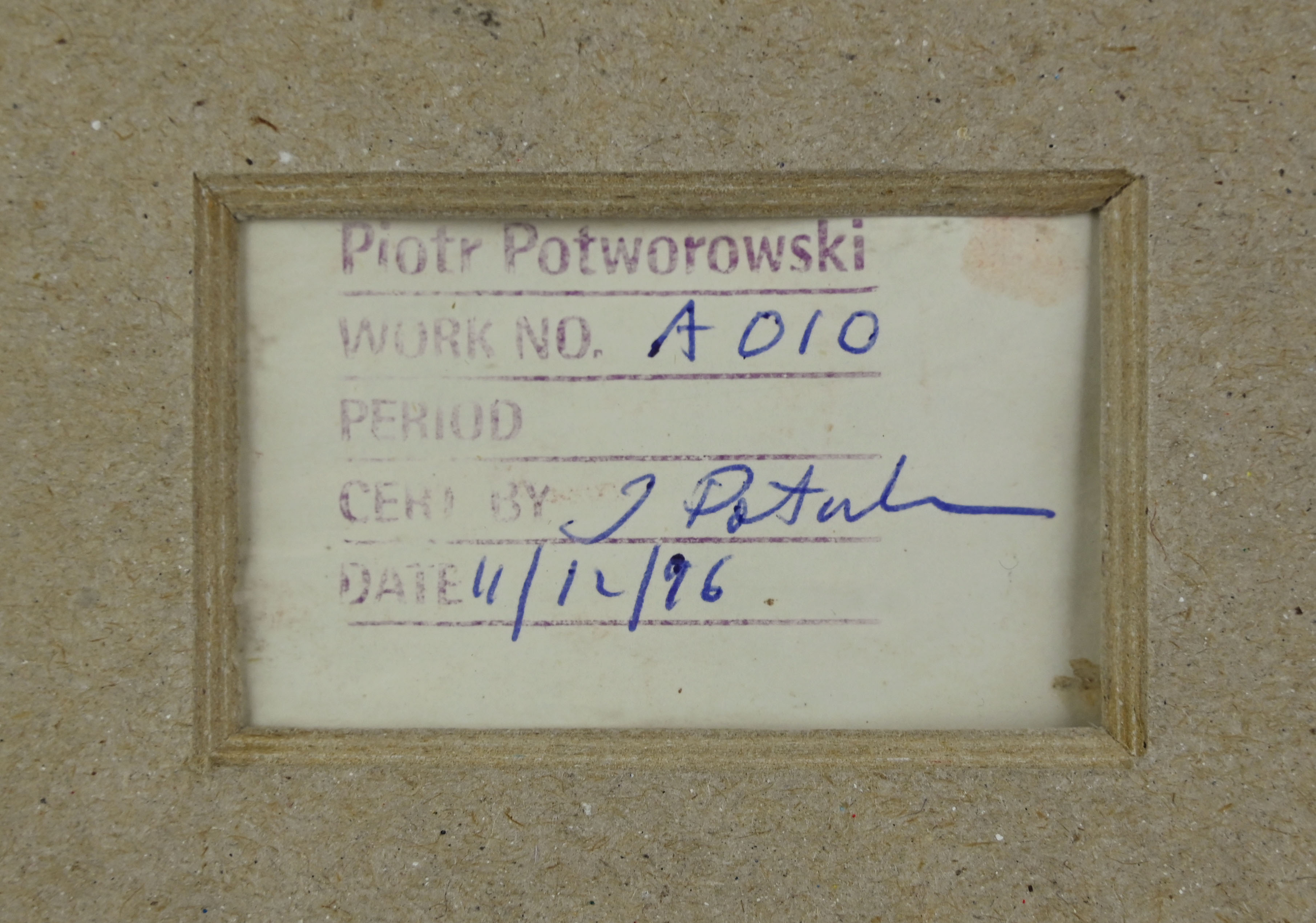 na odwrociu pieczątka: Piotr Potworowski | Work no. A 010 | PERIOD - | CERT BY J. Potworowski | DATE: 11/12/96