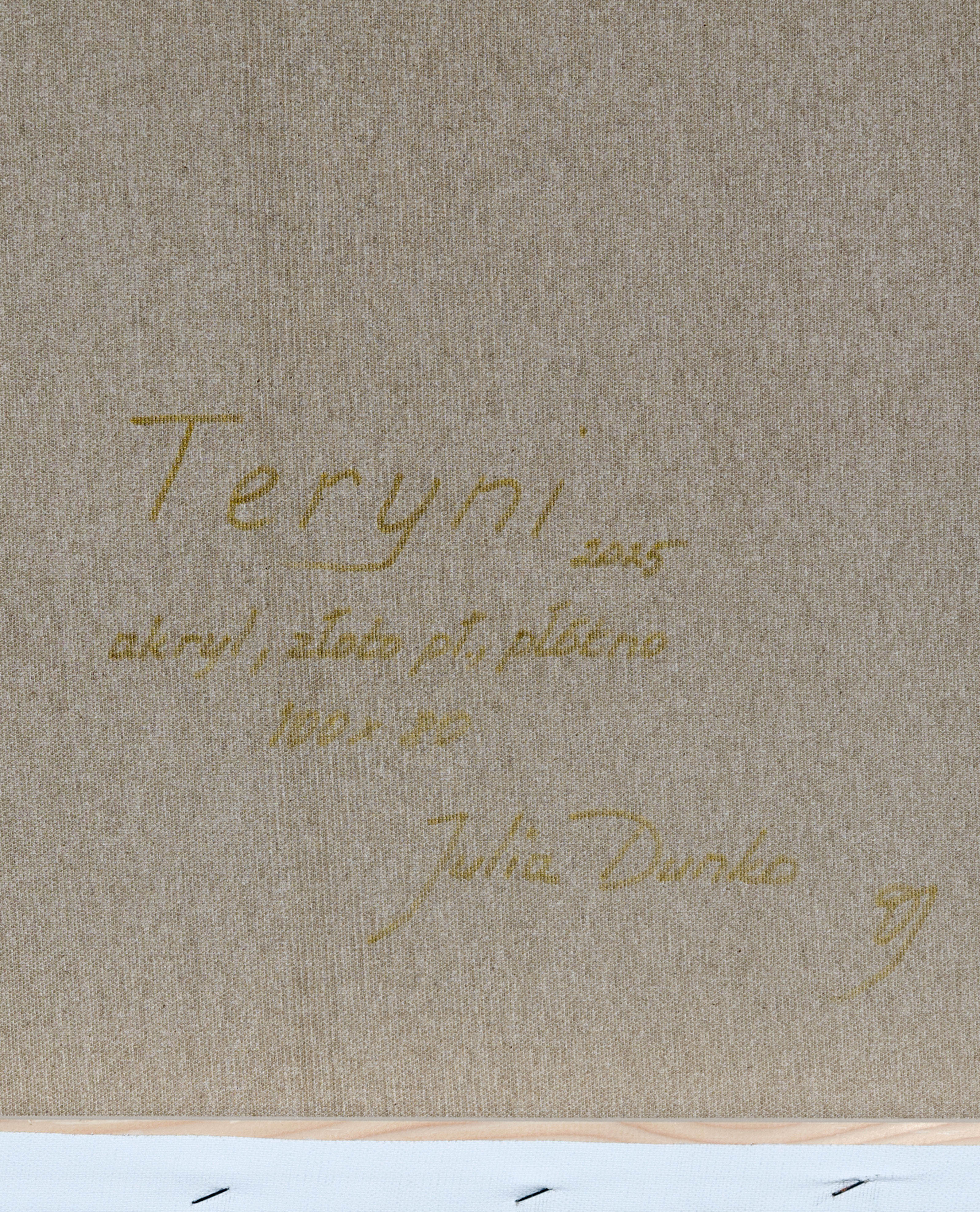 sygn. n odwrociu: l.d.: Teryni, 2025| akryl, złoto pł., plótno| 100 x 80| Julia Dunko (monogram DJ)