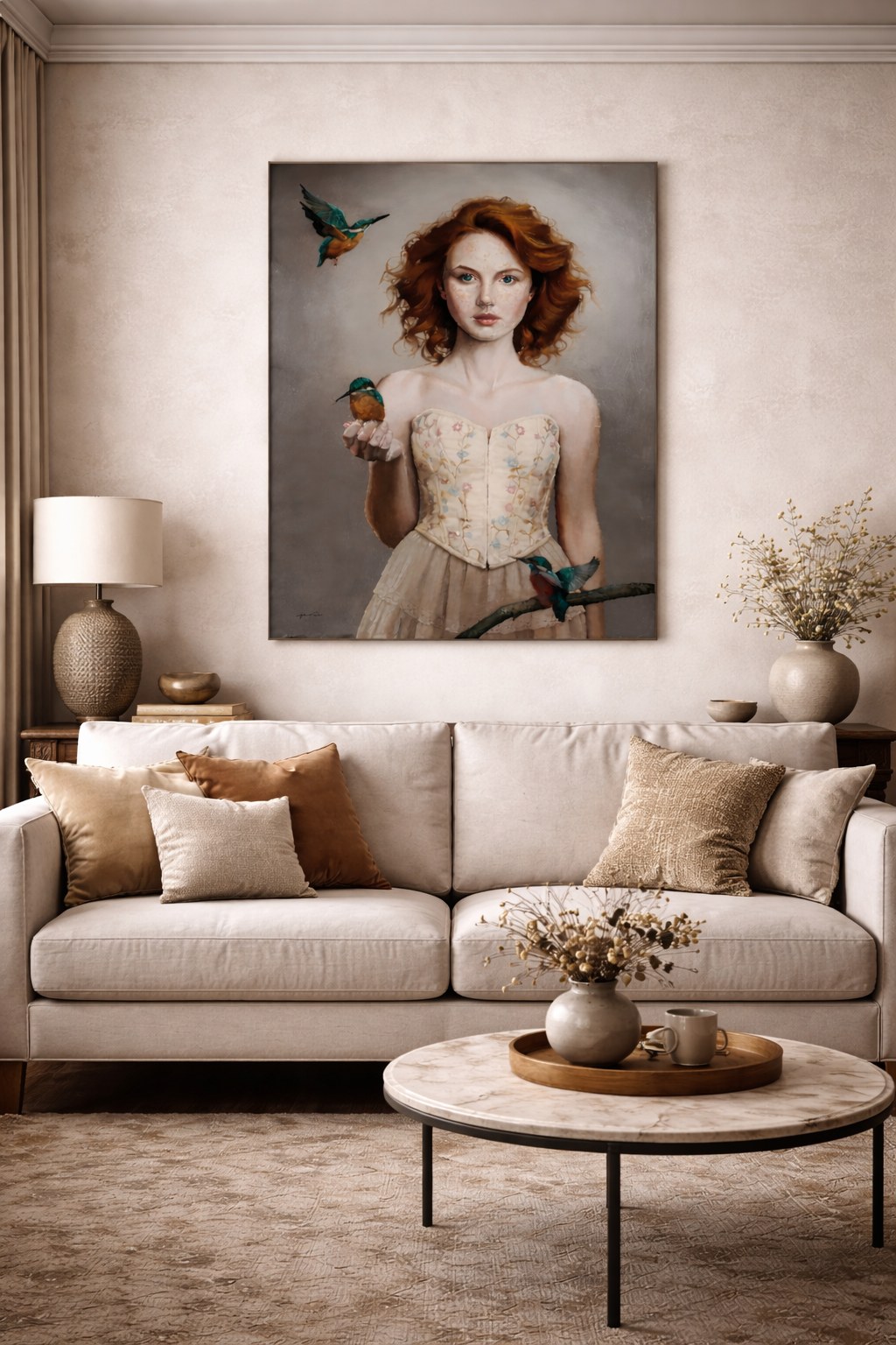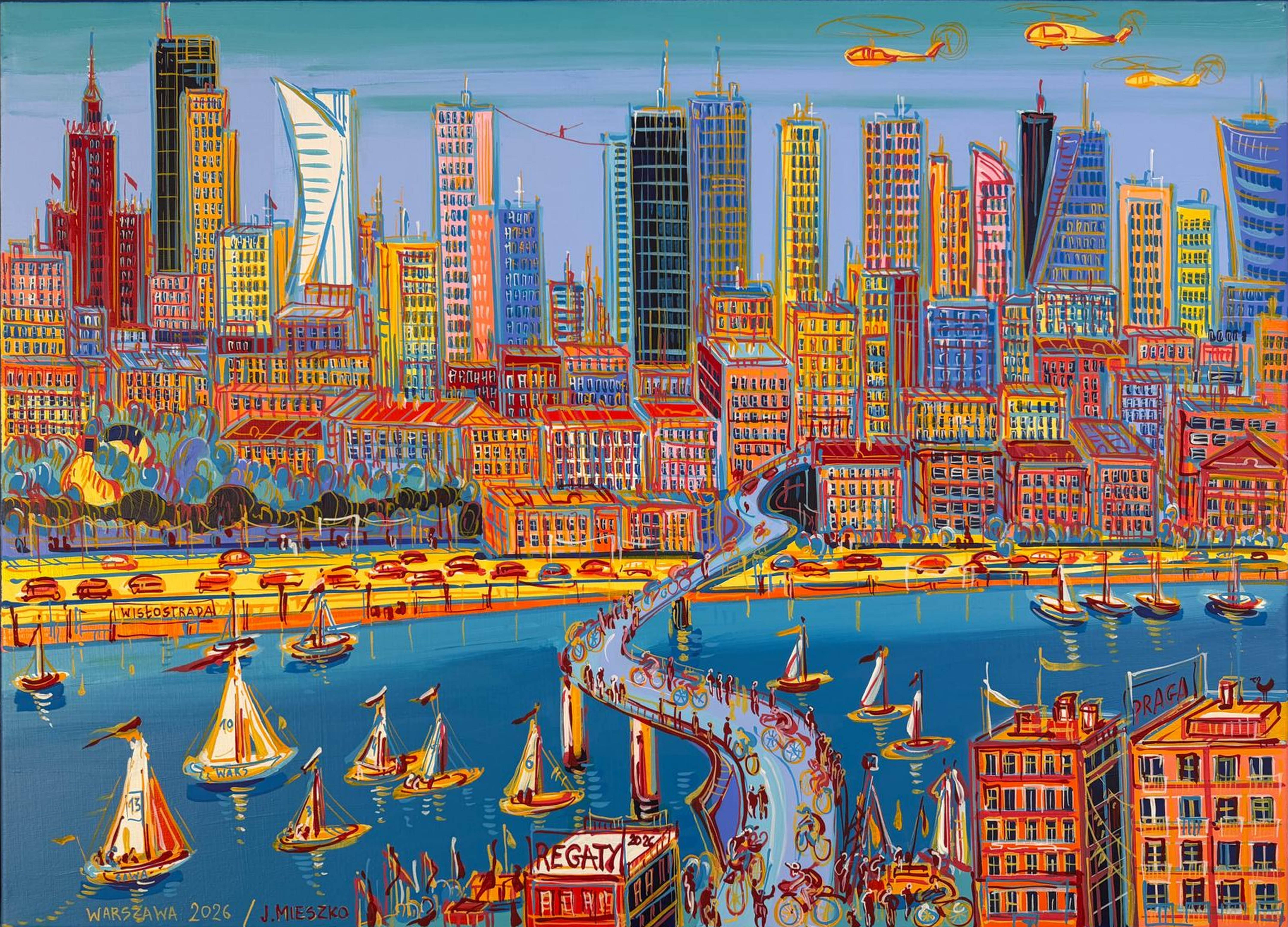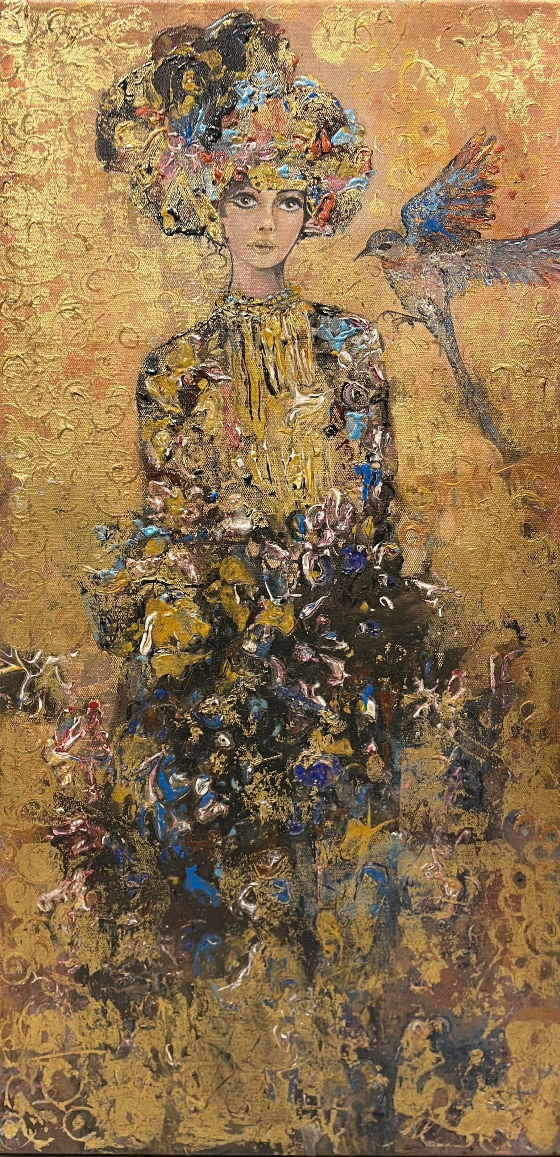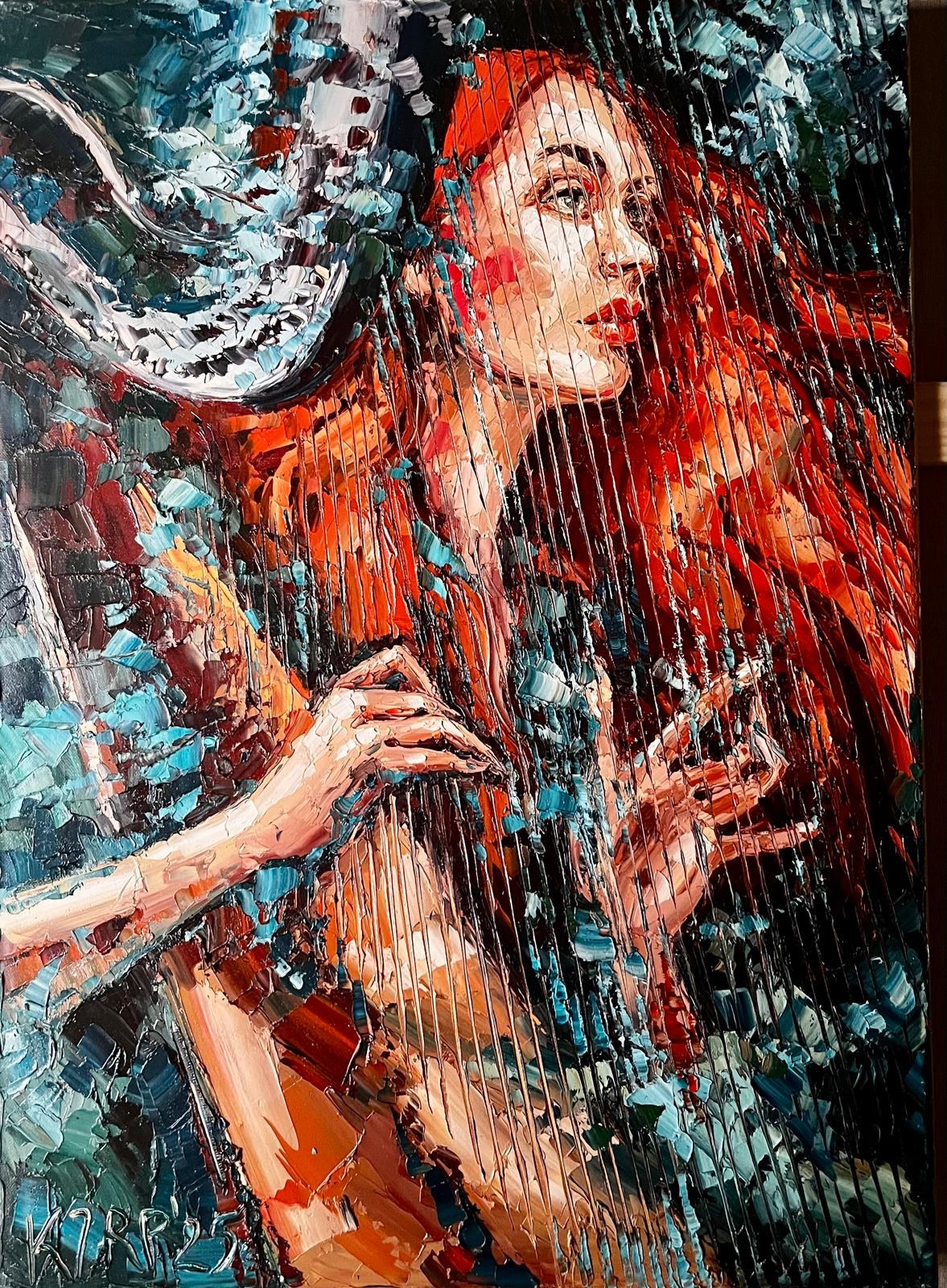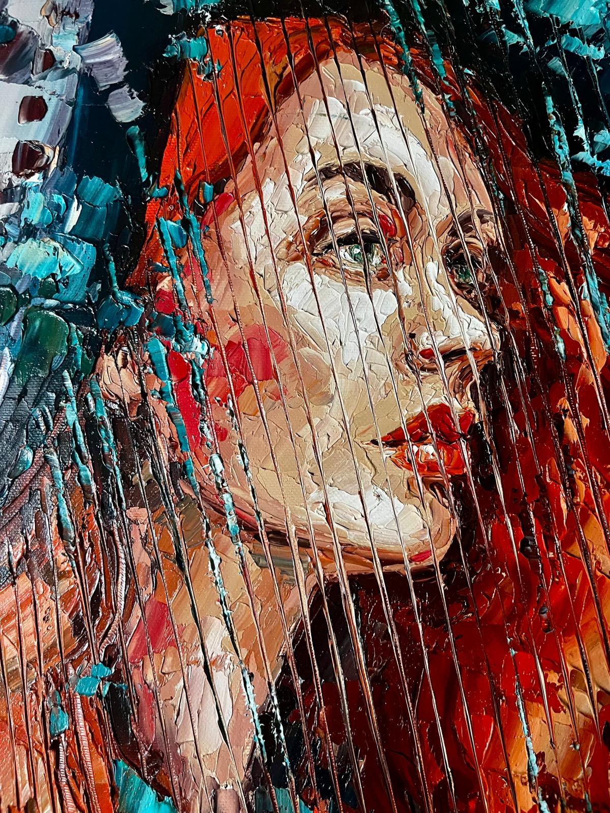 Zabezpieczony matowym werniksem i naciągniętym na sosnowe krosno malarskie.