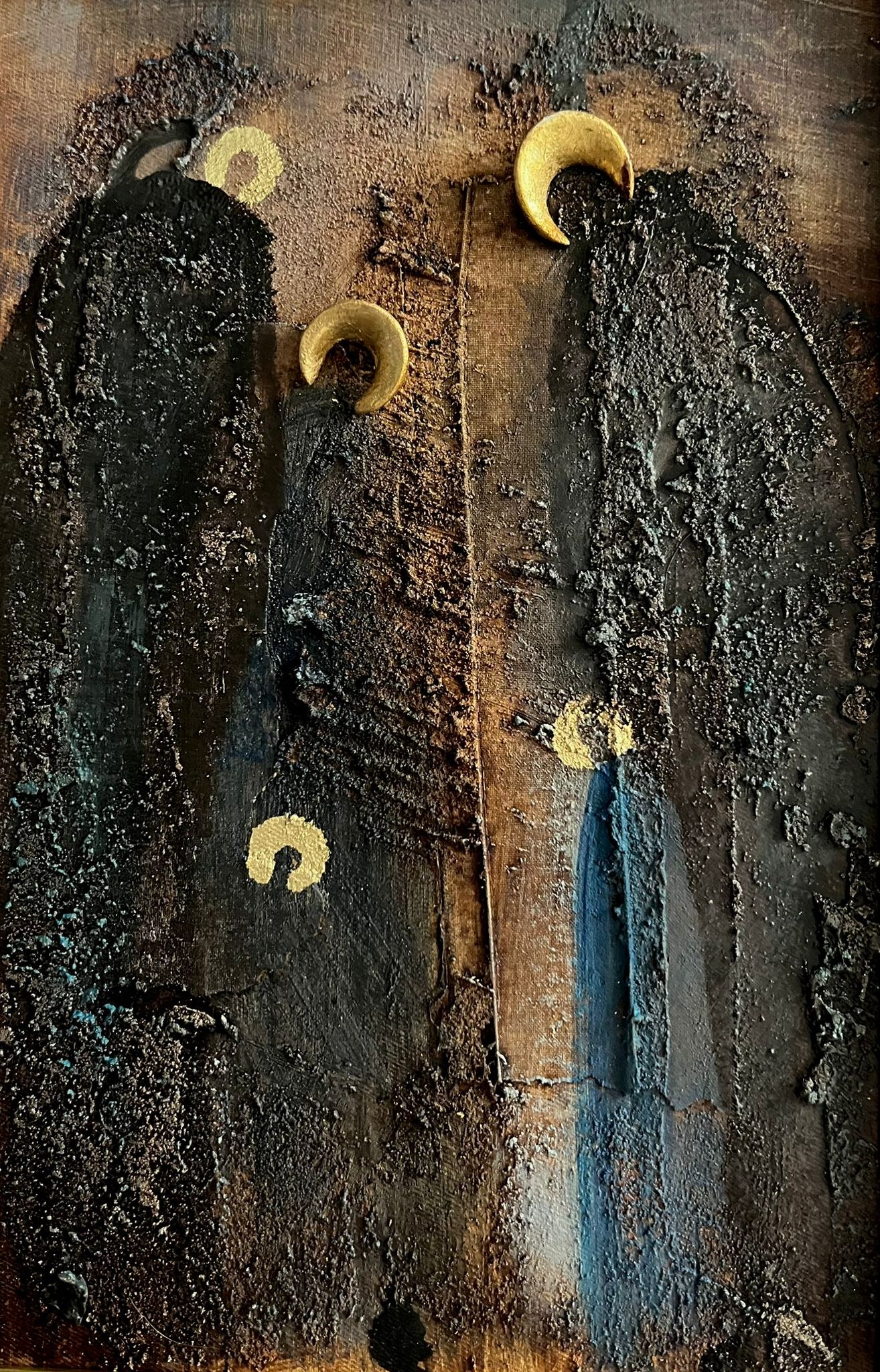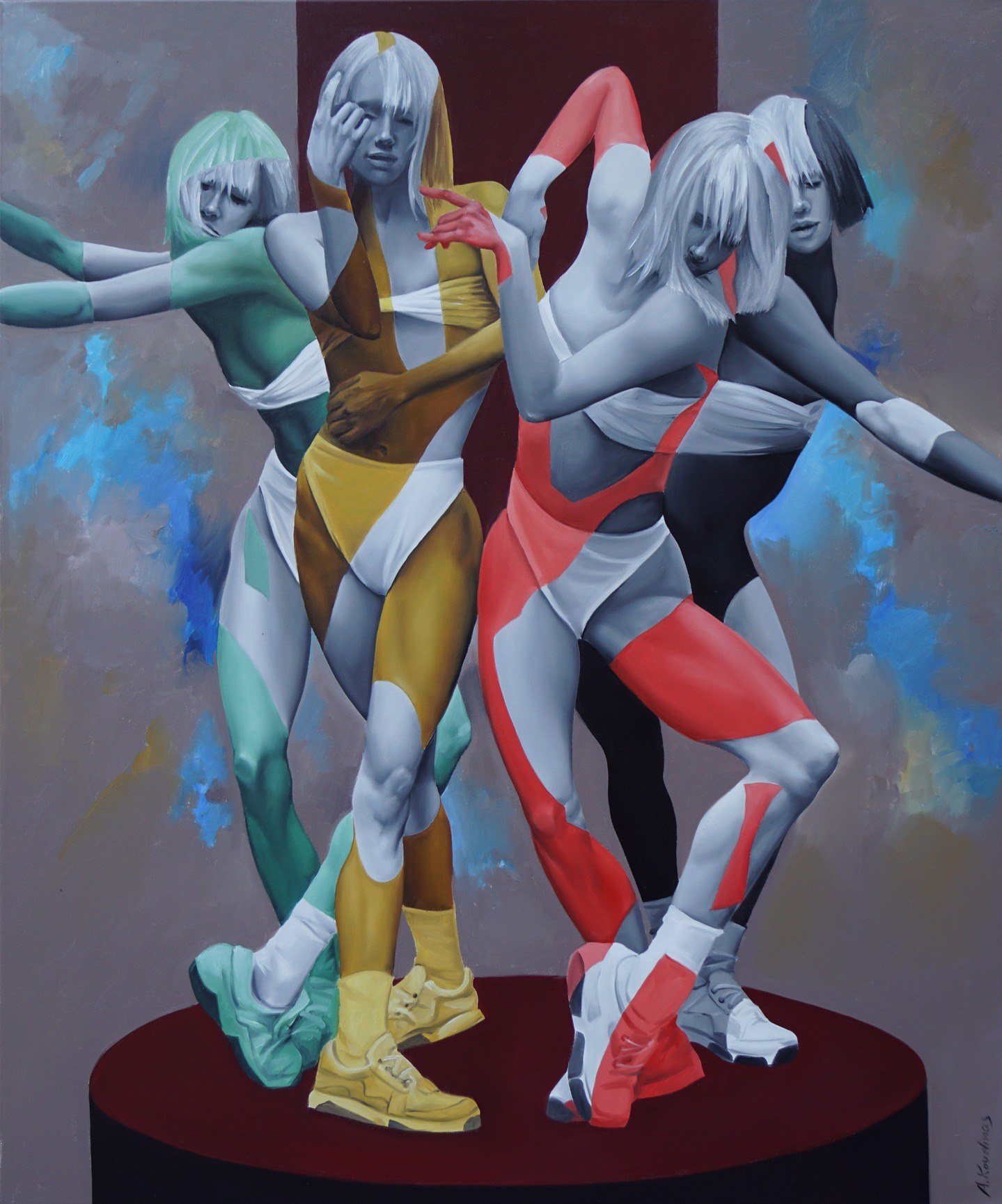 Technika: technika własna, olej, płótno, nakładane stare płótno na nowe