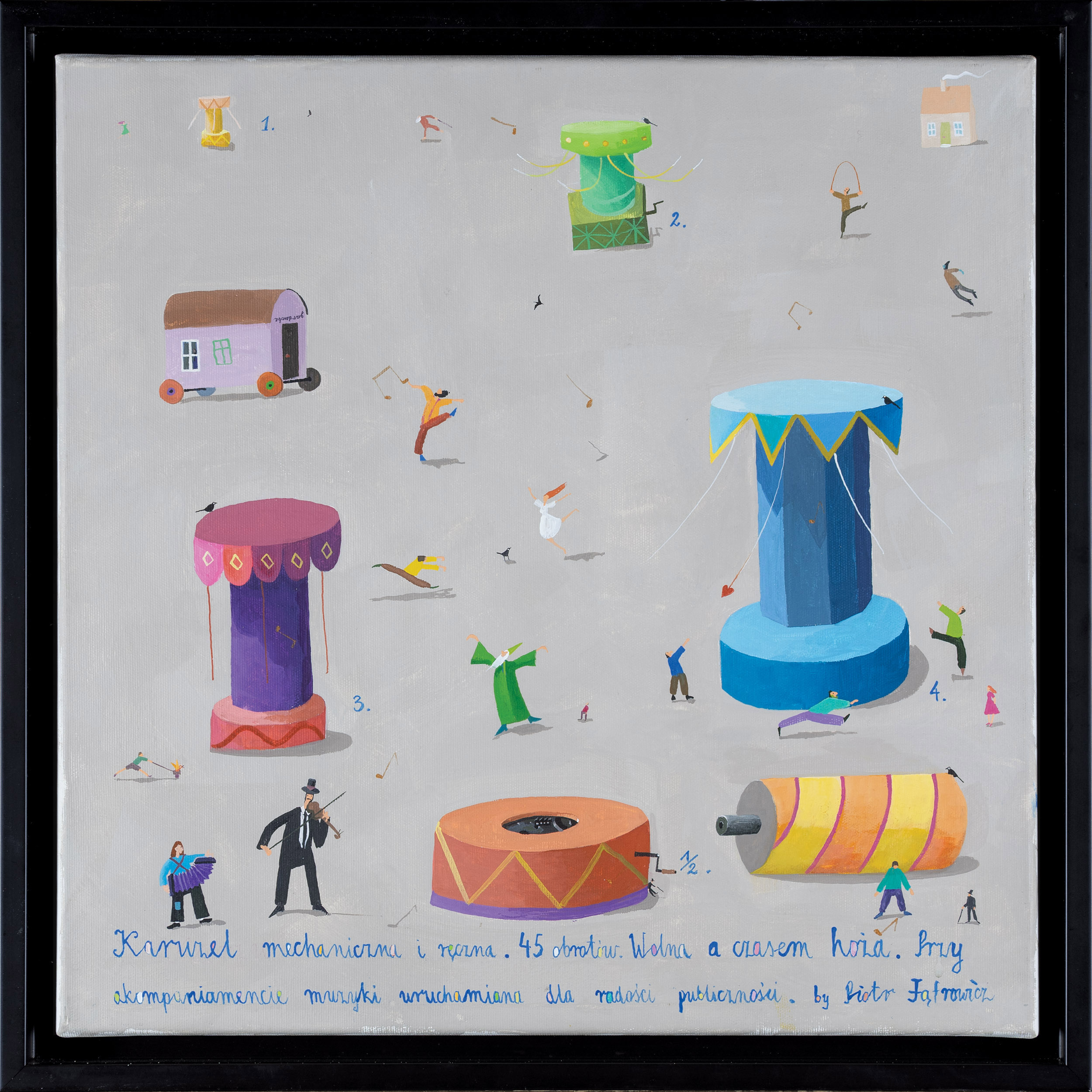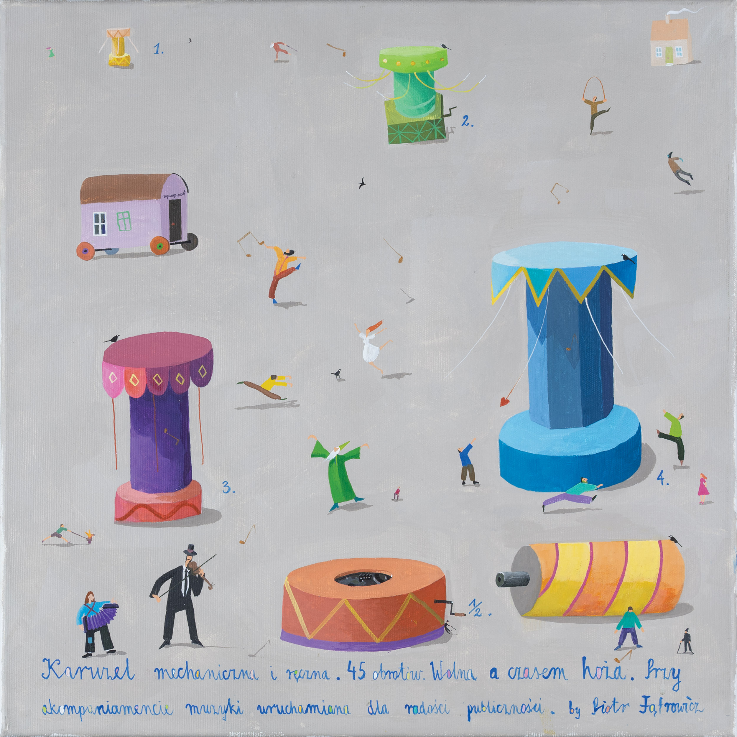 sygn. u dołu: Karuzel mechaniczna i ręczna. 45 obrotów. Wolna a czasem hoża. Przy | akompaniamencie muzyki uruchamiana dla radości publiczności. by Piotr Fąfrowicz