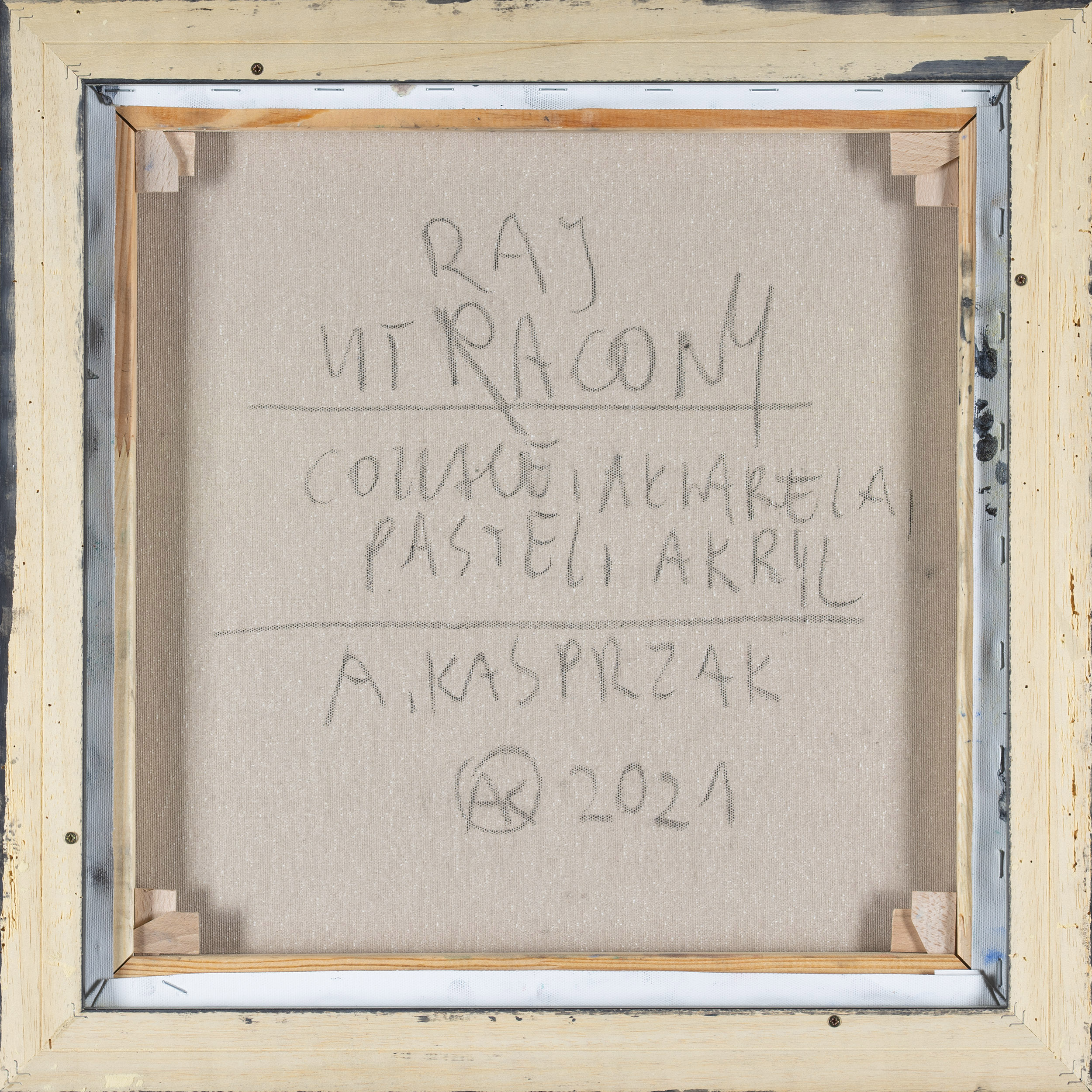 na odwr. na płótnie: RAJ | UTRACONY | COLLAGE, AKWARELA, | PASTEL, AKRYL | A. KASPRZAK | AK [monogram...