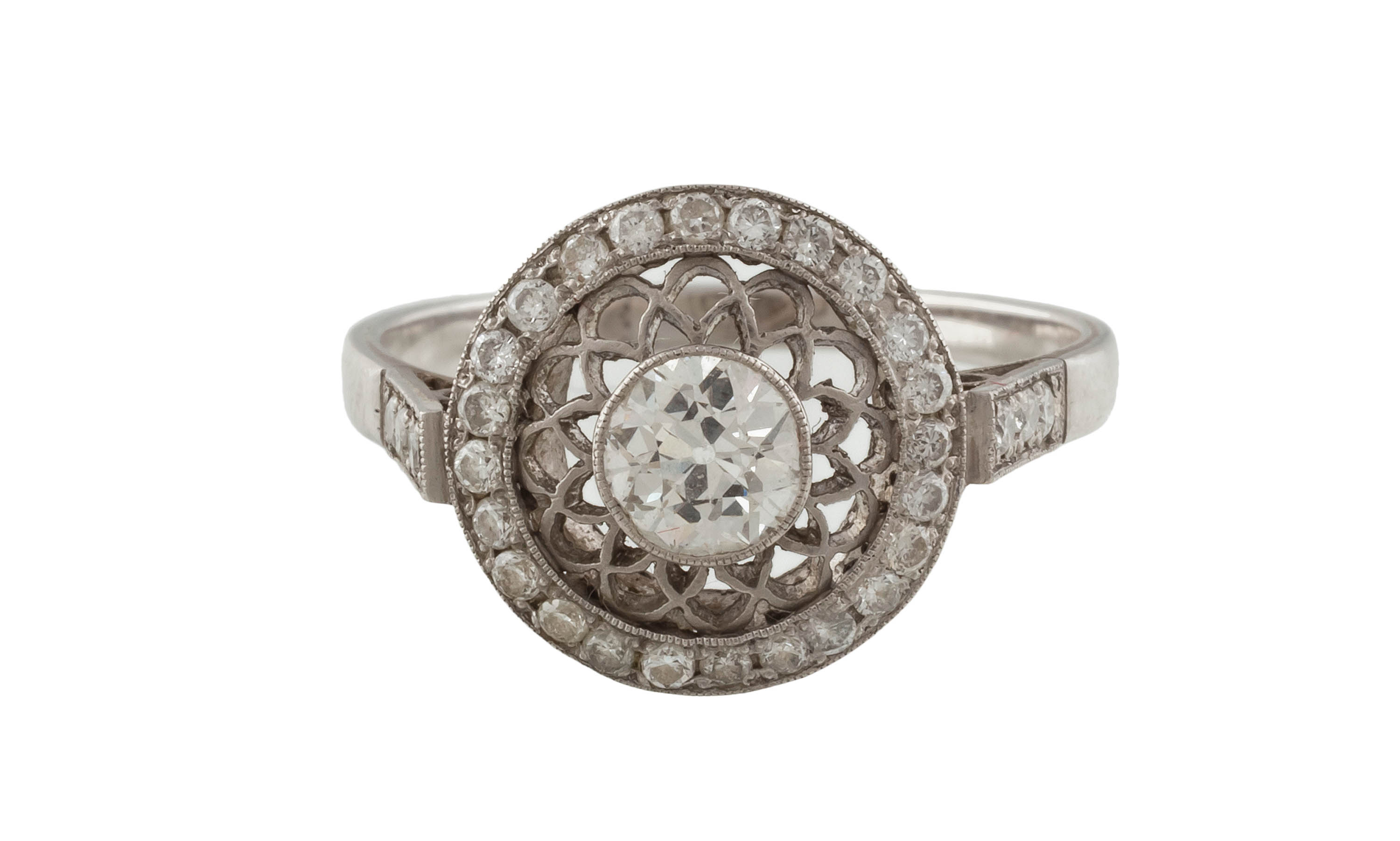 platyna, pr. 0,950, m. 4,10 g, diament w starym szlifie brylantowym ok. 0,50 ct, G-H/SI, 30 szt. brylantów łącznie ok. 0,30 ct, H-I/SI-P