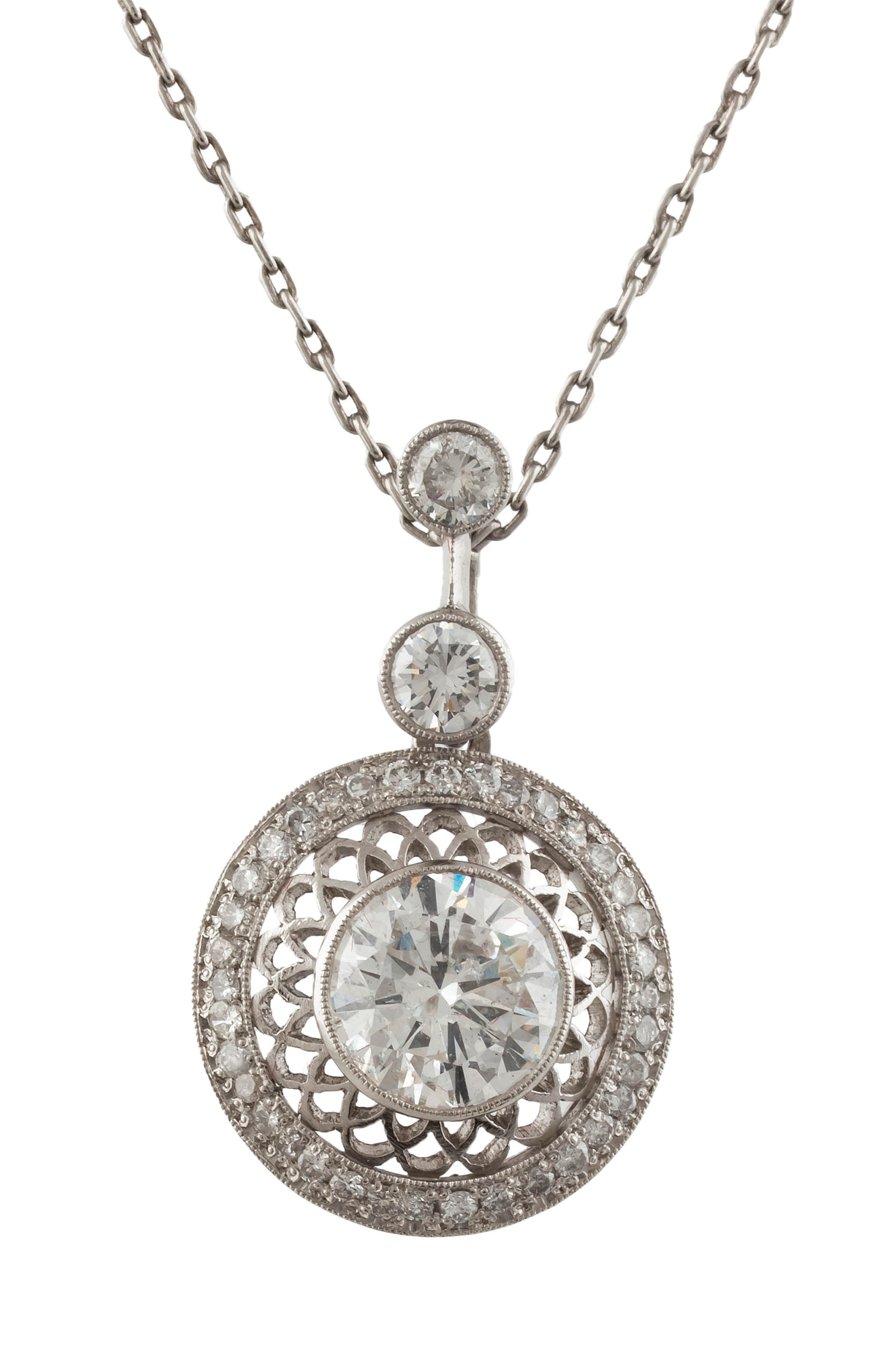 platyna, pr. 0,950, m. 4,60 g, brylant ok. 2,53 ct, F-G/P1, 38 szt. brylantów łącznie ok. 0,83 ct, G-H/SI-P3, łańcuszek: platyna, pr. ok. 0,950, m. 3,34 g