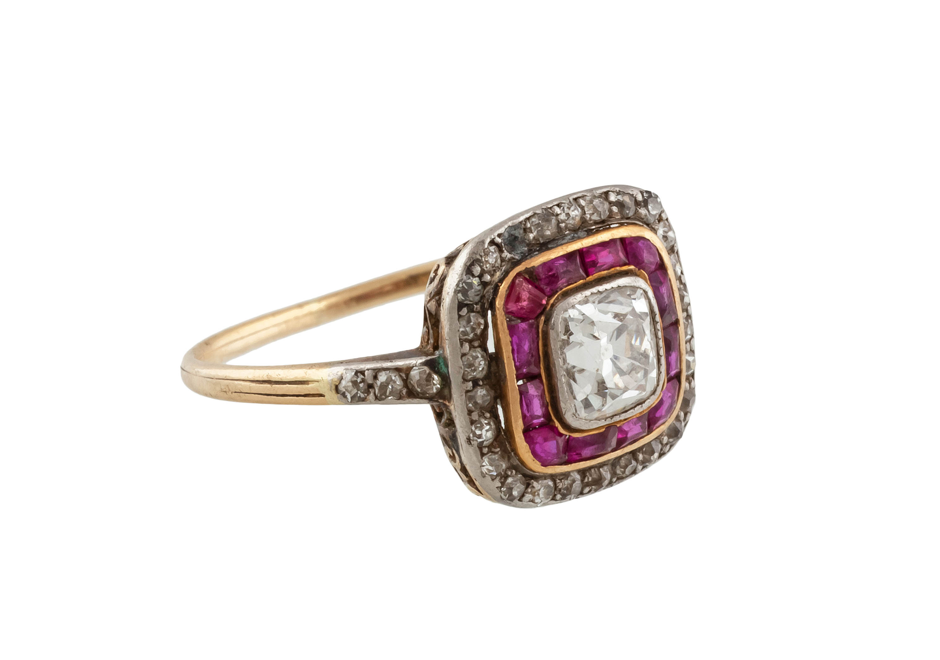 złoto, pr. 0,750, platyna, m. 2,20 g, centralnie diament ok. 0,63 ct, I-J/VS2, 12 szt. syntetycznych rubinów, 31 szt. rozet diamentowych