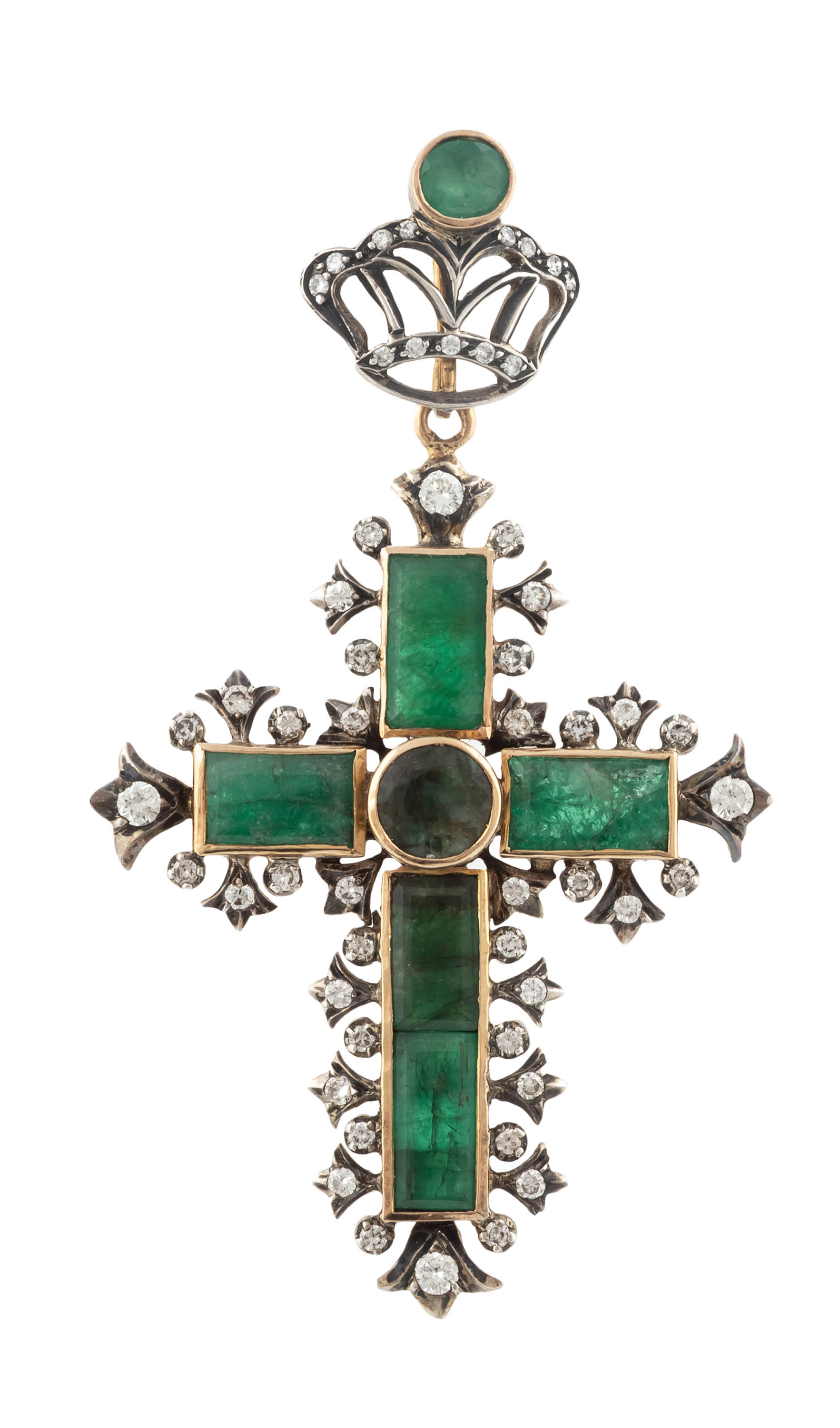 złoto, pr. ok. 0,585, srebro, 7 szt. szmaragdów łącznie ok. 9,90 ct, 53 szt. brylantów łącznie ok. 1,10 ct, H-J/VS-SI