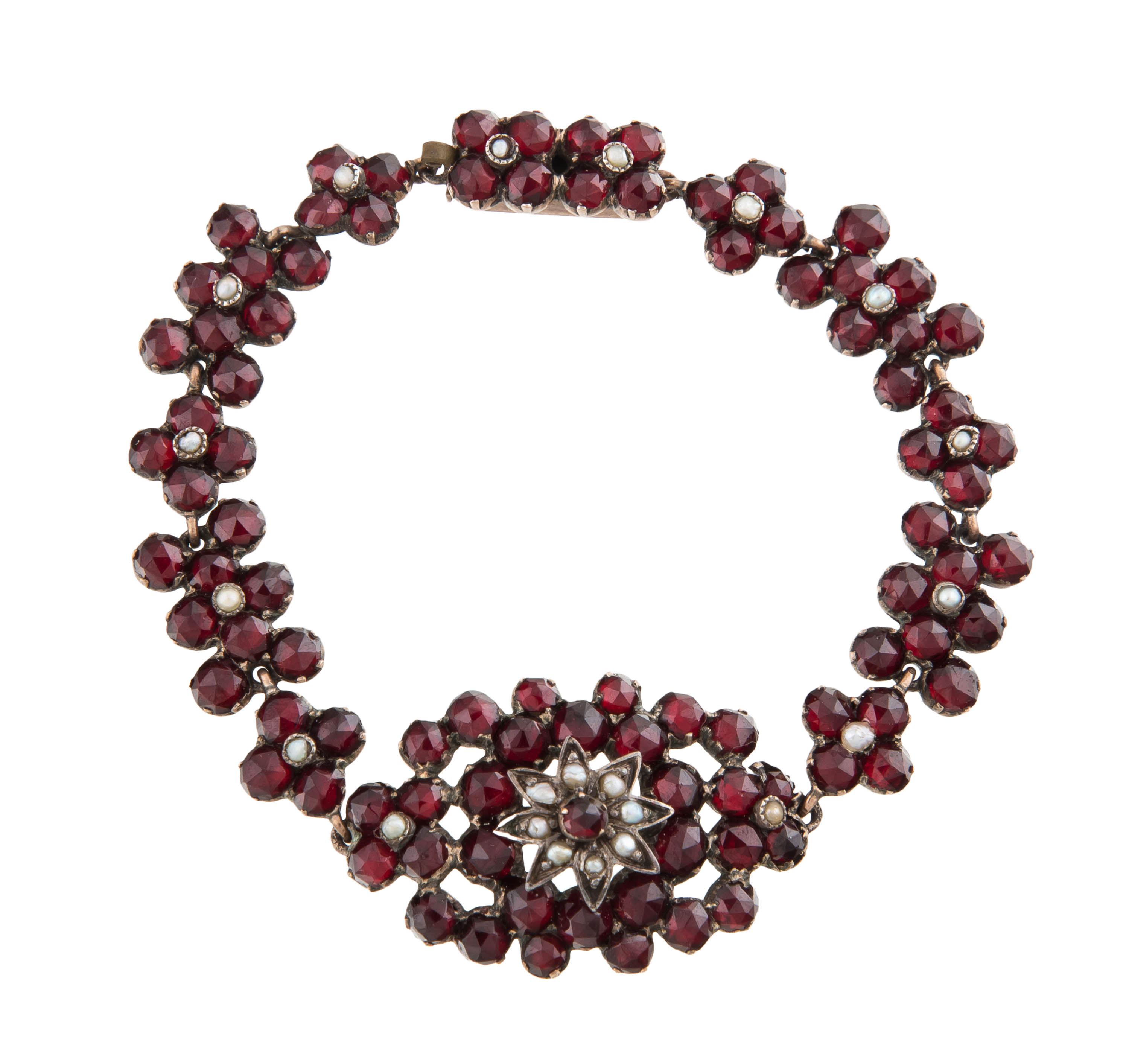 metal złocony, m. 10,7 g, 22 szt. półpereł, granaty