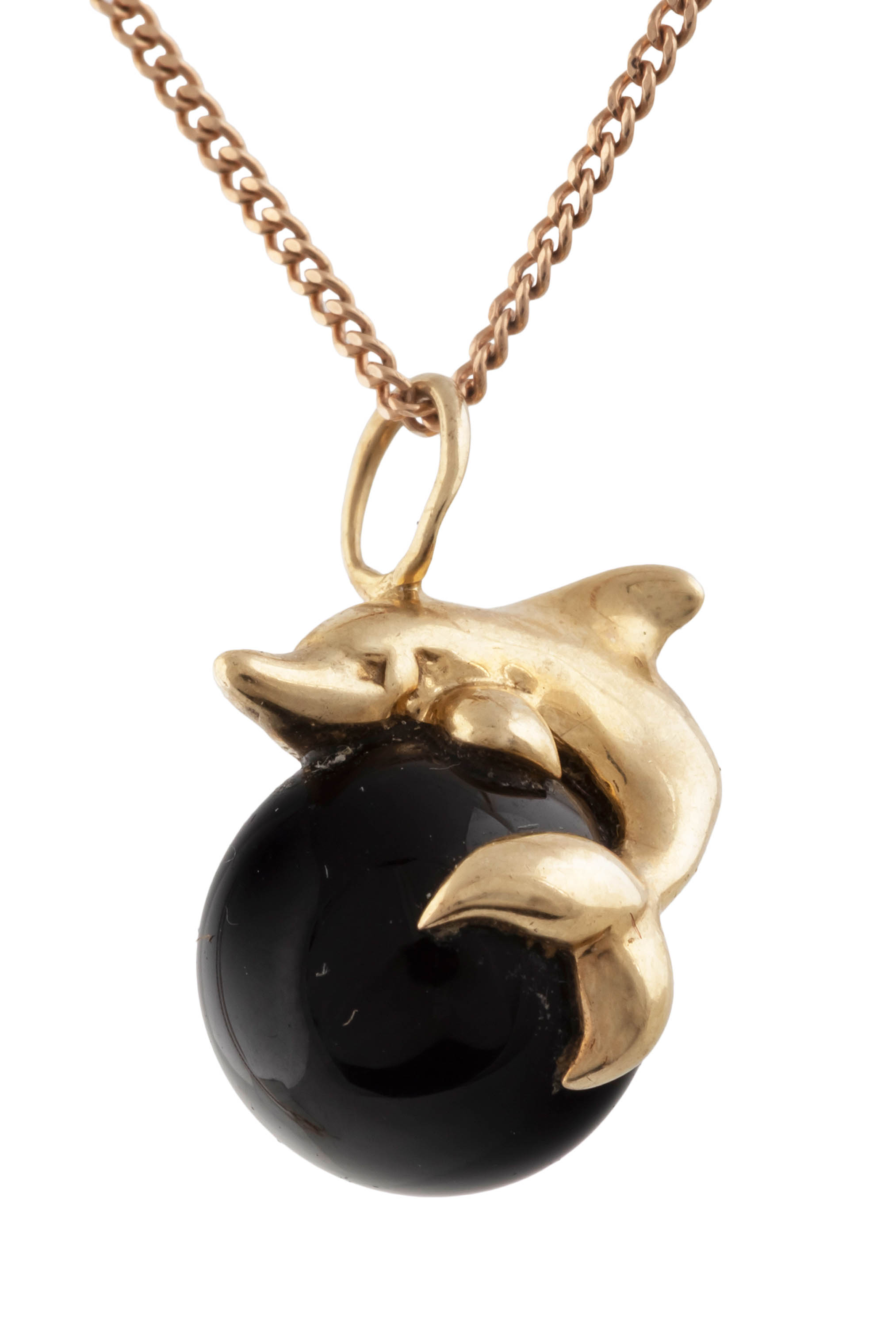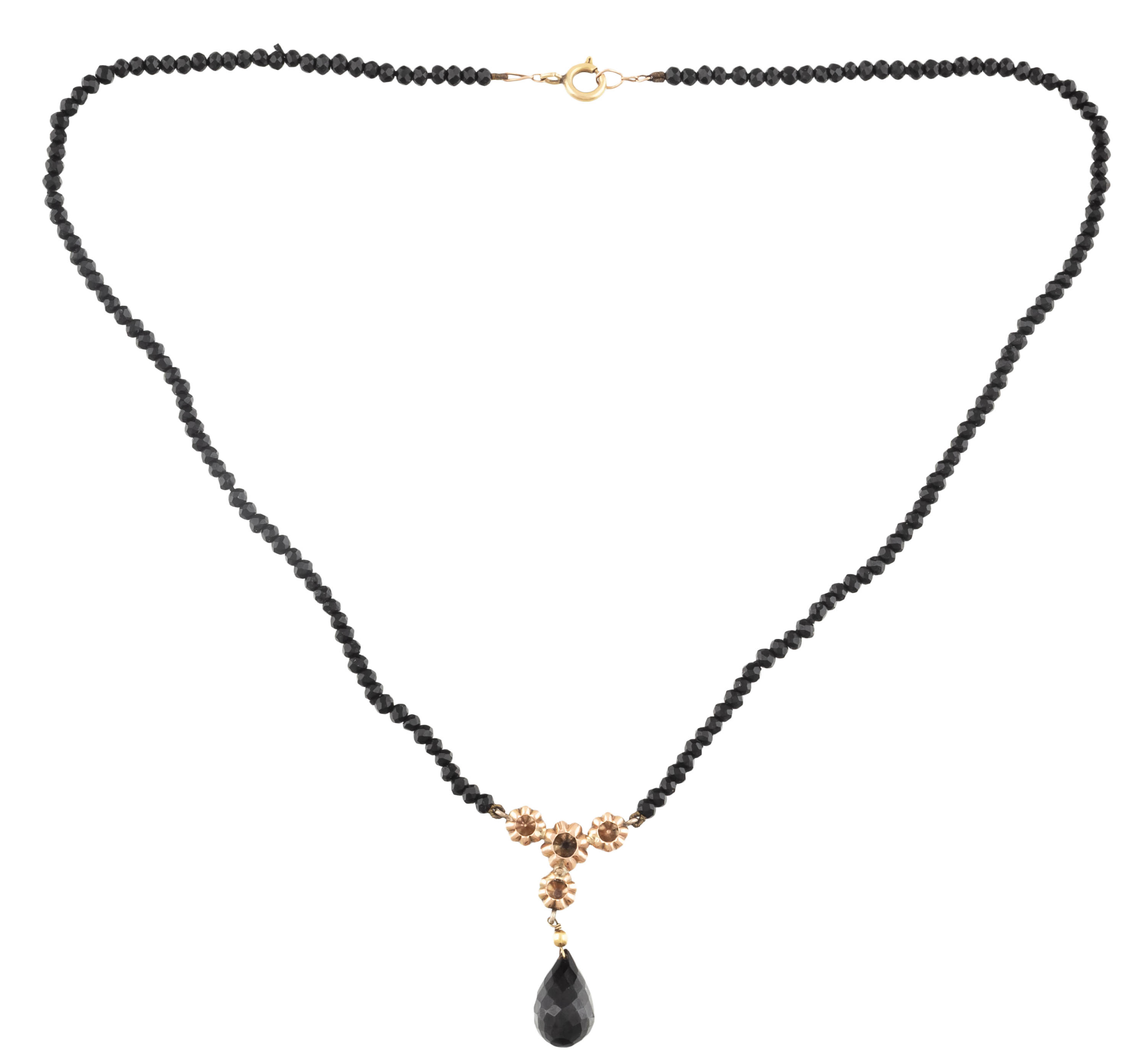 złoto, pr. ok. 0,580, m. 8,06 g, 1 szt. onyks fasetowany w formie kropli, 4 szt. półrozet holenderskich, łańcuszek zdobiony fasetowanymi onyksami, dł. 42 cm, zawiesia: 3,2 x 2 cm
