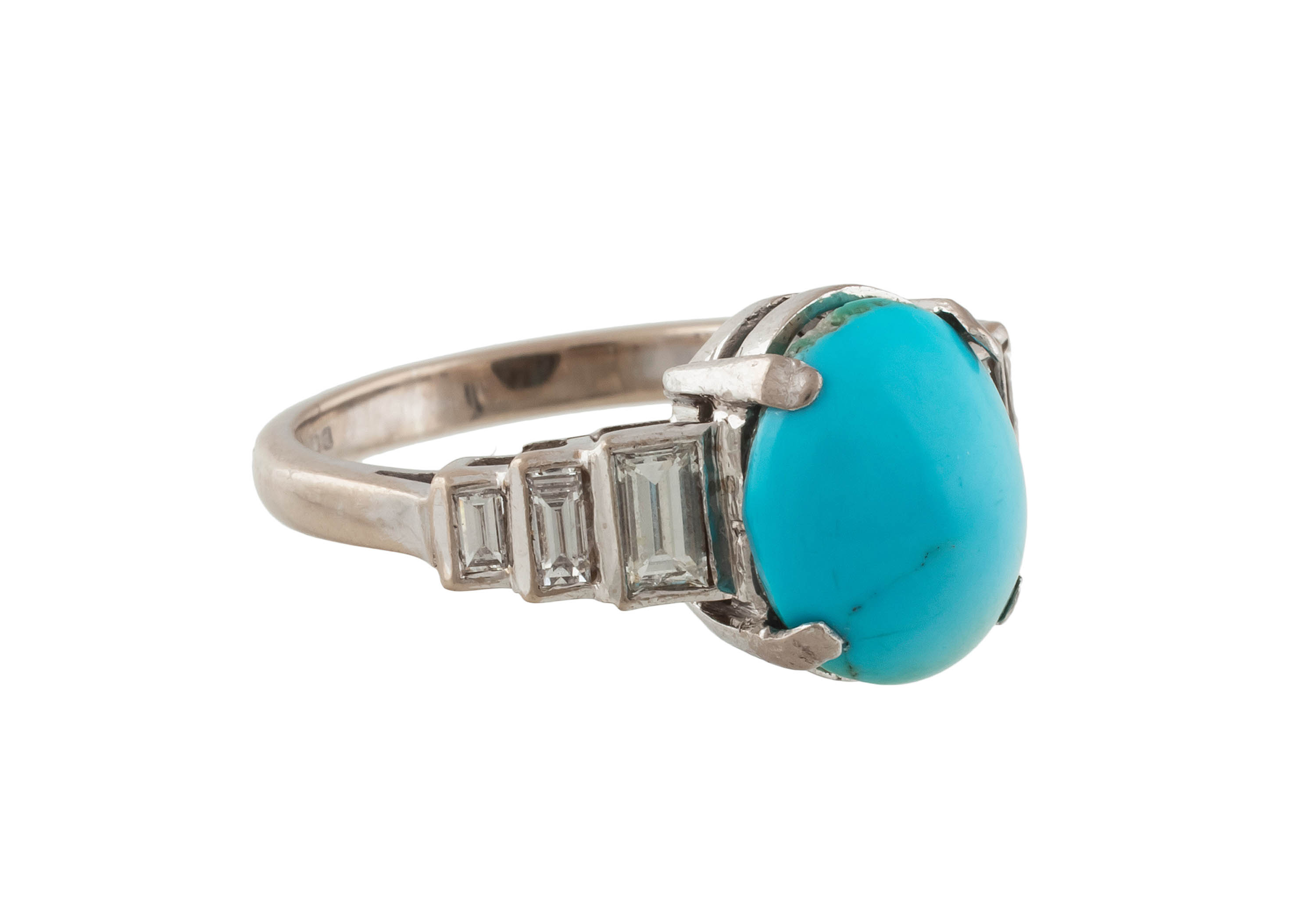 złoto, pr. ok. 0,750, m. 5,65 g, turkus, 6 szt. diamentów w szlifie bagiet łącznie ok. 0,44 ct, H-I/VS