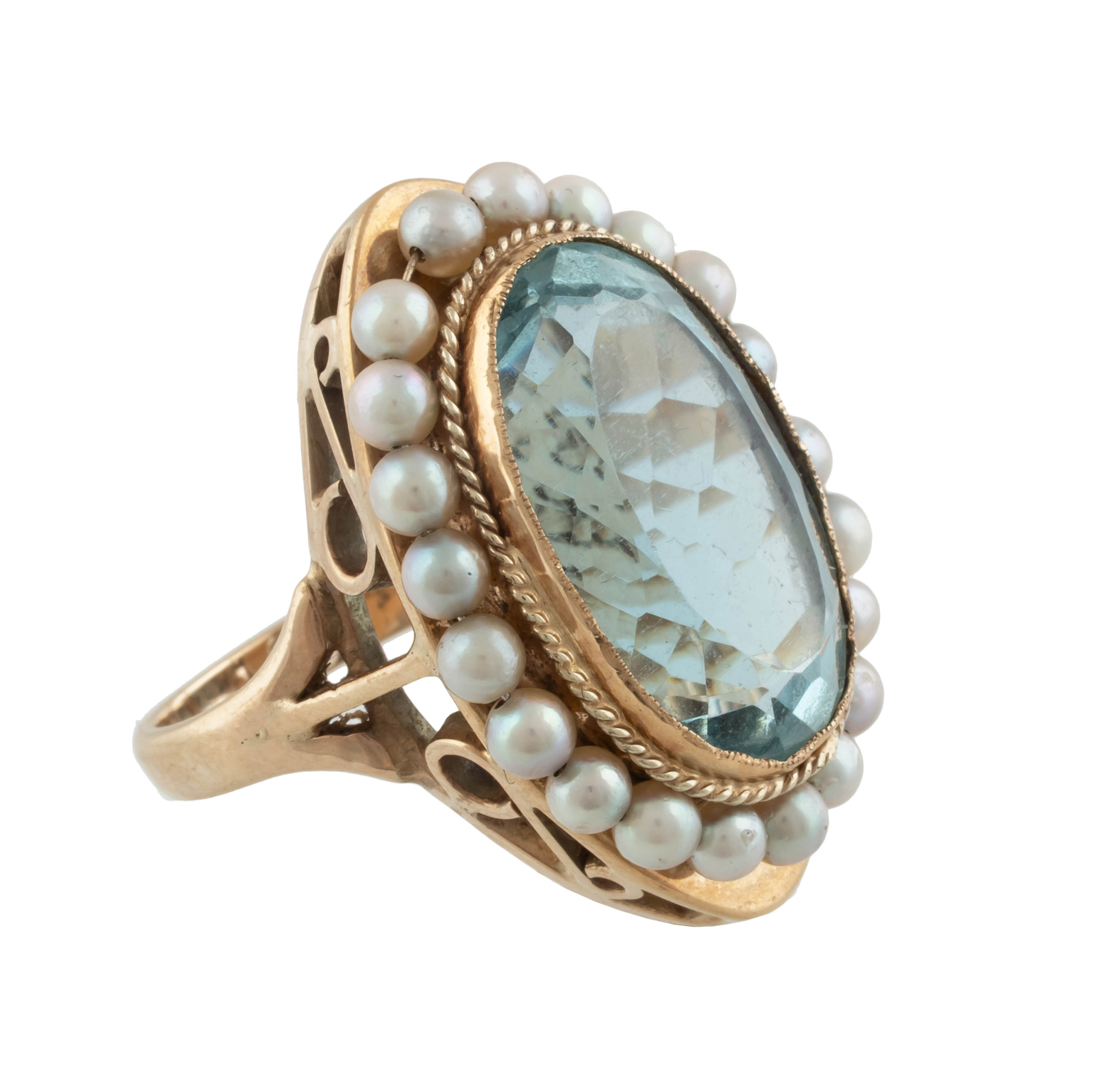 złoto, pr. oK. 0,375, m. 12,87 g, akwamaryn ok. 14 ct, perły hodowane