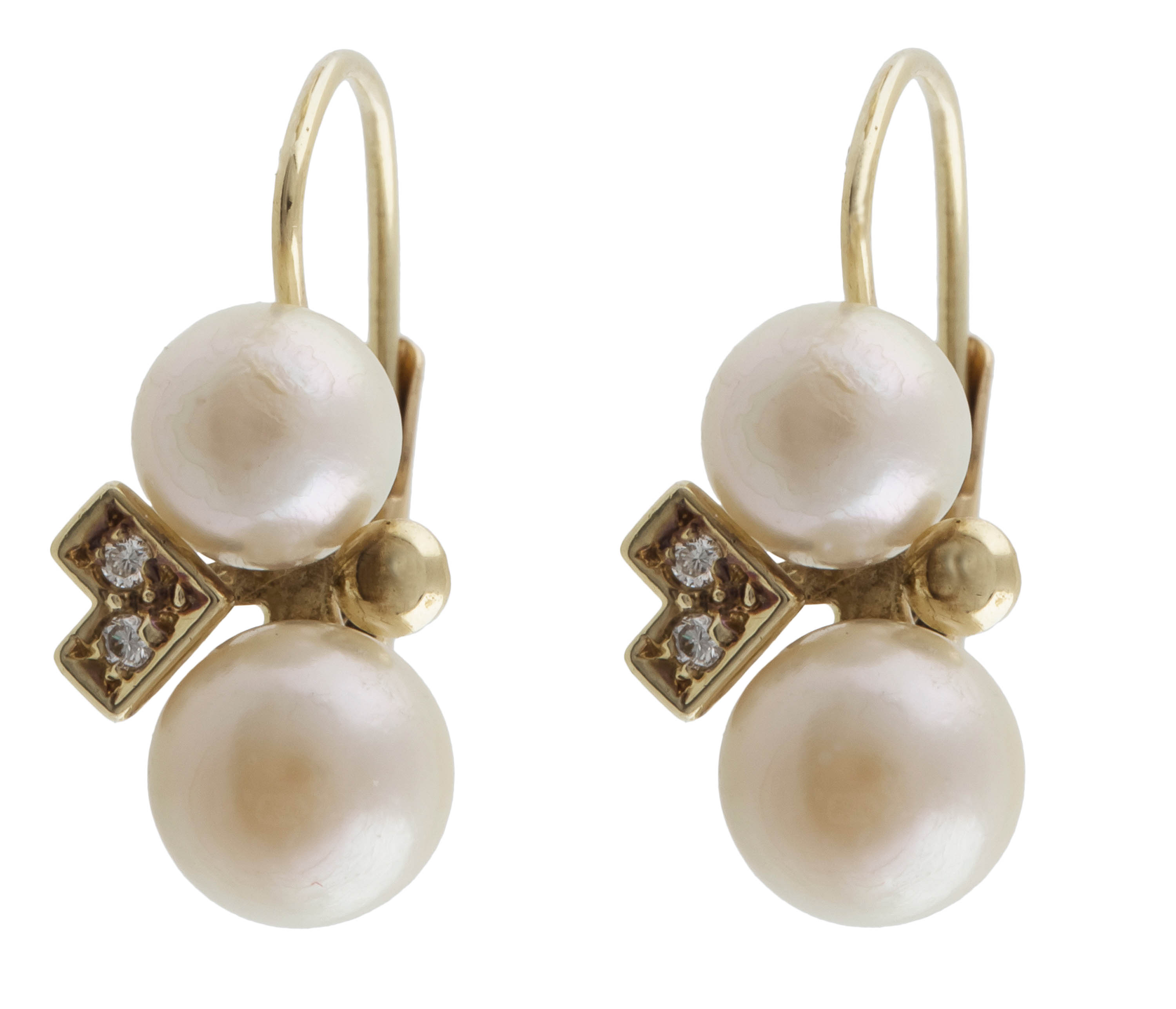 złoto, pr. 0,585, m. 2,84 g, 2 szt. pereł hodowanych śr. ok. 6,60 mm, 6 szt. diamentów w szlifie uproszczonym łącznie ok. 0,09 ct, I-J/SI