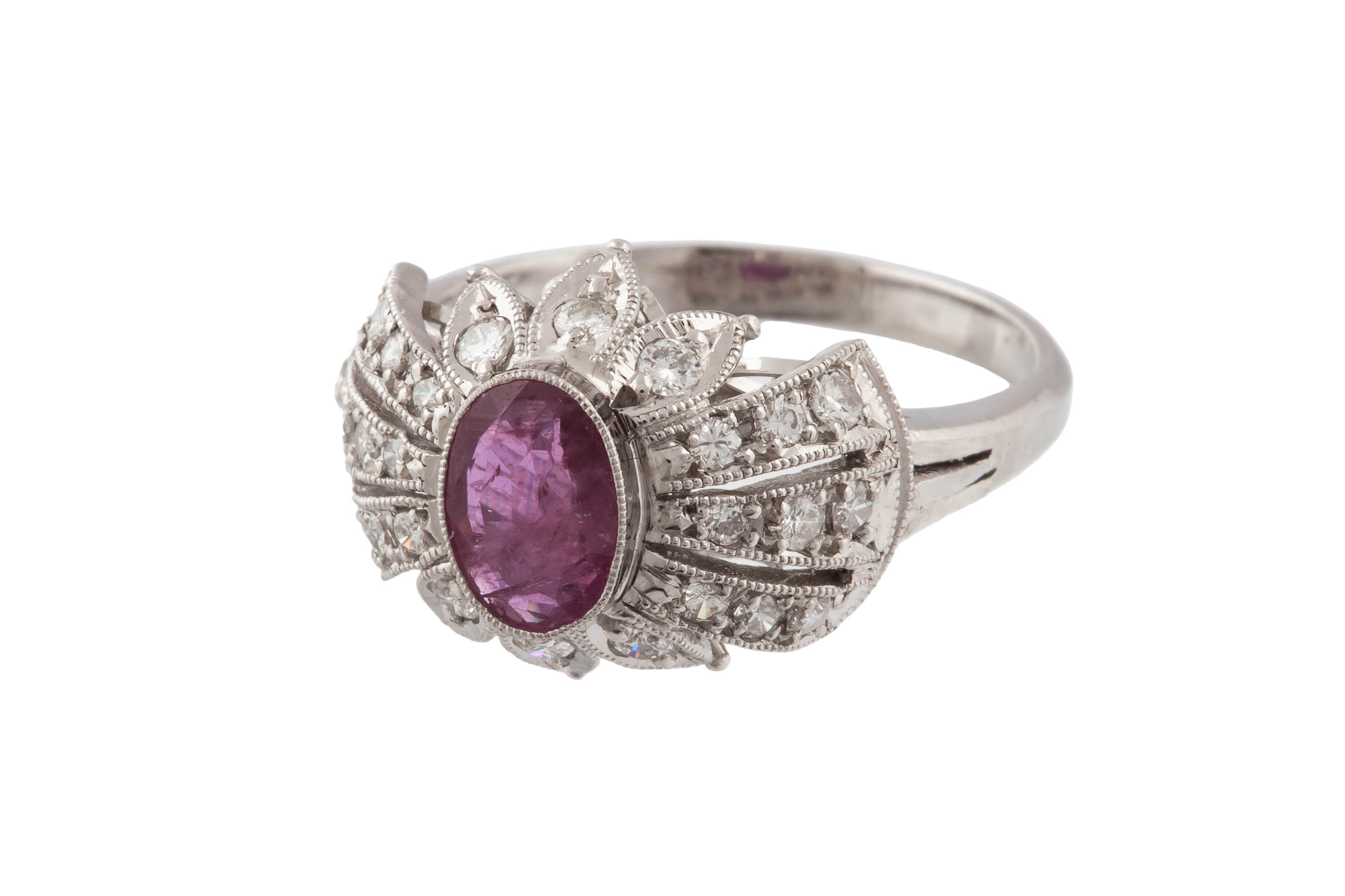platyna, pr. 0,950, m. 5,65 g, rubin ok. 0,60 ct, 24 szt. brylantów łącznie ok. 0,36 ct, I-J/VS-SI