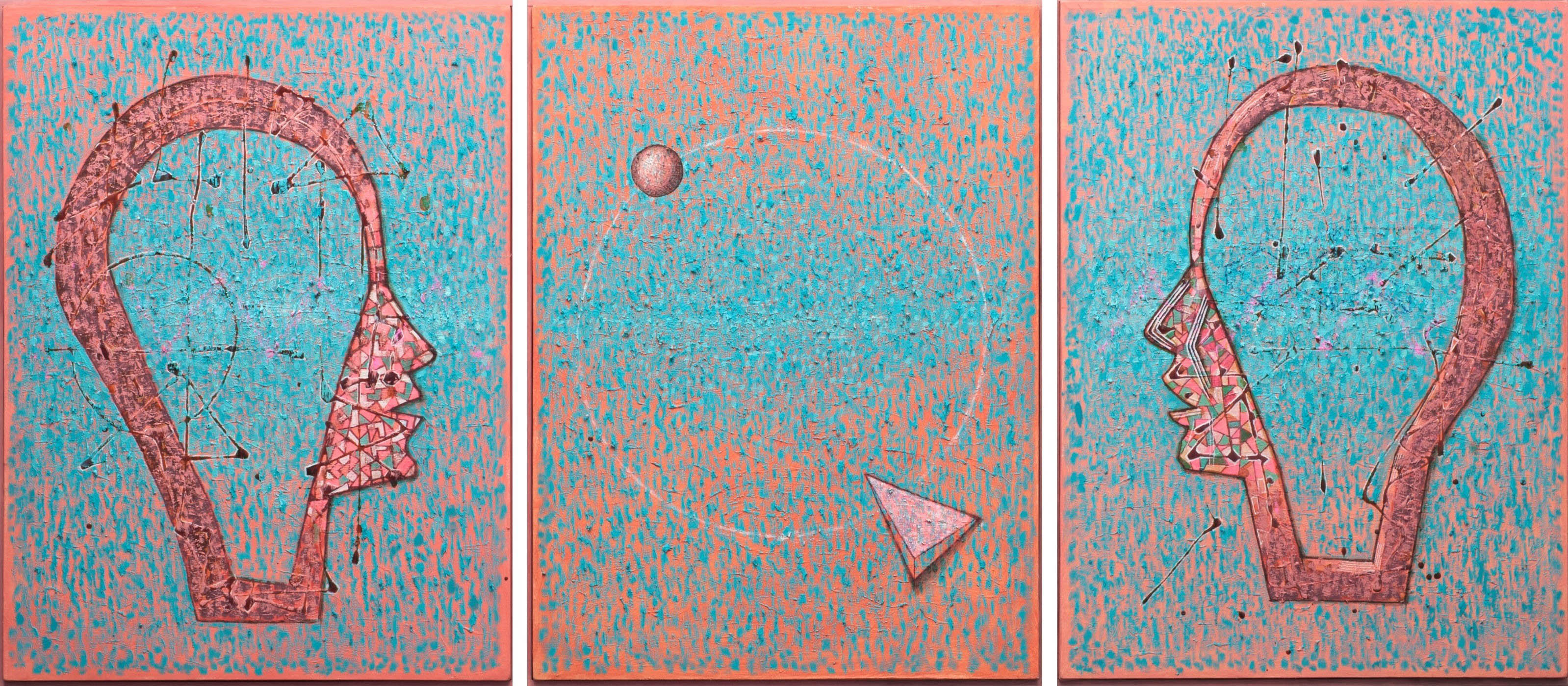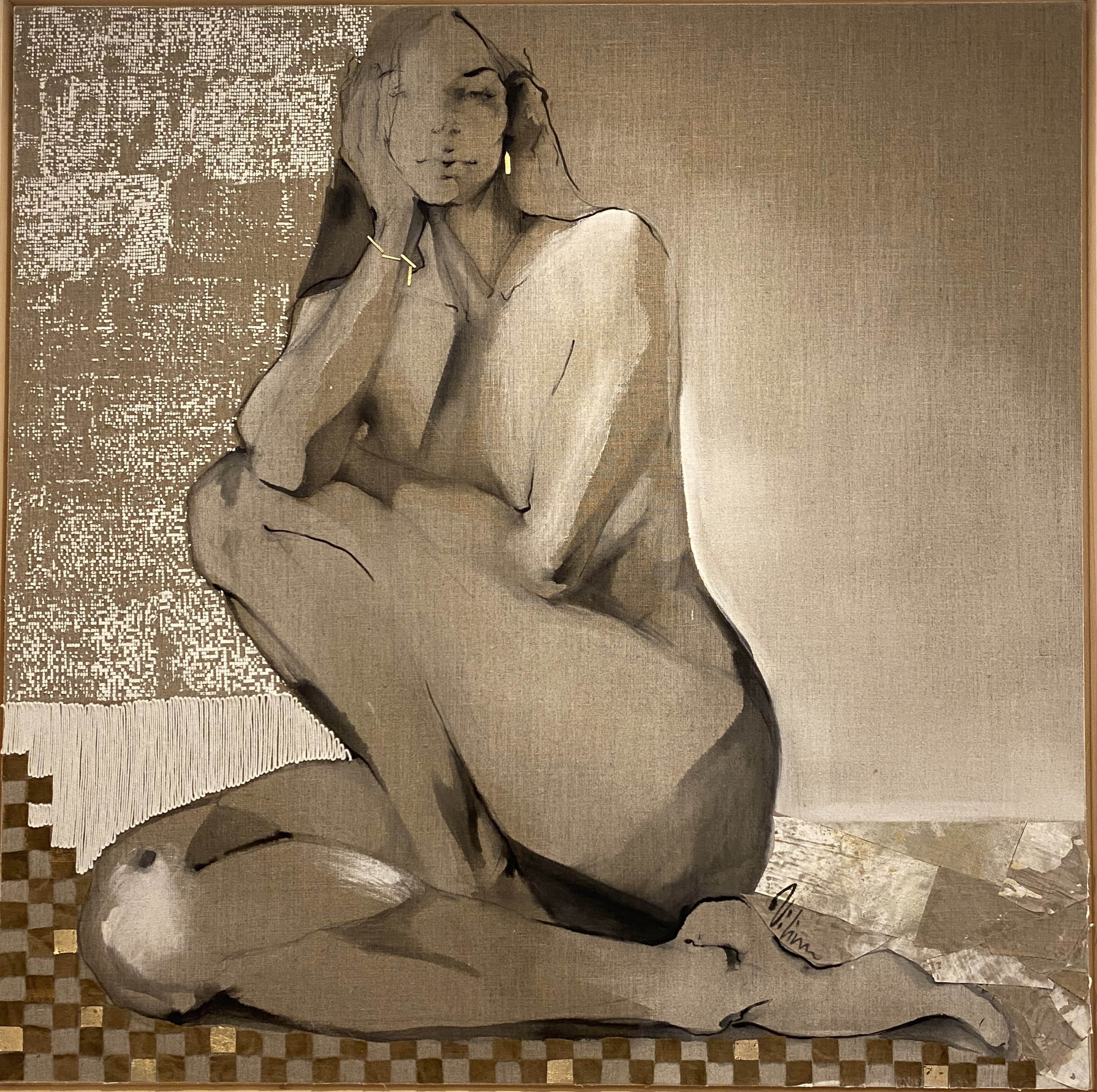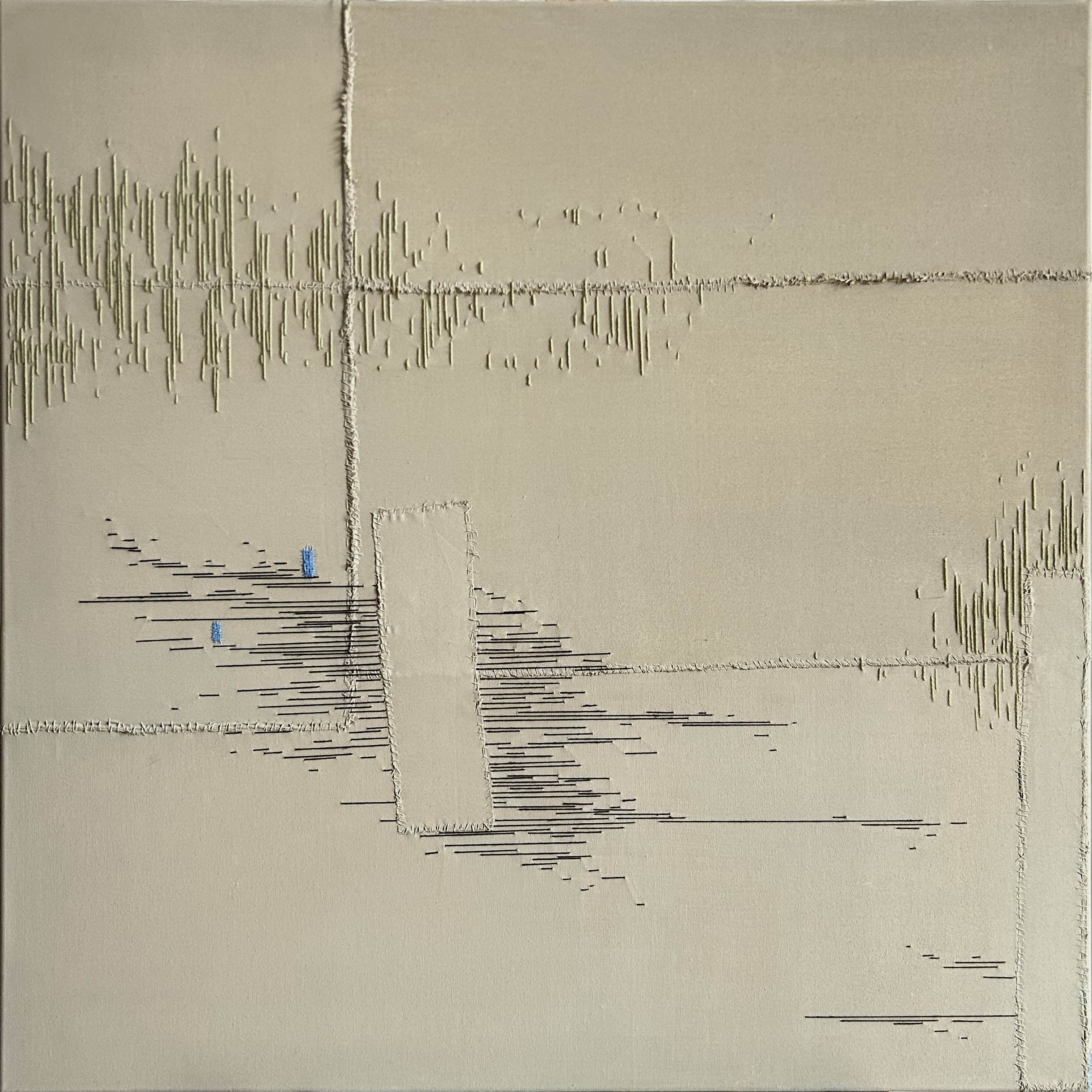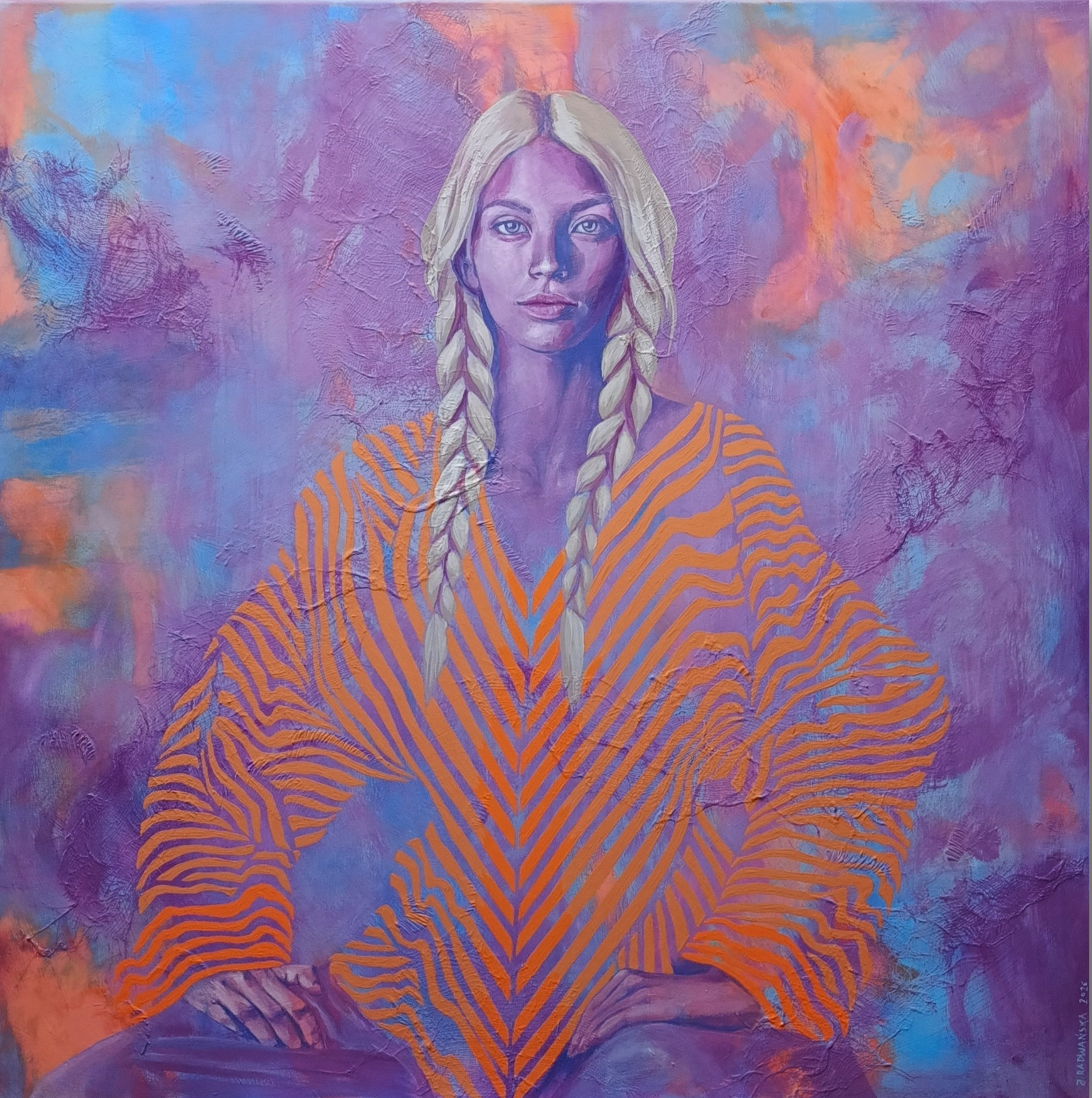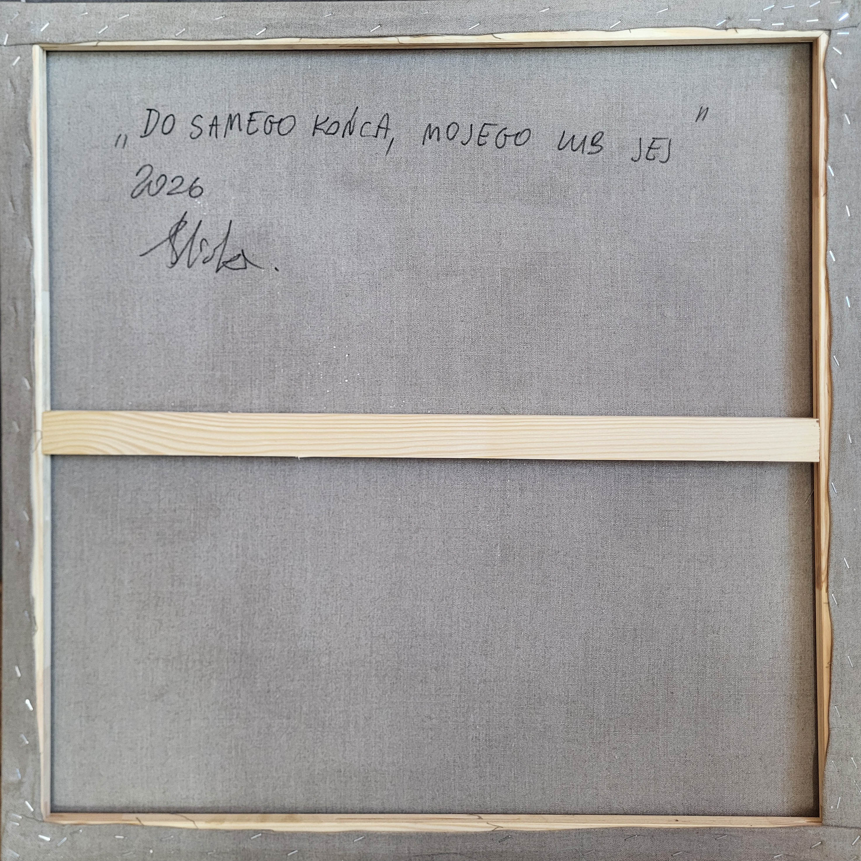 Technika własna, akryl, bawełna, szlagmetal, płótno, 120x120 cm.