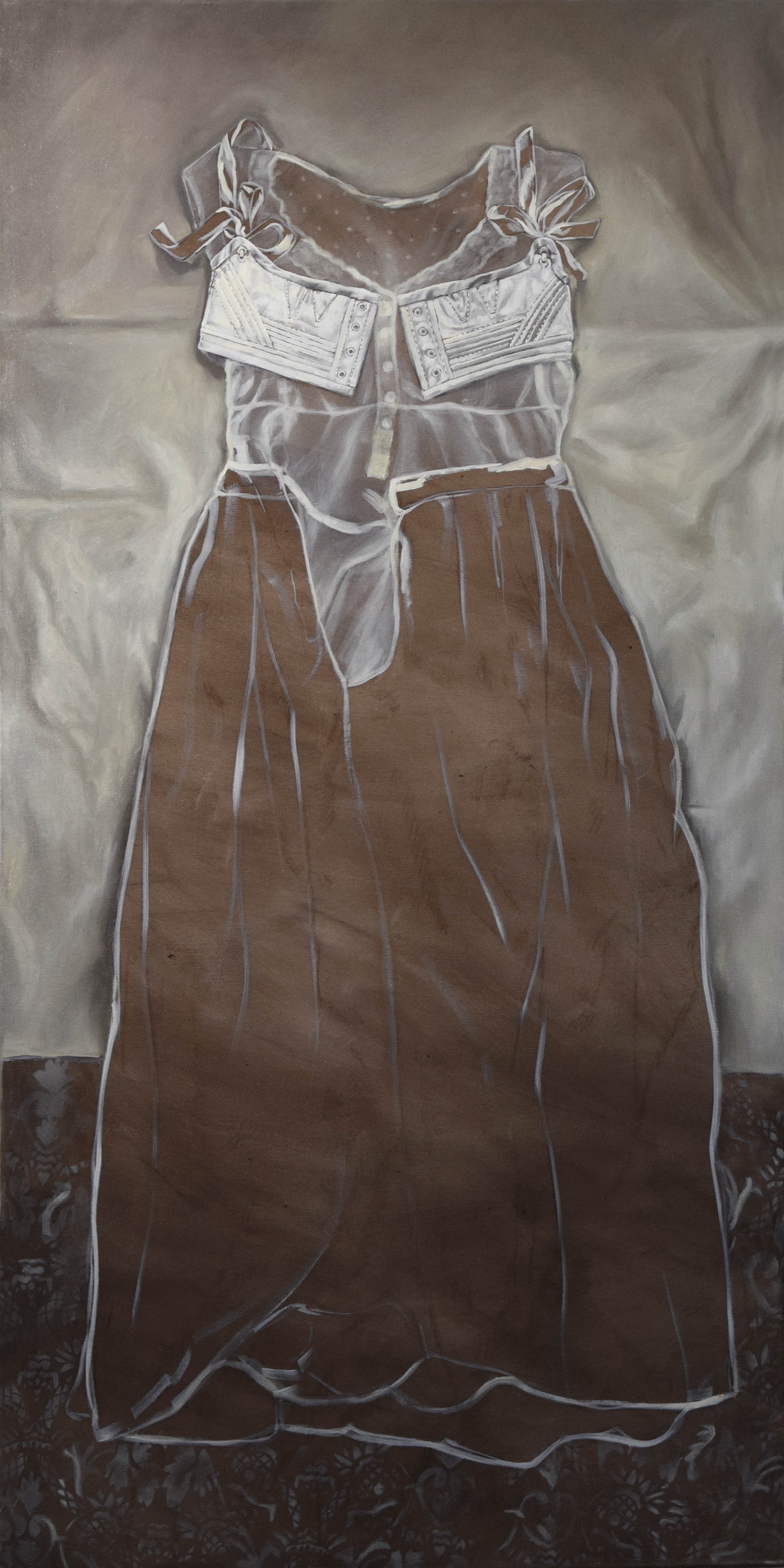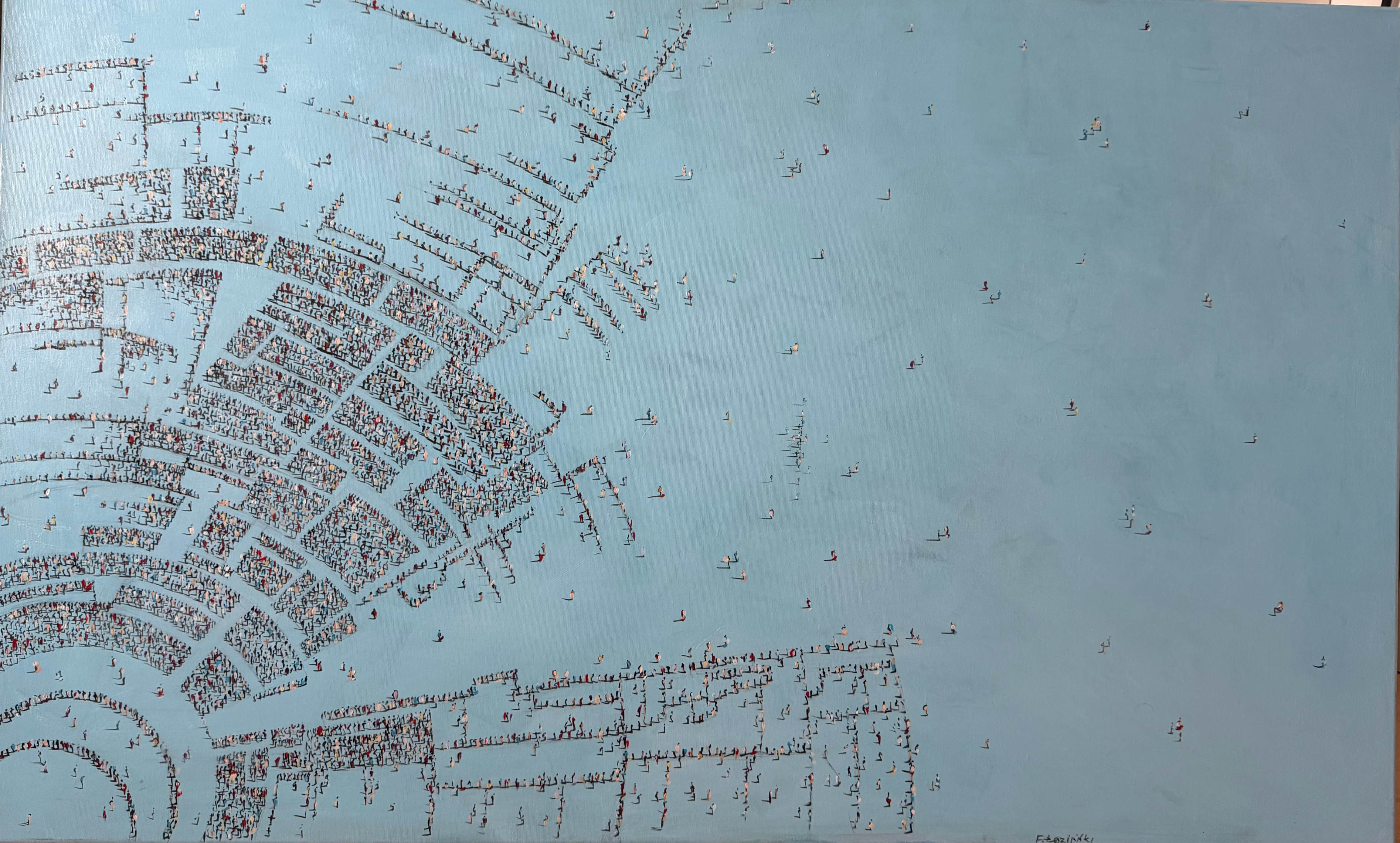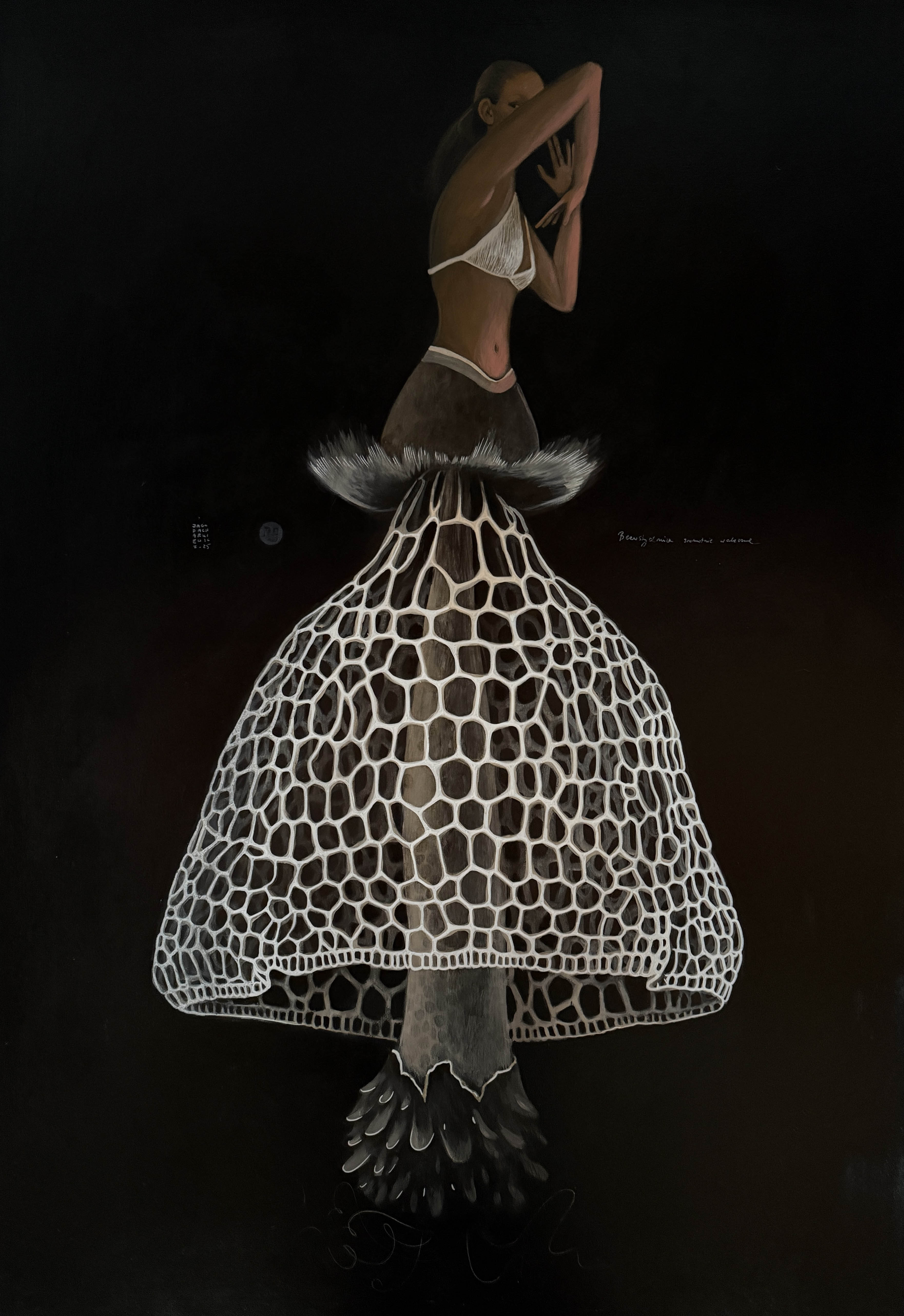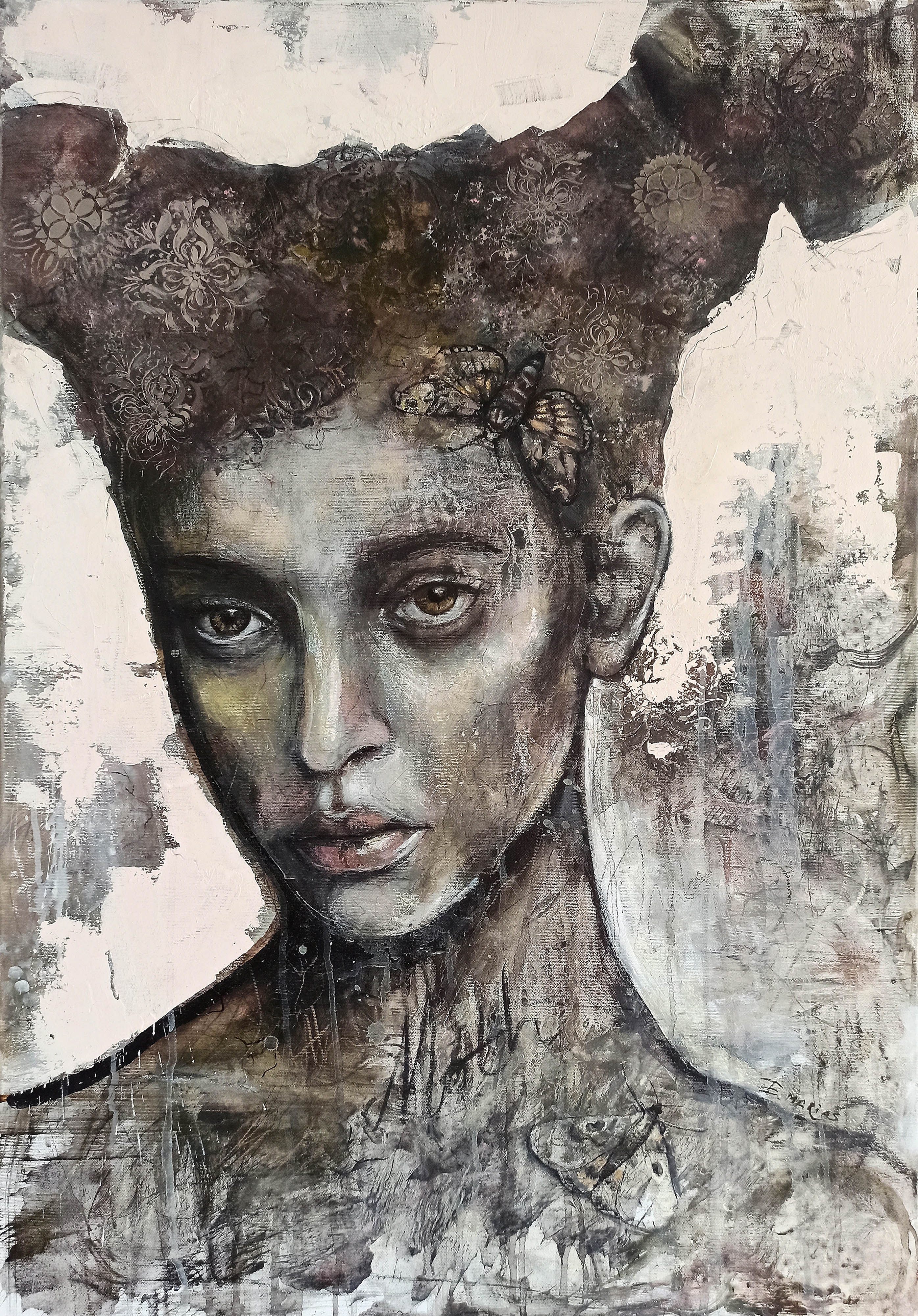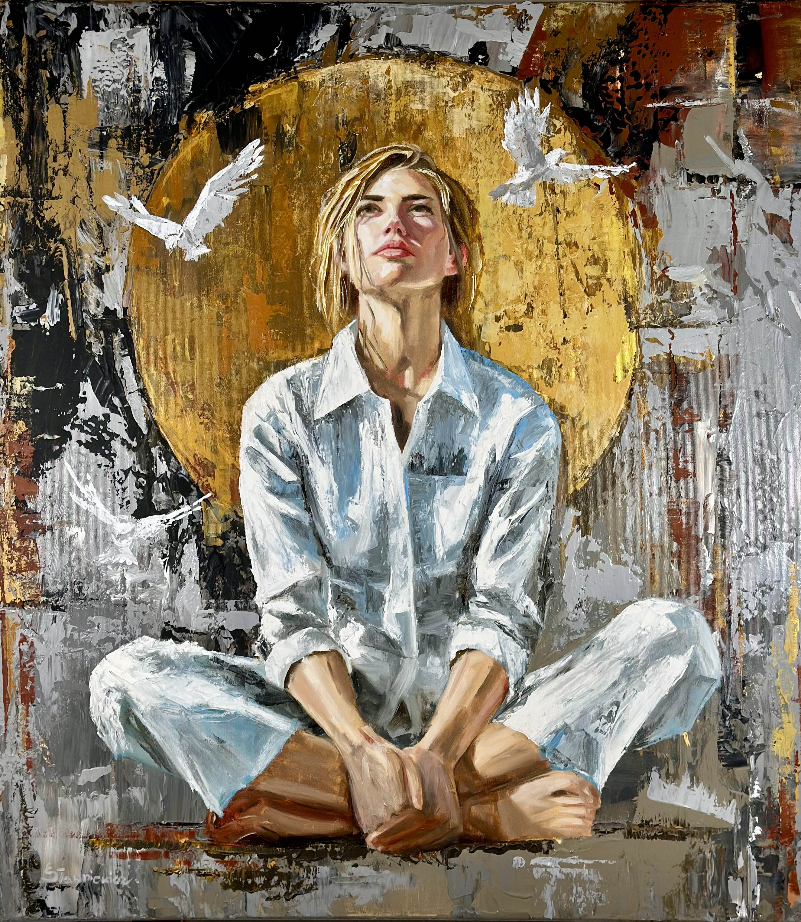 Technika własna, akryl, bawełna, szlagmetal, płótno, 120x120 cm.