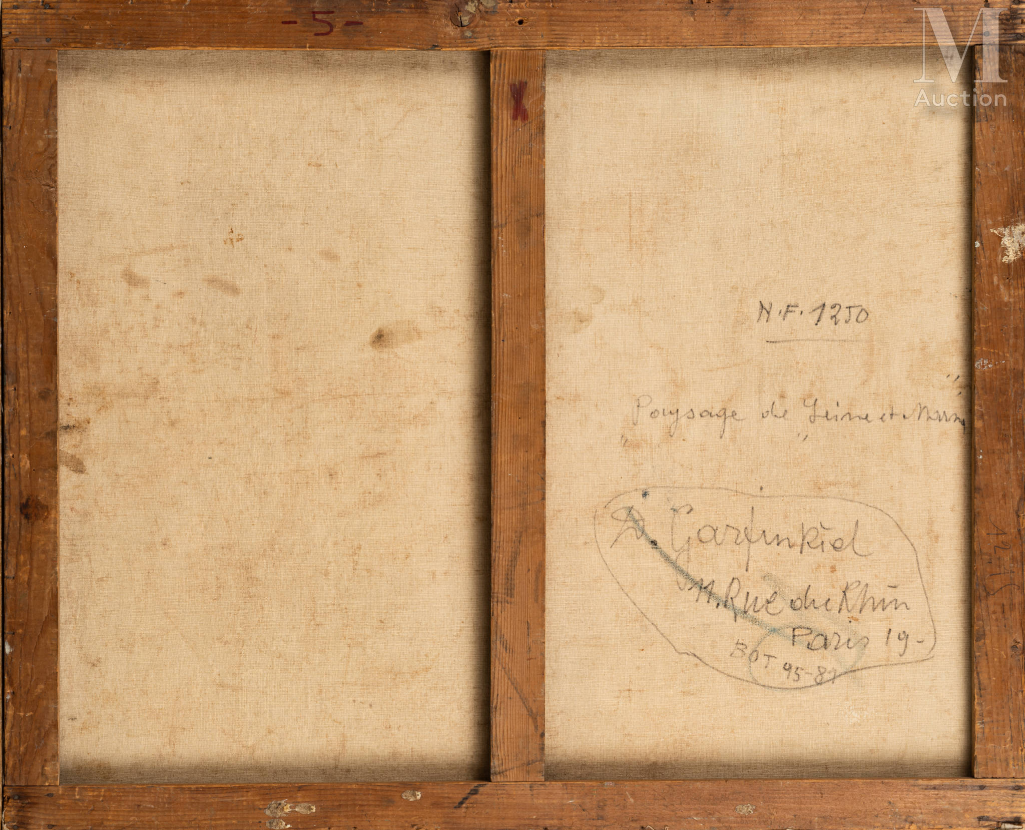 Na odwrocie płótna tytuł „Pejzaż z Sekwany i Marny” oraz kontrasygnata „D.Garfinkiel 11 Rue du Rhin Paris 19. BOT 95-81”.