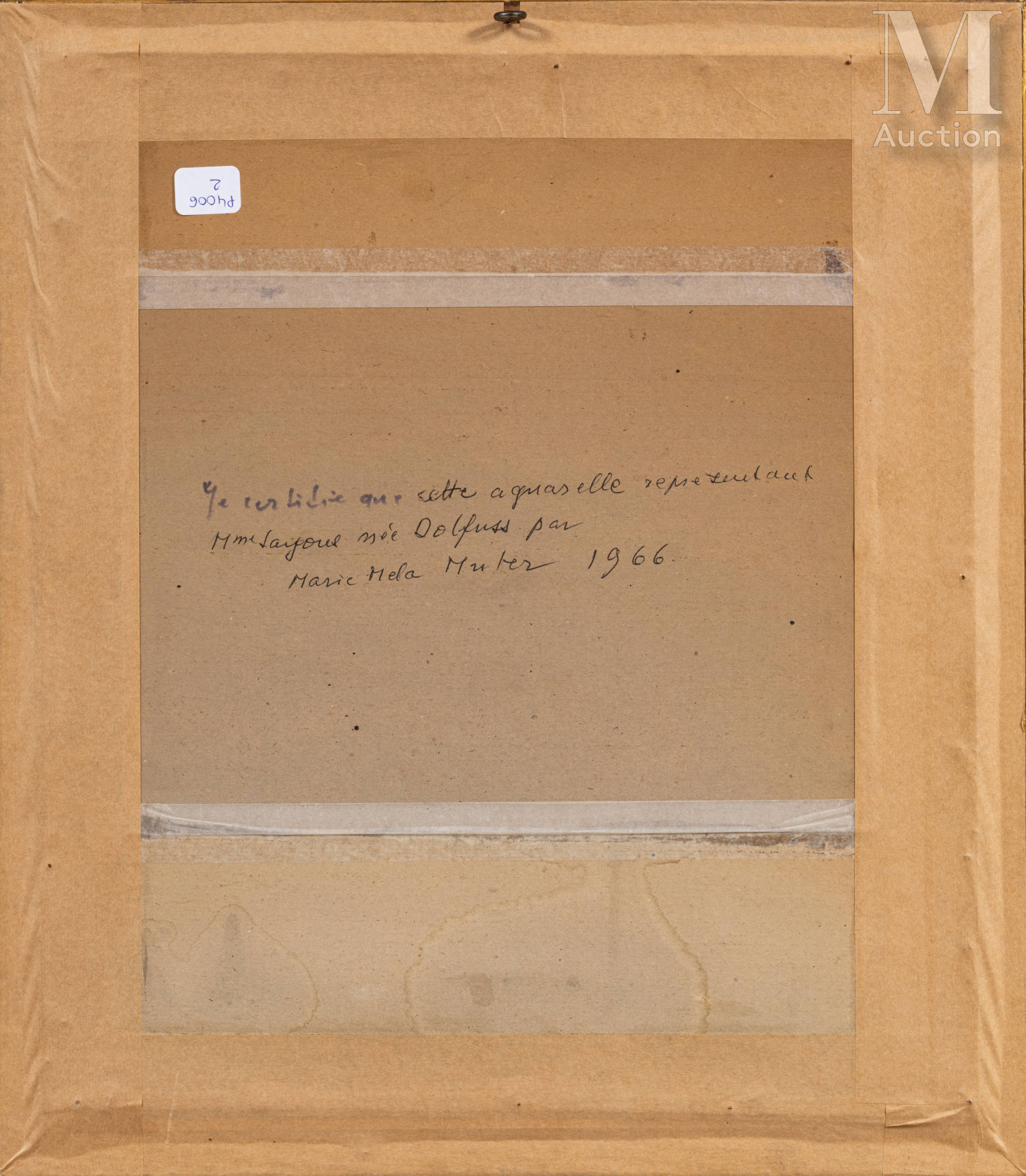Na odwrociu kartonu odręczna notatka: „Zaświadczam, że ta akwarela przedstawiająca panią Sayous z domu Dollfuss, autorstwa Marie Mela Muter, 1966 r.”