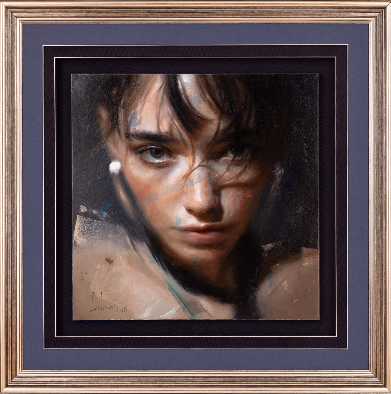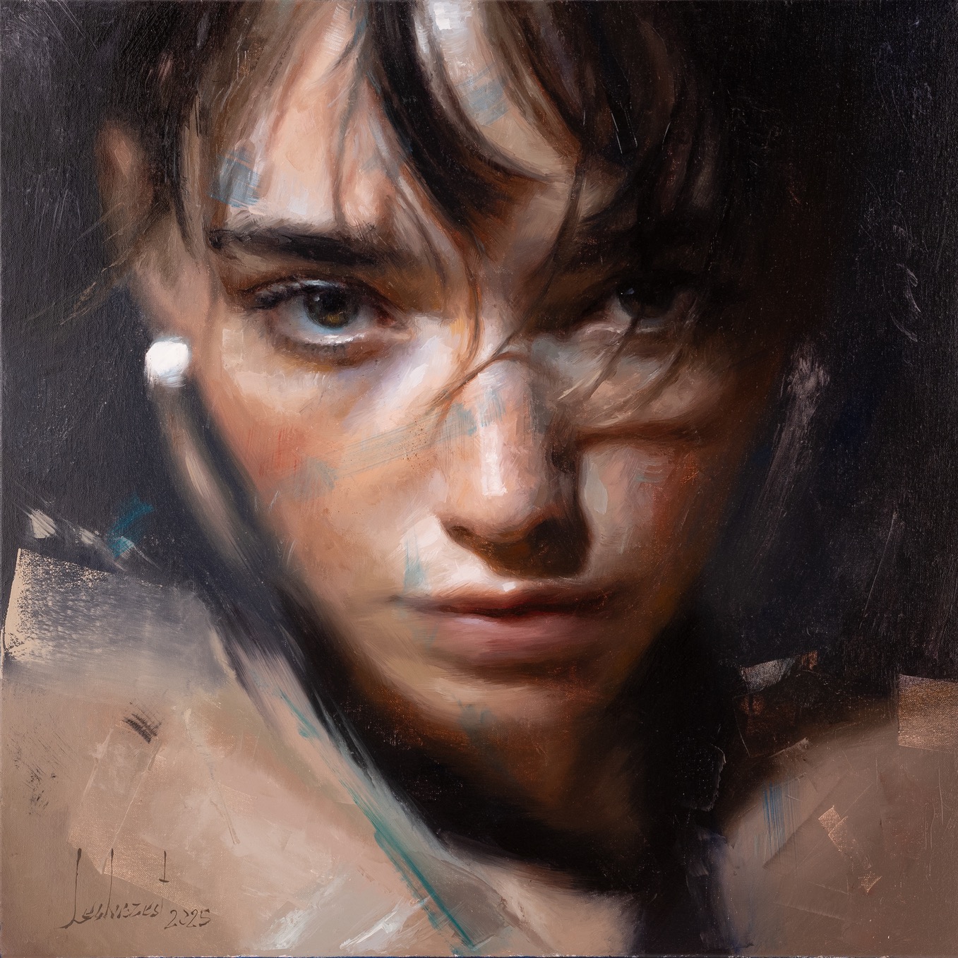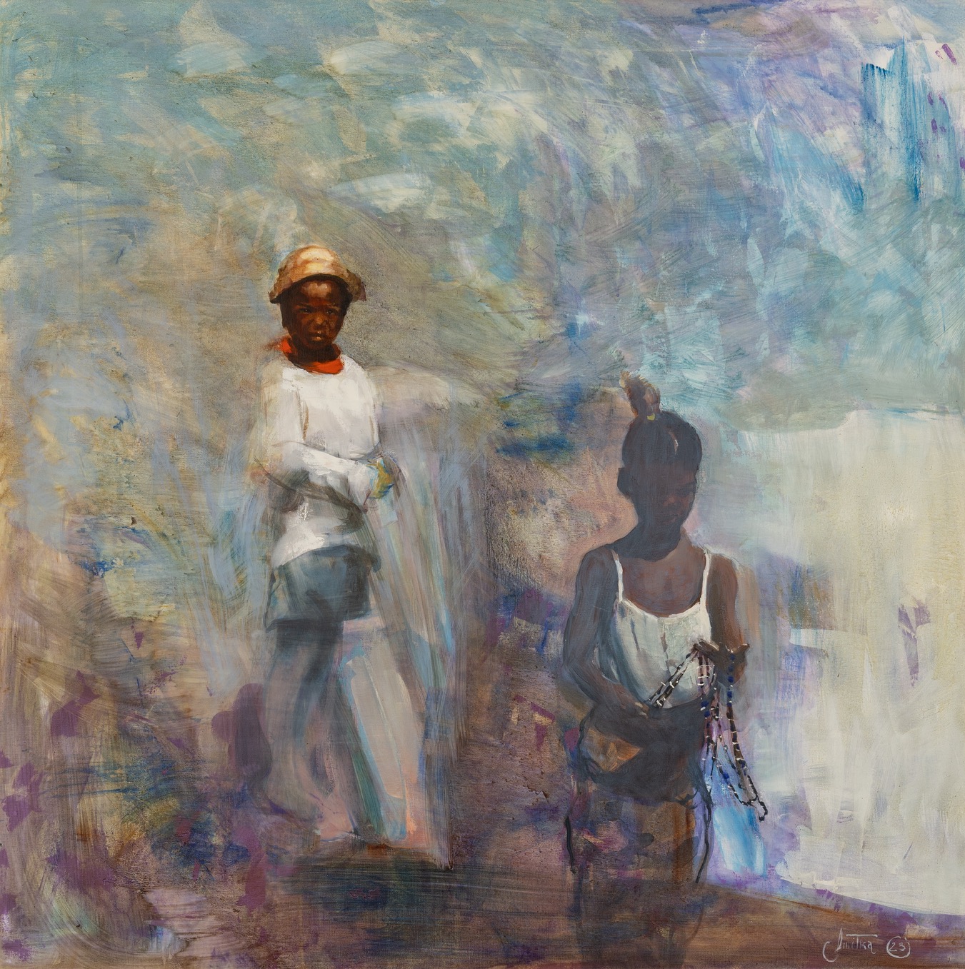 sygnowany p.d.: 'Smółka 25' oraz opisany na odwrocie: 'Michał Smółka | 2023 | "Dziewczynka z koralami", olej, 100 x 100 cm'