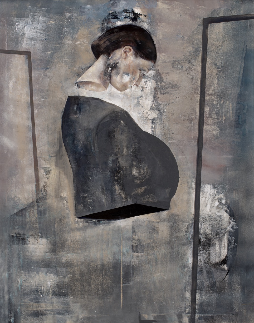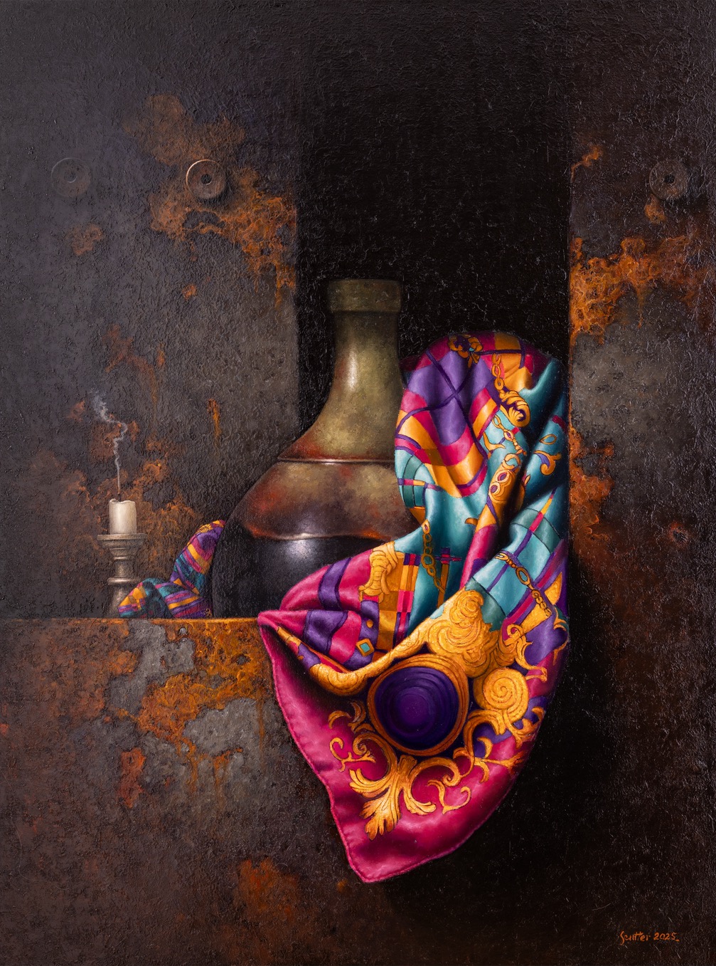 sygnowany p.d.: 'Szutter 2025' oraz opisany na odwrocie: 'EDWARD SZUTTER | MN. CCCIV z cyklu: POD POZOREM | CODZIENNOŚCI | OLEJ. 120 cm x 90 cm 2025 r.'