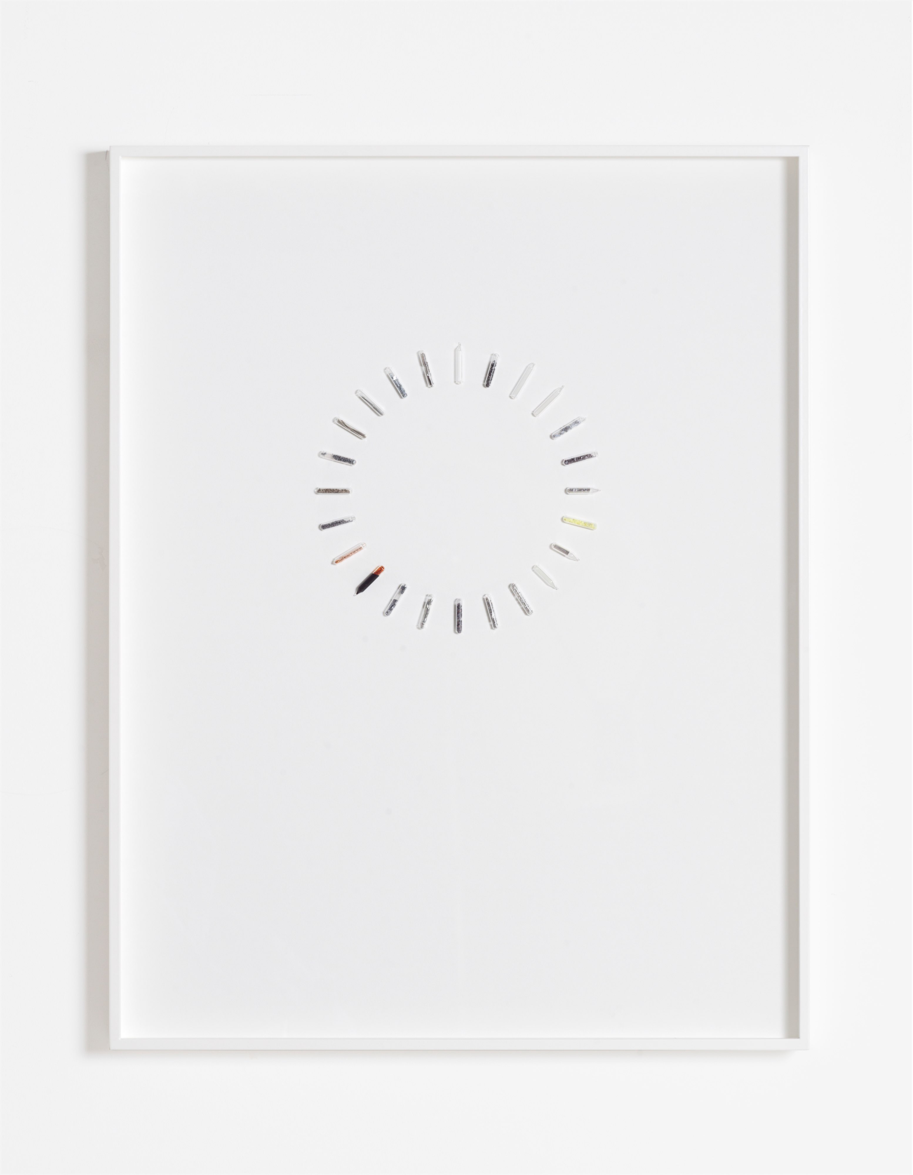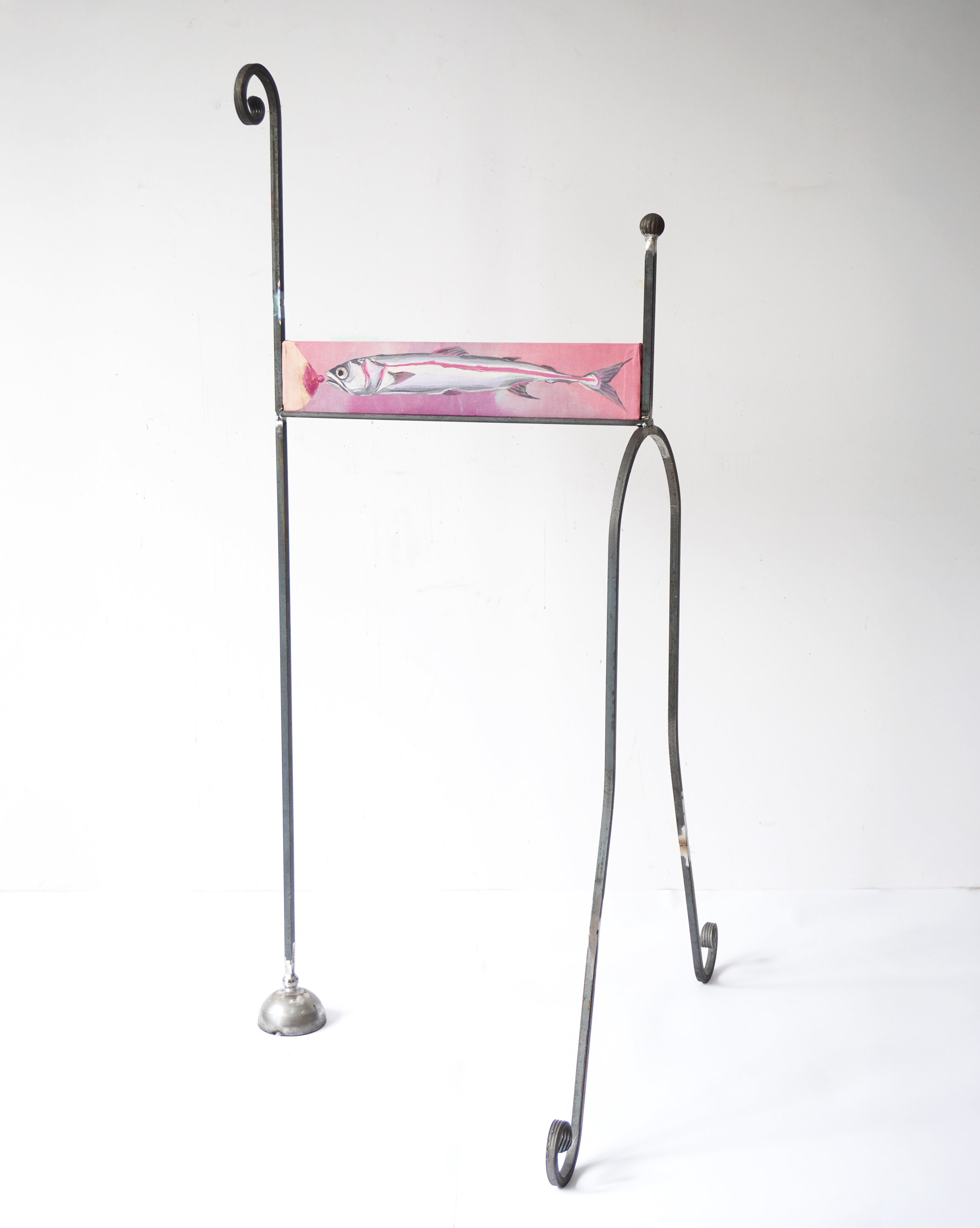 akryl na desce i barwionym płótnie, klej, lakier, stalowa konstrukcja, 53 x 134 x 76 cm