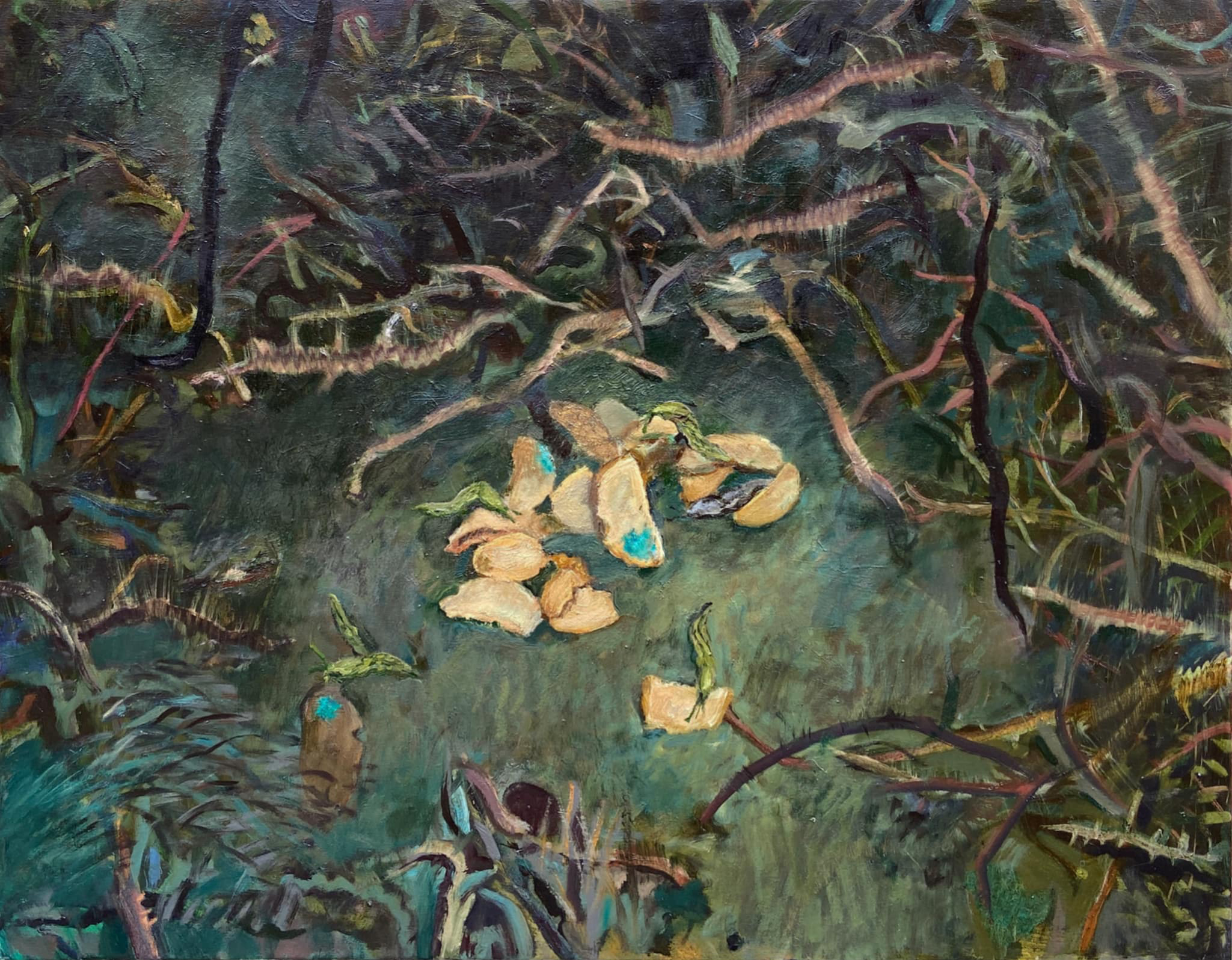 olej/płótno, 98 x 126 cm, sygnowany, datowany i opisany na odwrociu: '"Slugs eating bread" | 2024 | Kateryna Aliinyk'