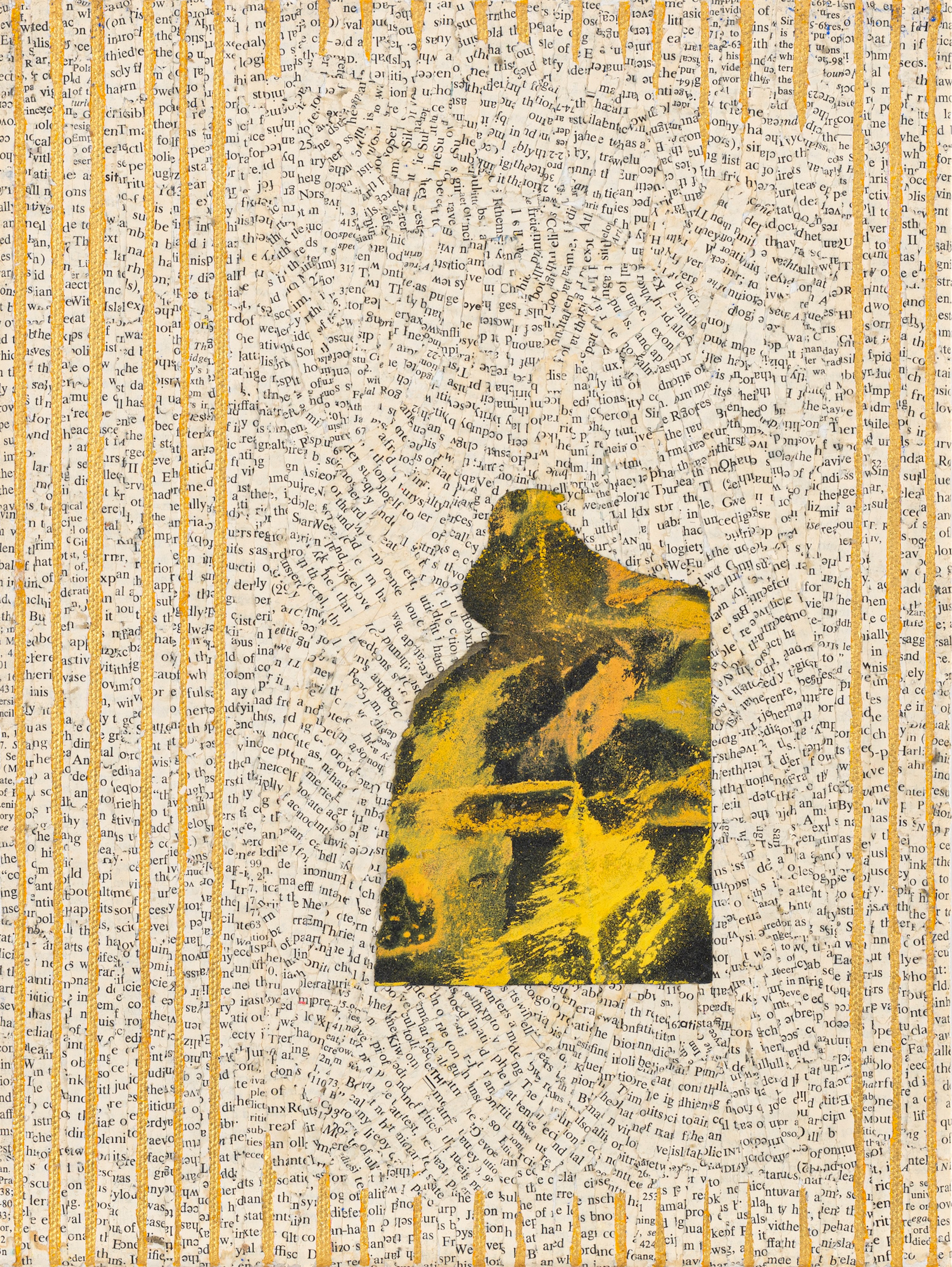akryl, papier ścierny, strona książki, złoto płatkowe/płótno, 30,5 x 23 cm, sygnowany, datowany i opisany na odwrociu: 'A. OSTOYA | P. A. C. I. I. H. & PSYCHOSYNTHESIS | 2019 | (5)'