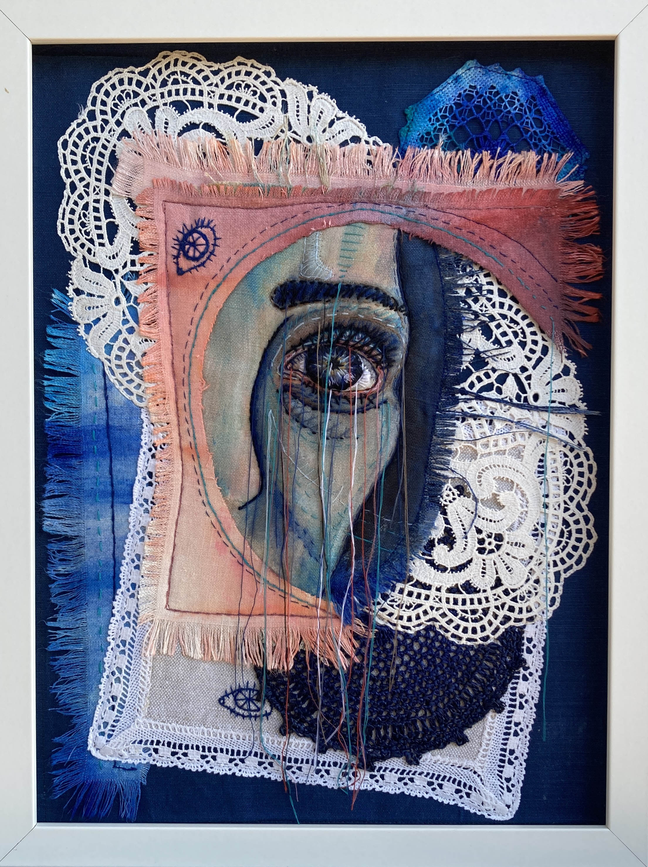 opbraz 3D patchworkowy uszyty z tkanin lnianych i koronek, malowany farbami do tkanin. Rysy twarzy i oko ręcznie haftowane bawełnianymi nićmi, wypchane miękkim puchem. Wymiary ramy: 42 x 32 cm,