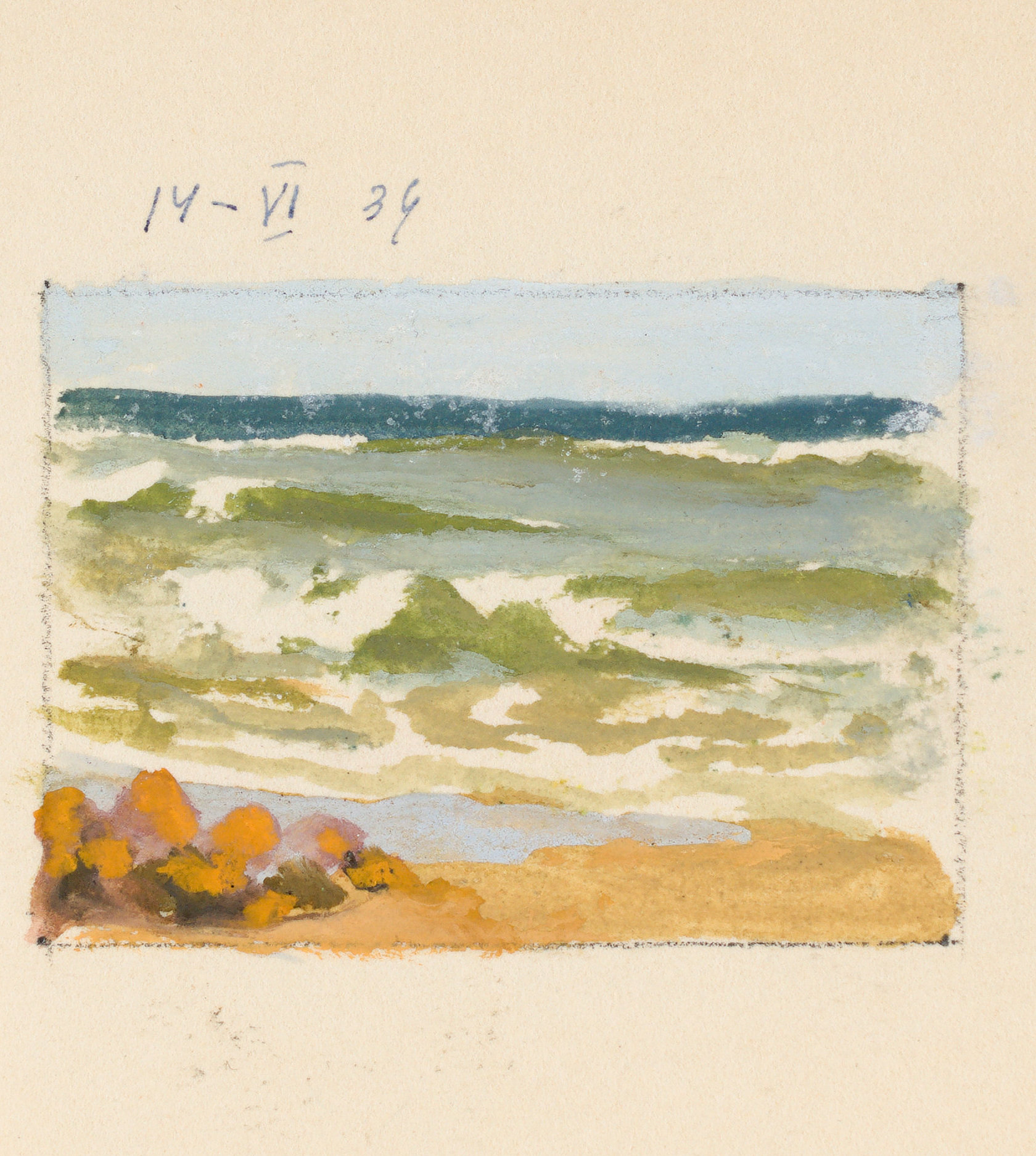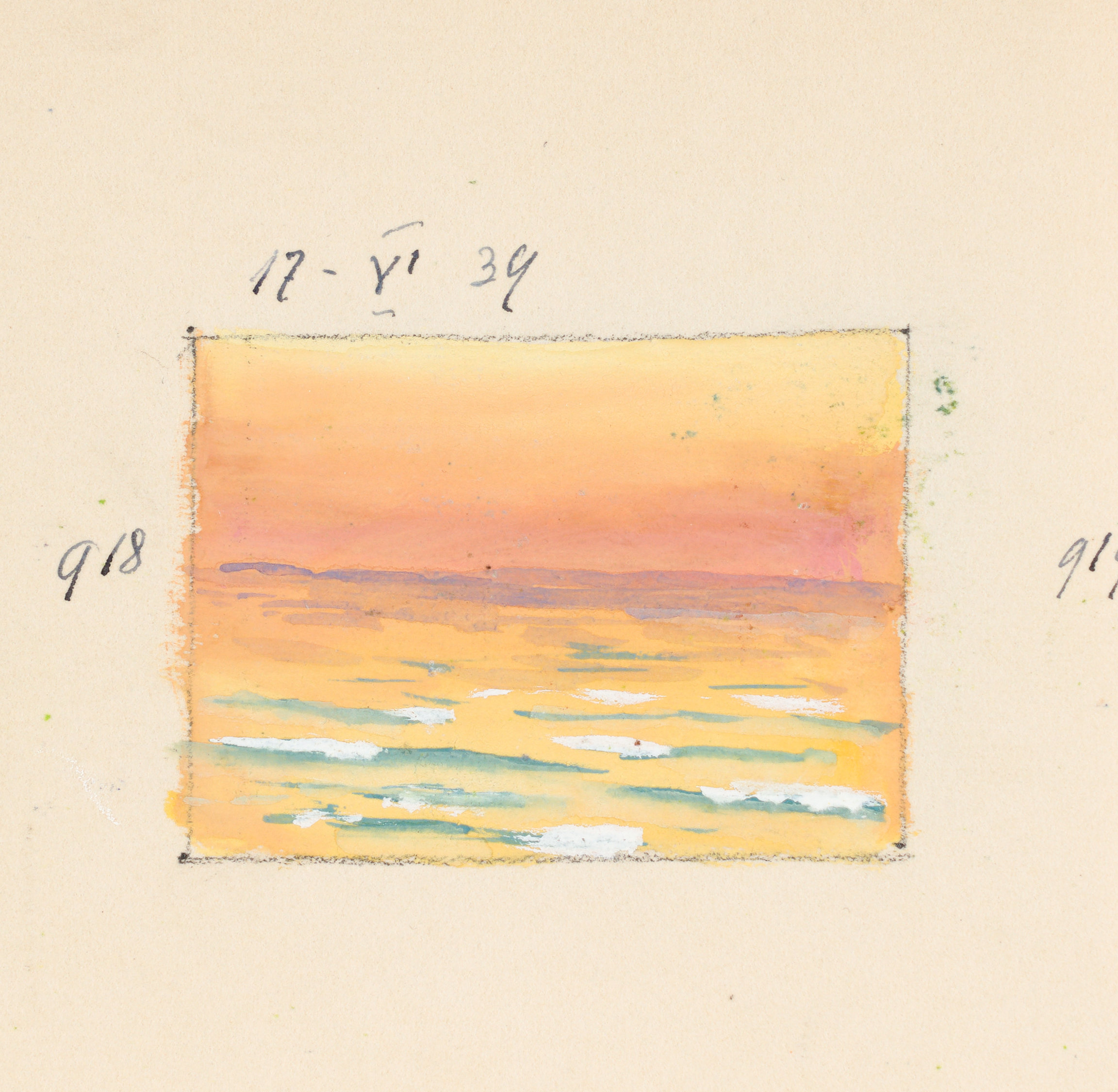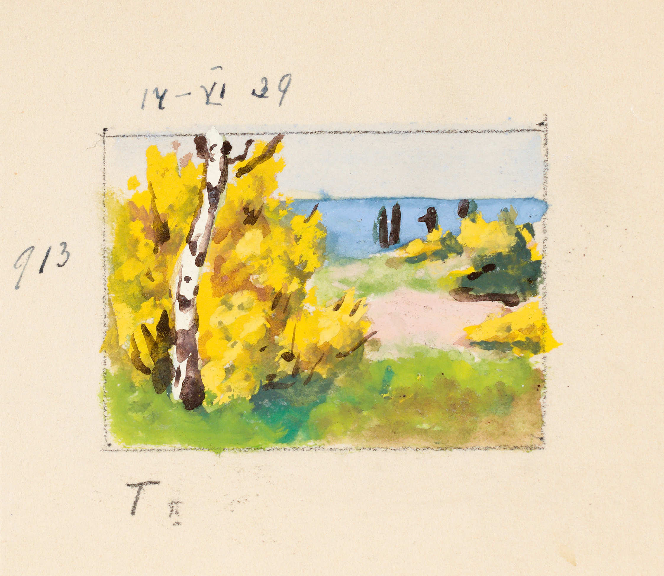 Na odwrocie rysunek: Brzeg morski, 1939 (4,9 x 6,8 cm) również opisany autorsko.