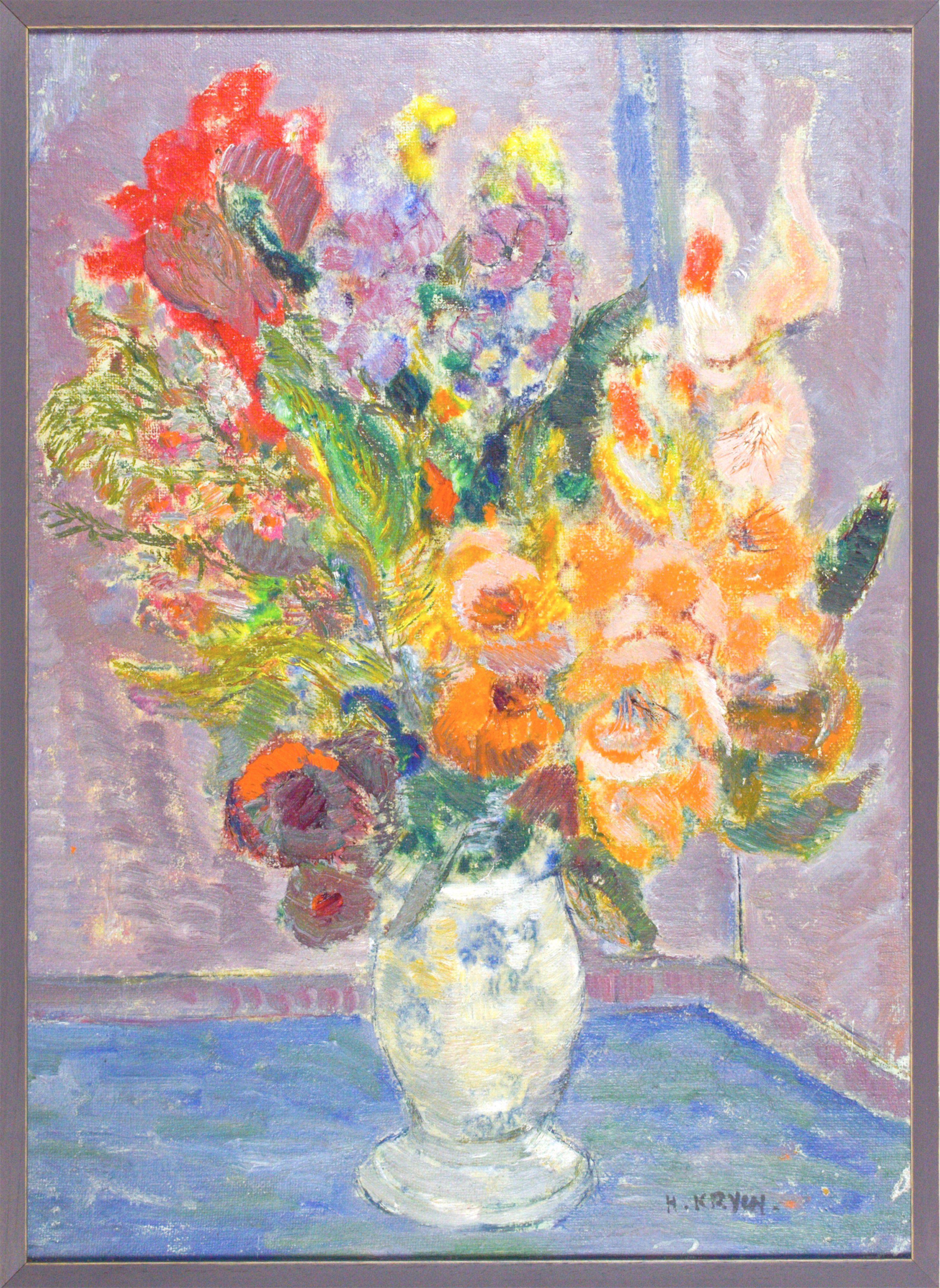 Na odwrocie na krośnie malarskim napis: „KWIATY”; poniżej na płótnie nr 29A; oraz na krośnie malarskim nalepka zakładu stolarskiego Benedykta Bączyka w Łodzi