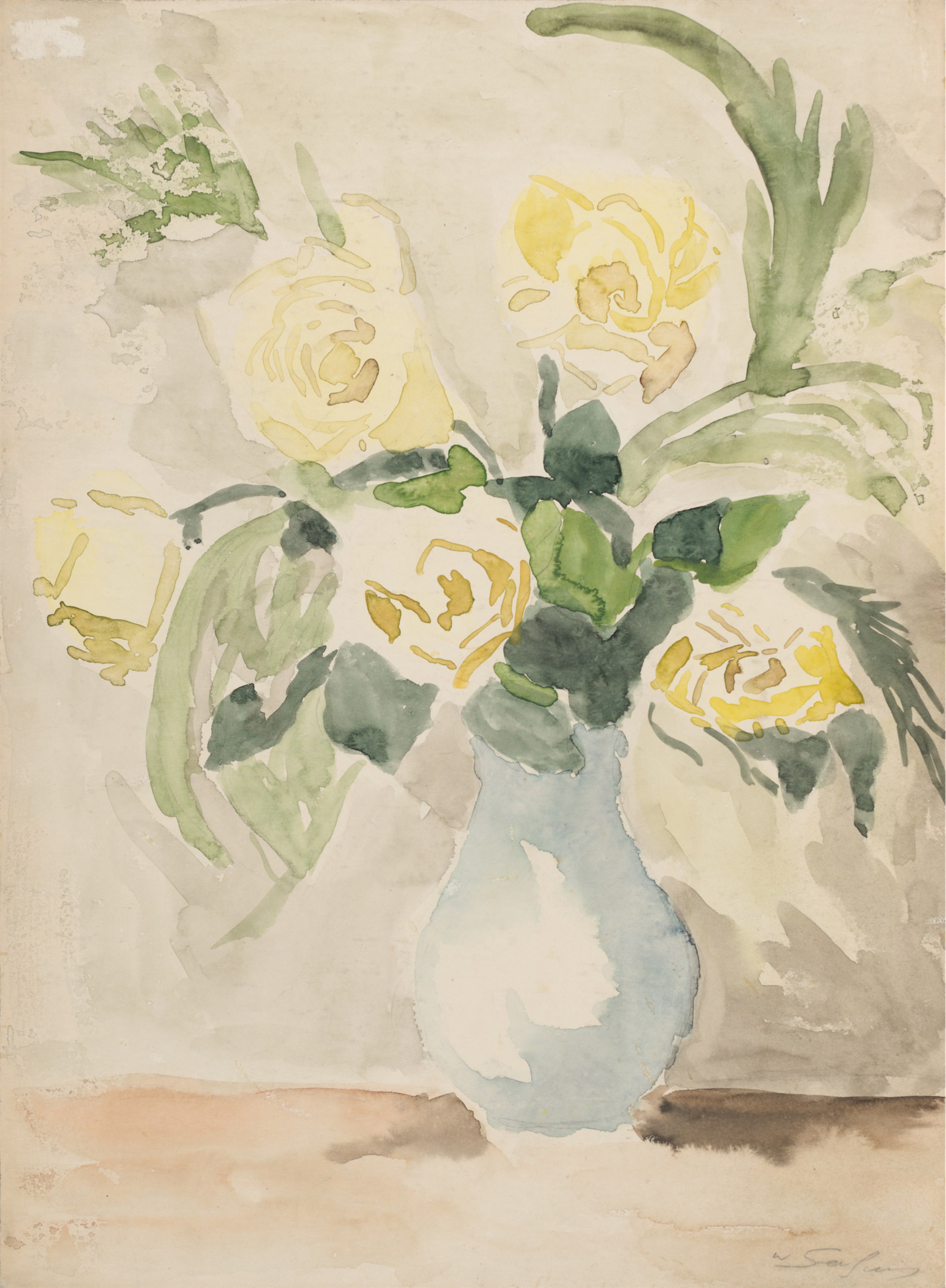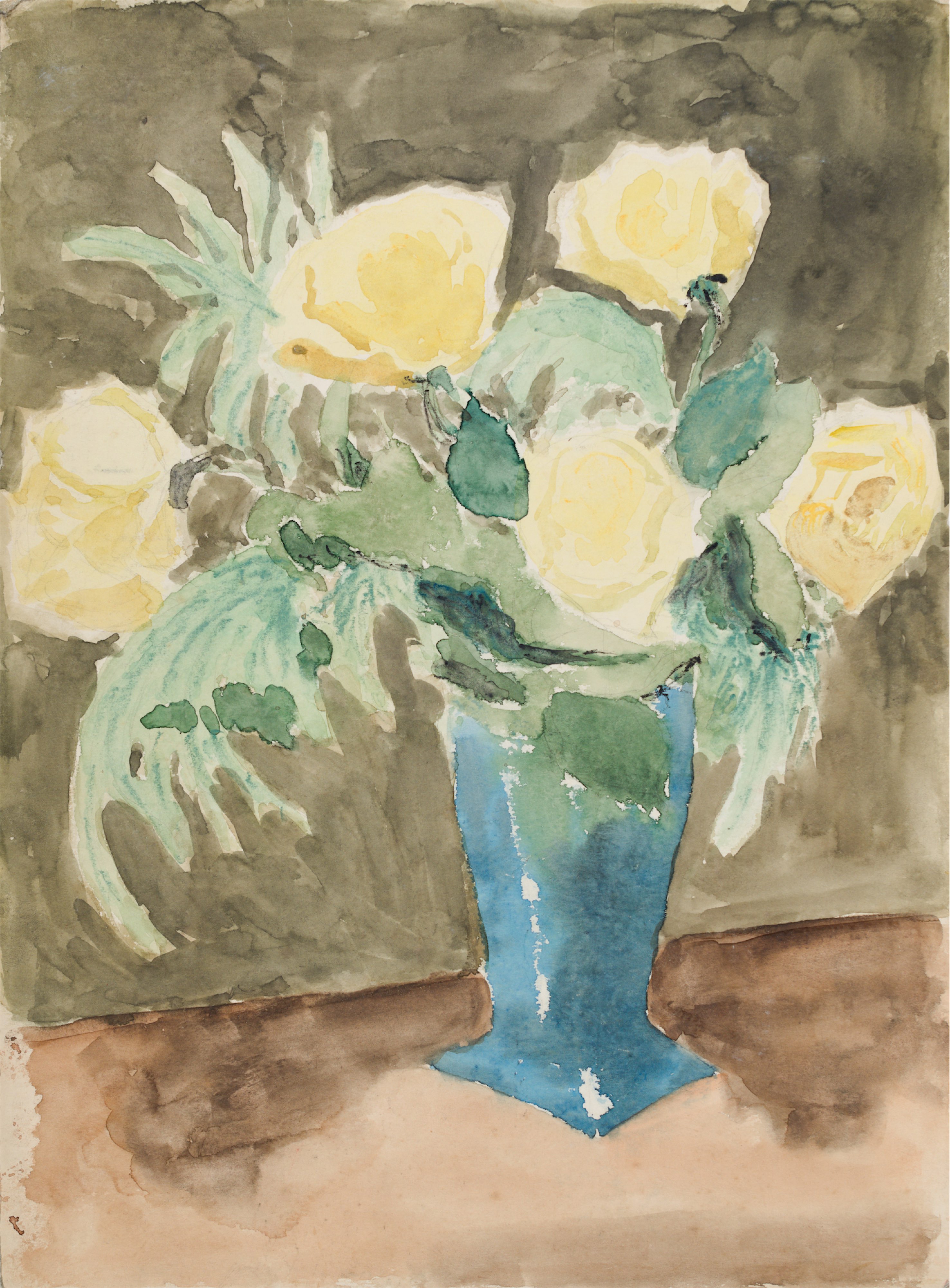 Na odwrocie Róże w niebieskim wazonie na ciemnym tle w technice akwarelowej.