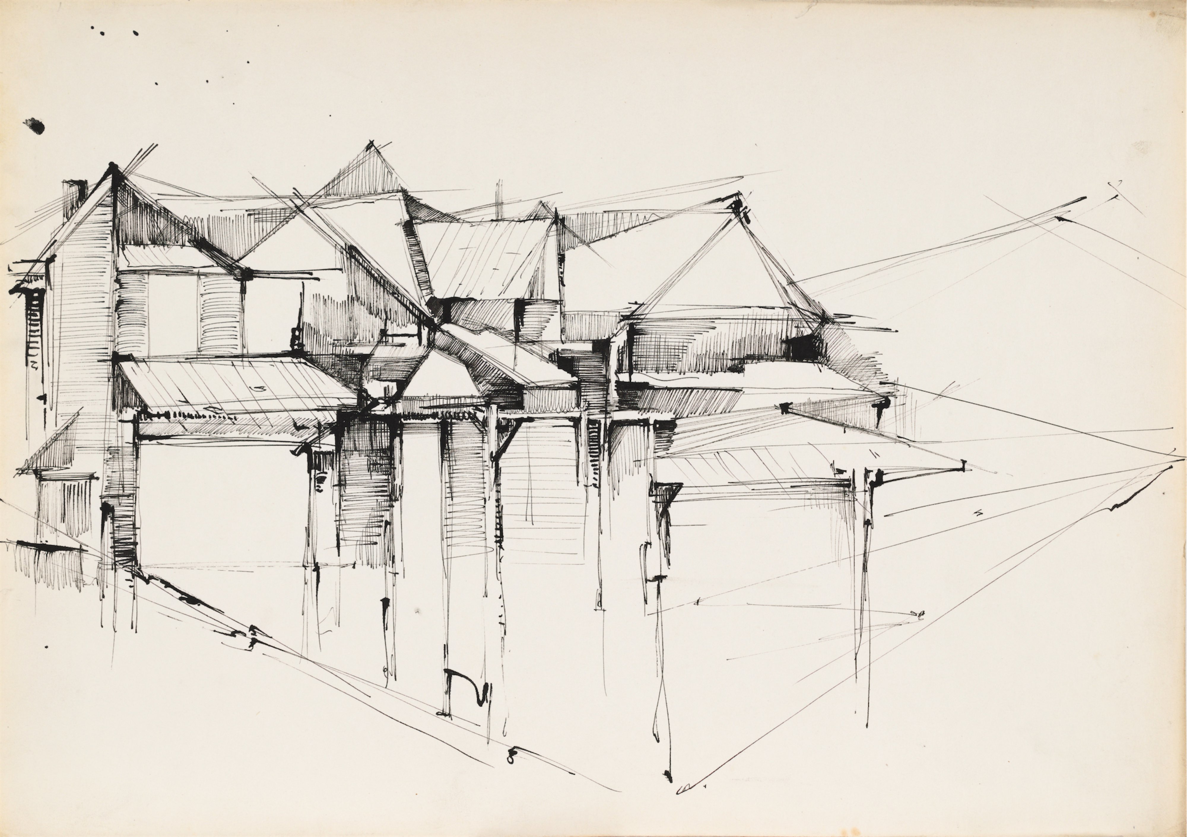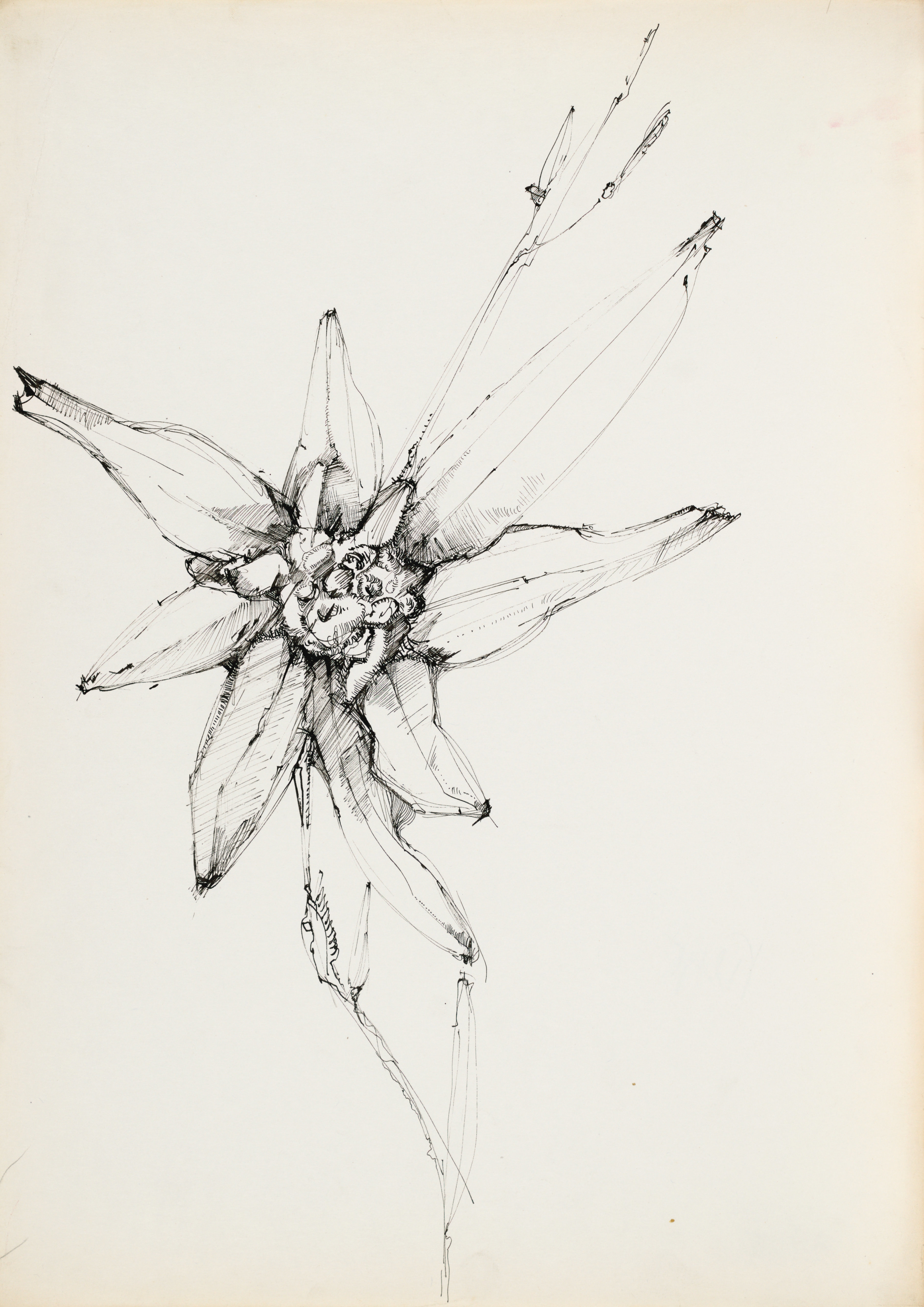 ołówek, piórko, atrament ciemnoniebieski, atrament lawowamny, 21 x 29,3 cm.